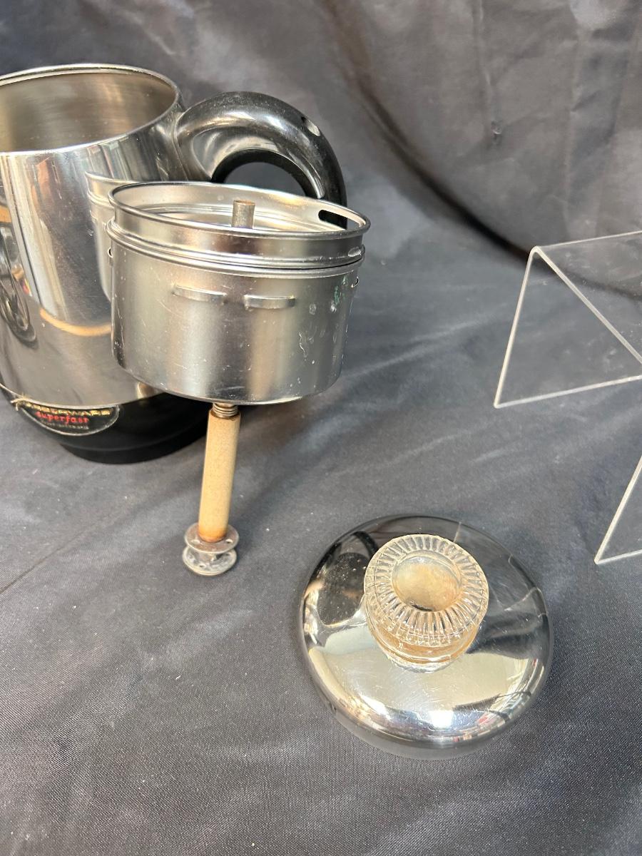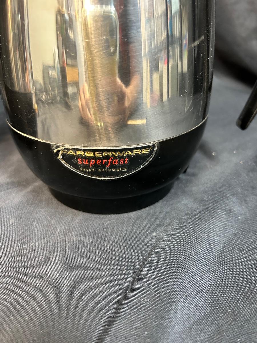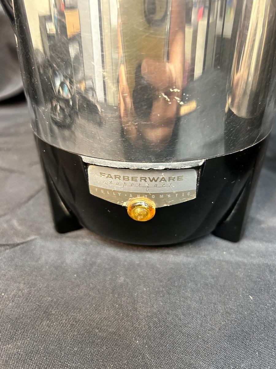 Pair of Vintage Midcentury Farberware Electric Coffee Pot Percolators. Both have cords. The taller one does not have filter basket piece for inside, not sure if you could switch between the two. All pieces are in good looking condition. Untested.
