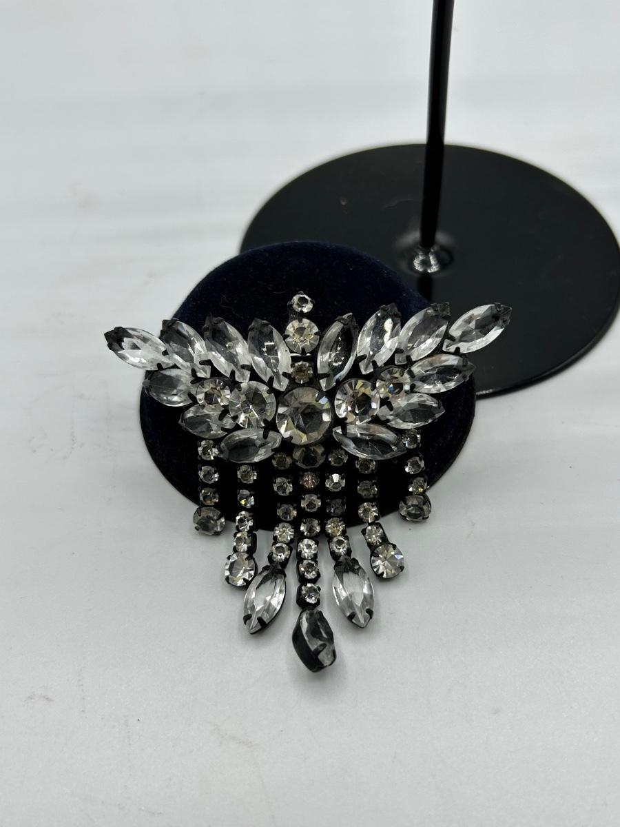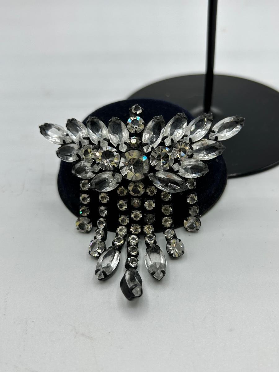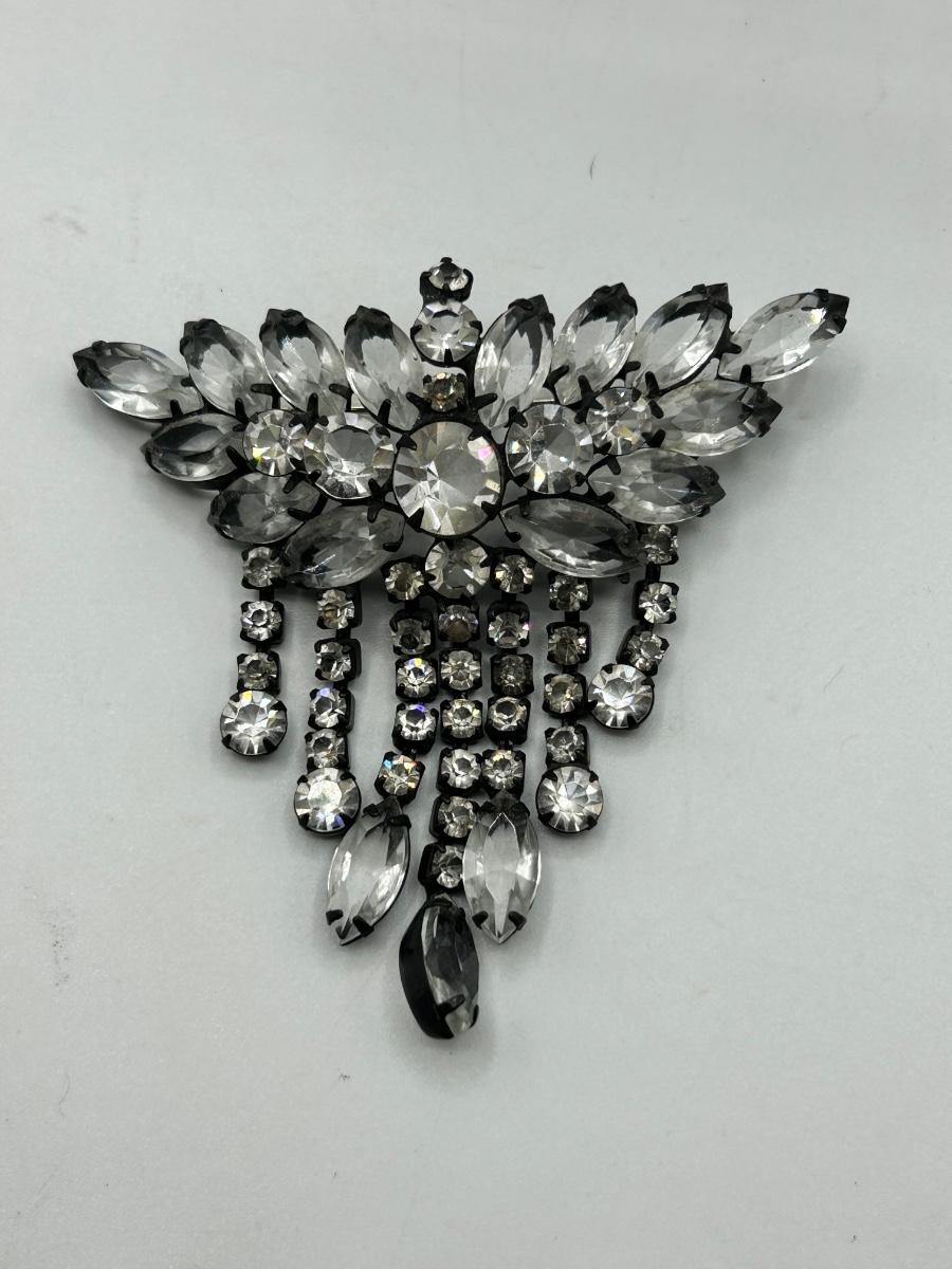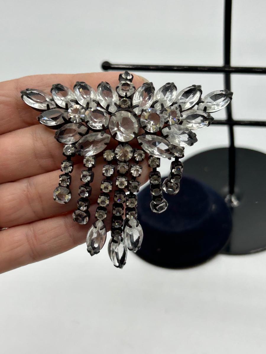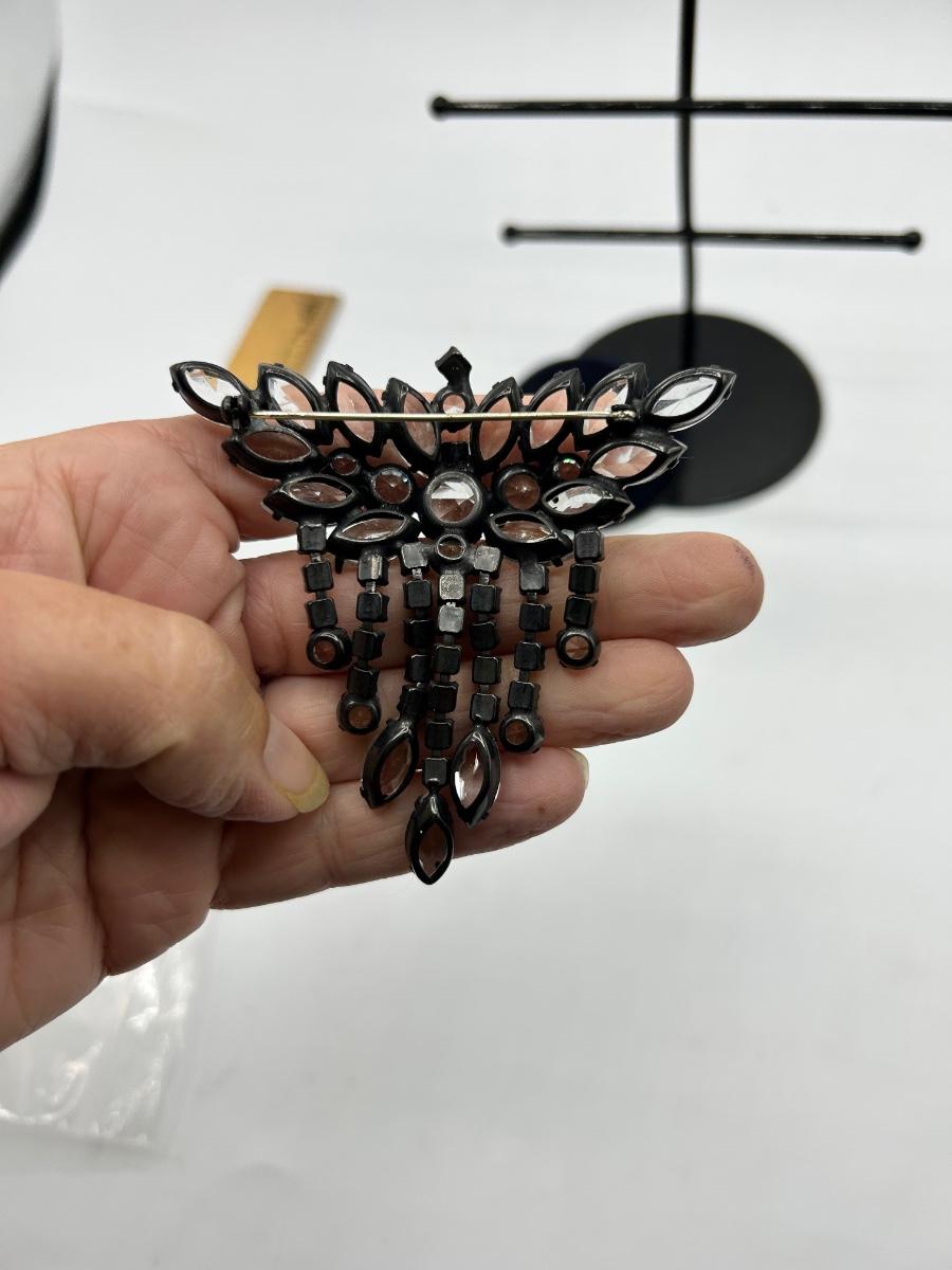 Large 3" Clear Rhinestone in Black Metal Setting Dangling Statement Pin Brooch. In good condition.