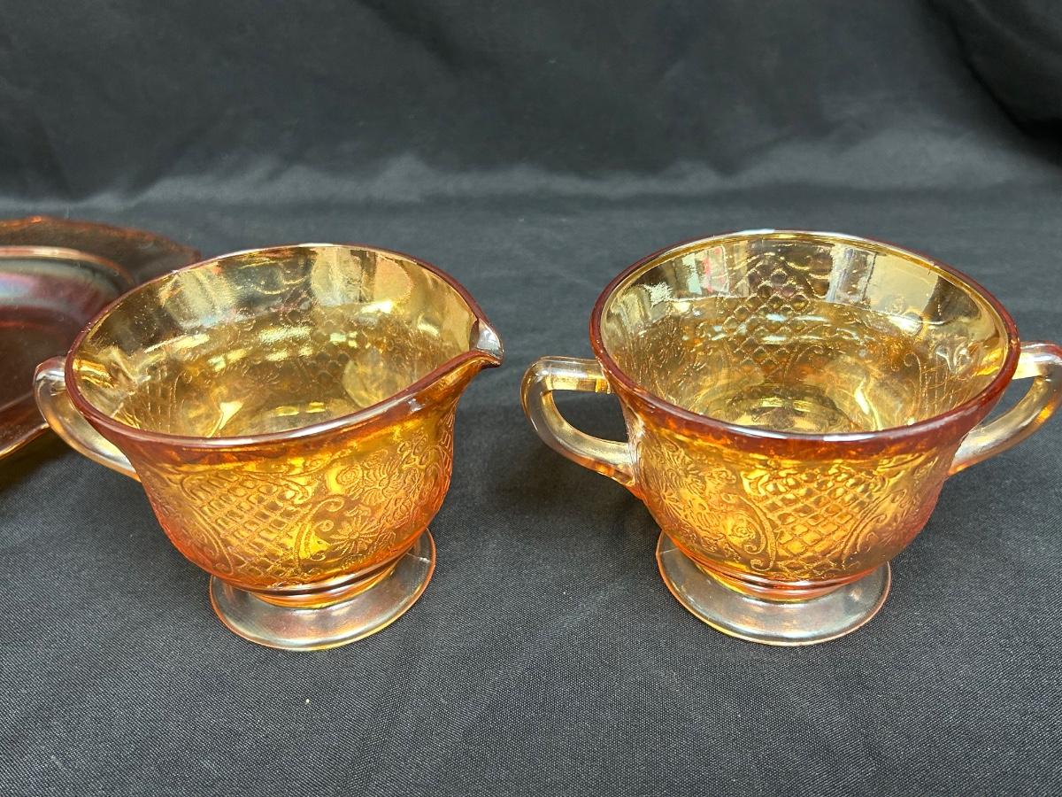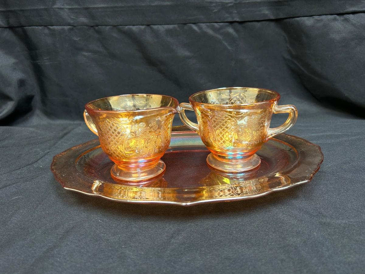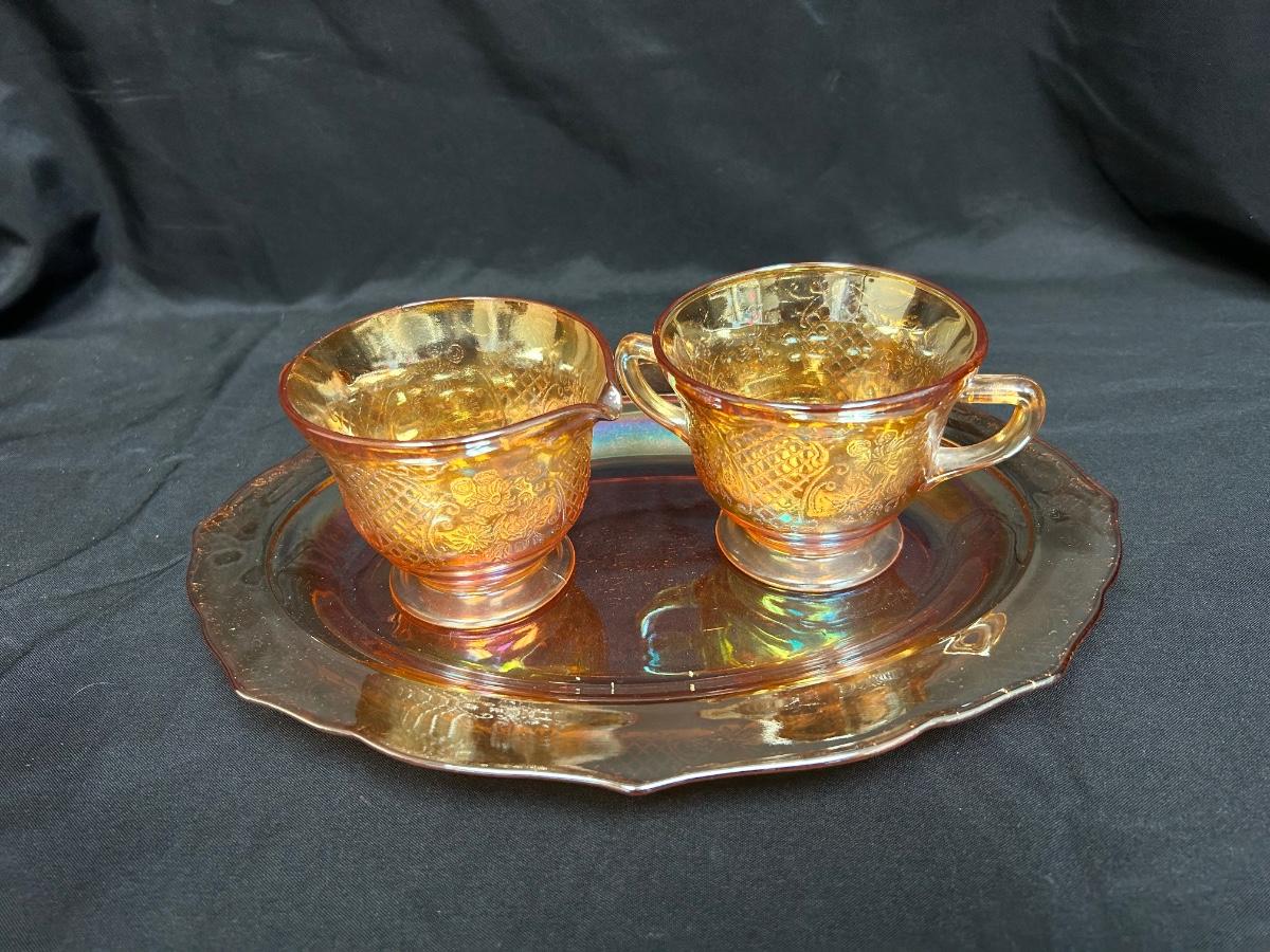 Vintage Iridescent Marigold Carnival Glass Cream and Sugar with Tray Normandie by Federal Glass