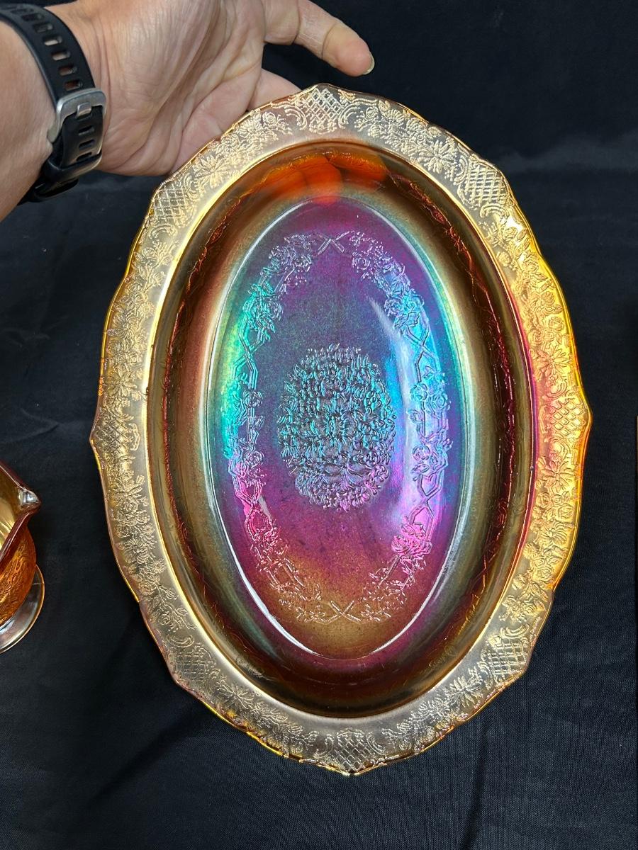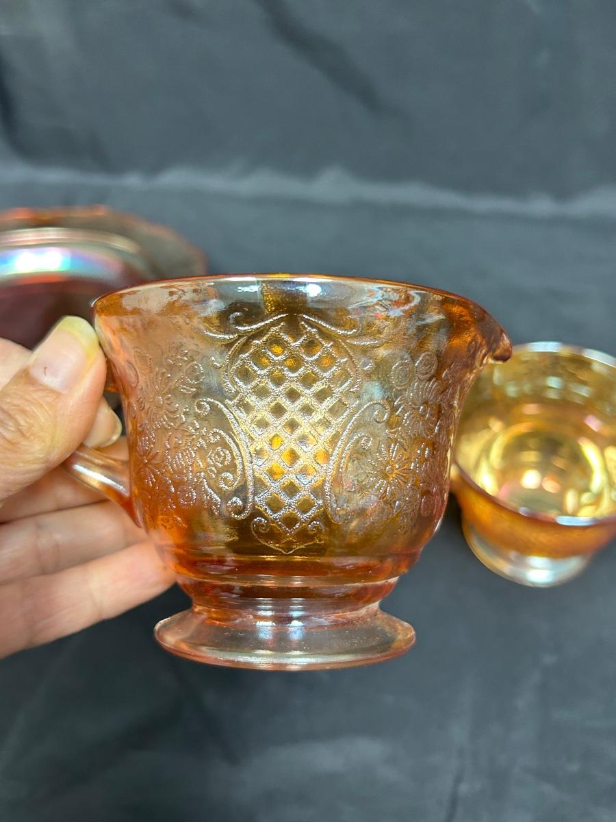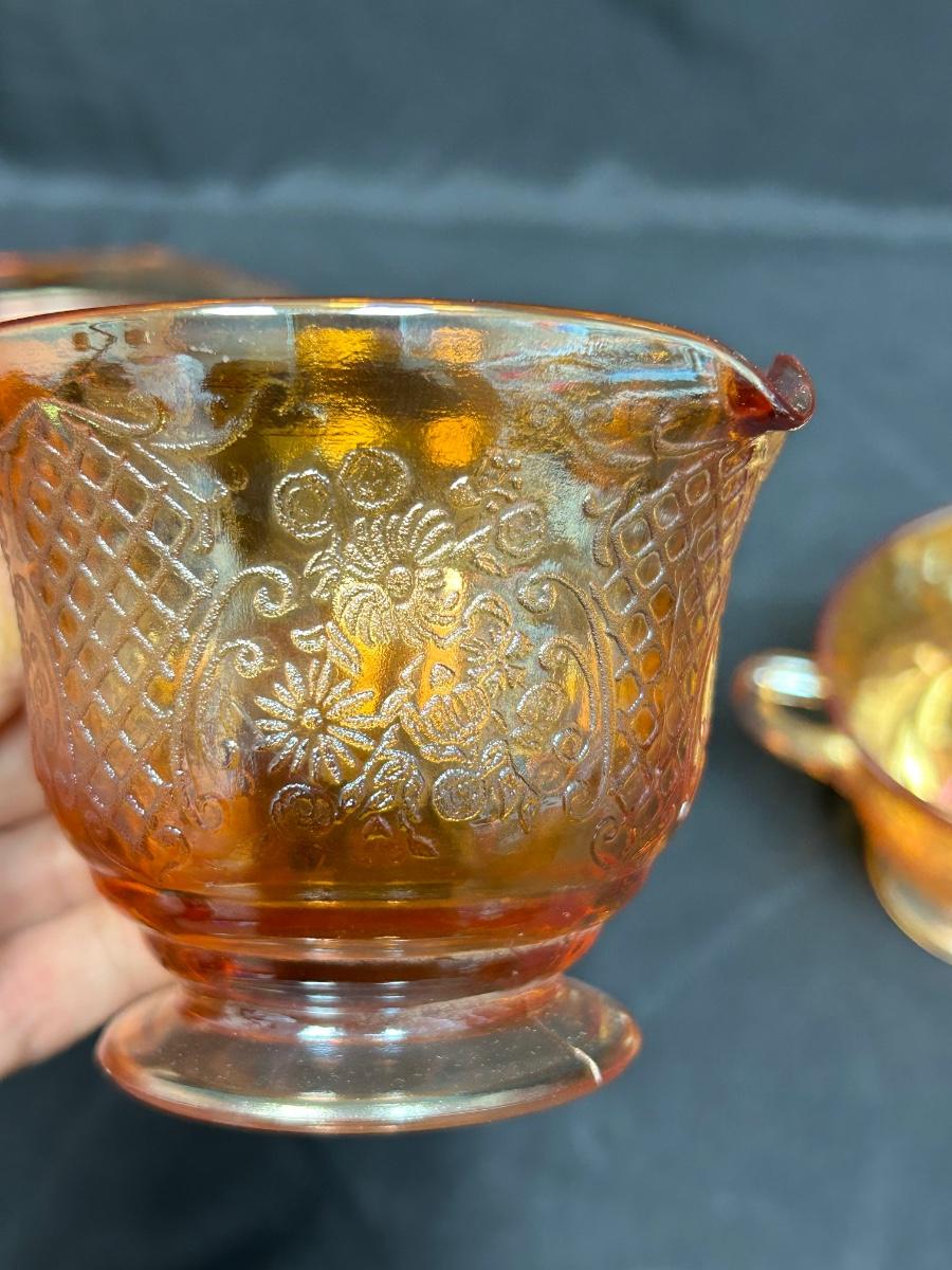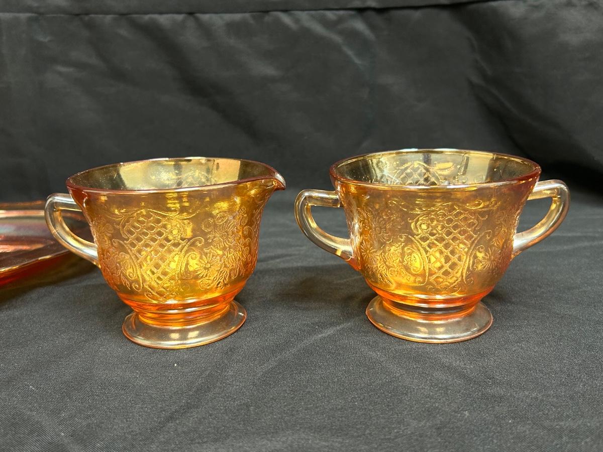 Vintage Iridescent Marigold Carnival Glass Cream and Sugar with Tray Normandie by Federal Glass