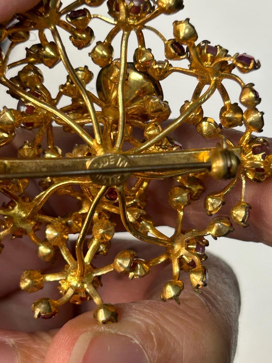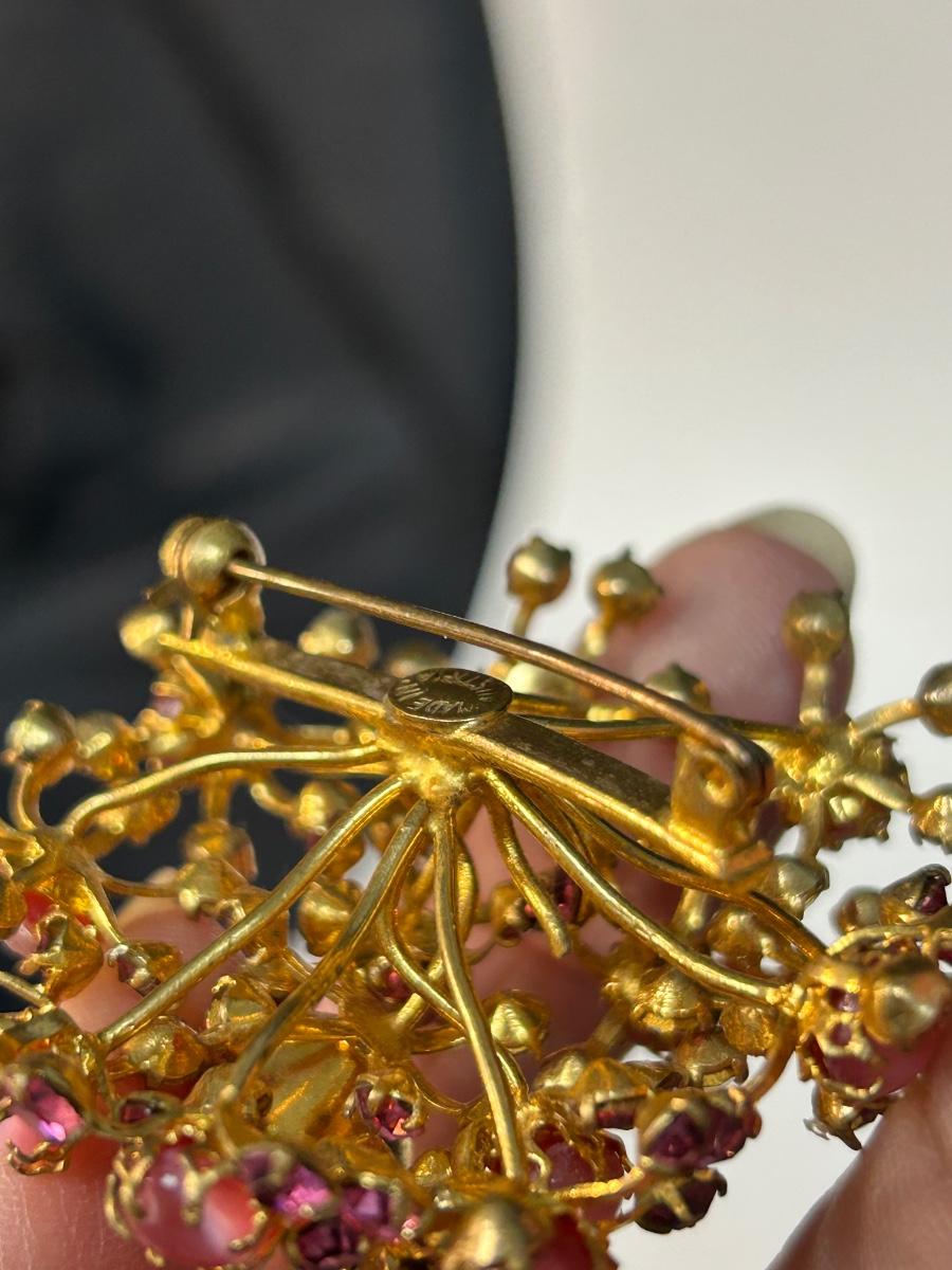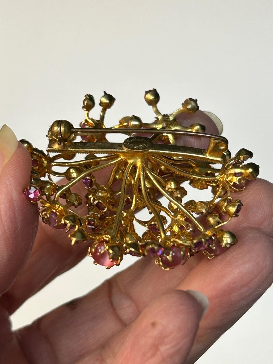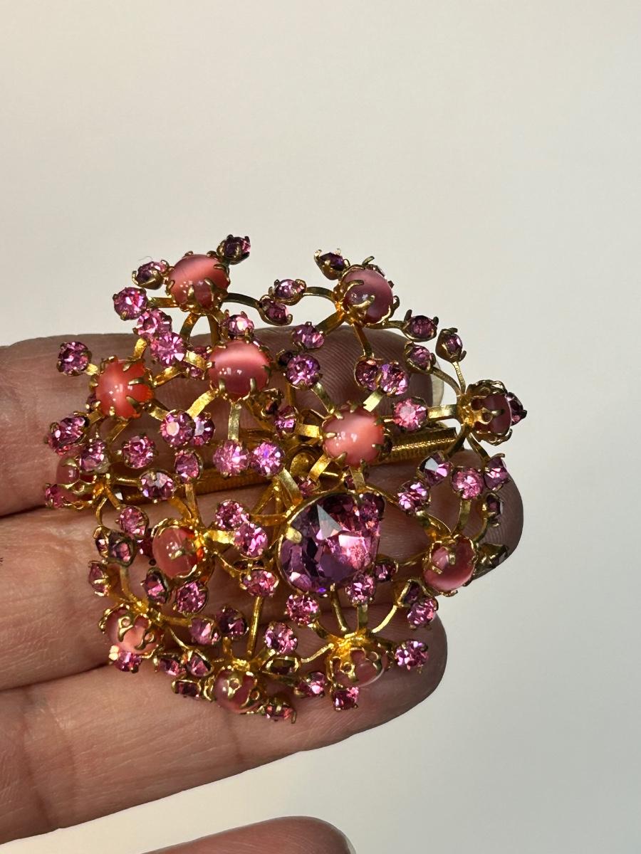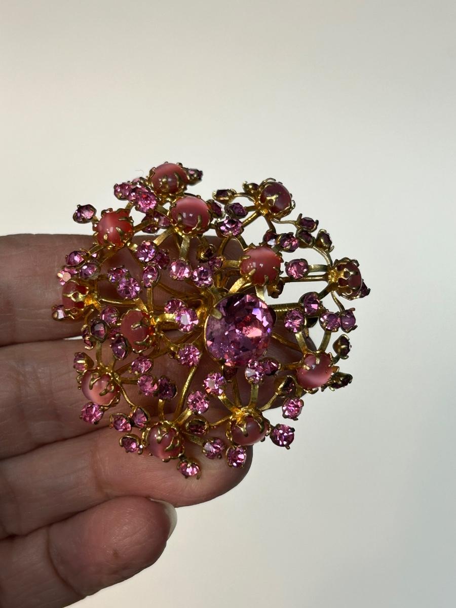 Vintage Pink Rhinestone & Cabochon Pin Brooch with Shiny Gold Tone Setting Austria. Beautiful pink color. Interesting cluster style pin. There is a broken piece, but it does not affect the pin in wearing.