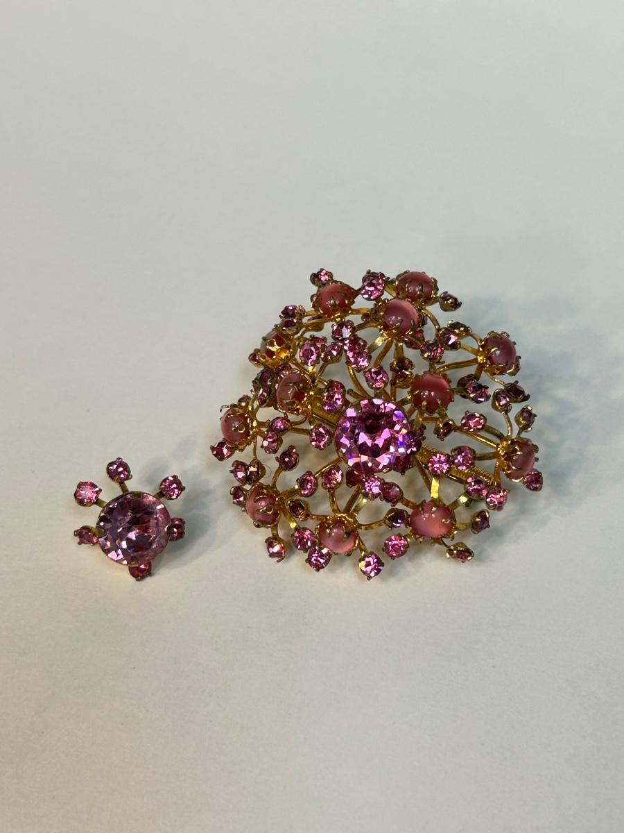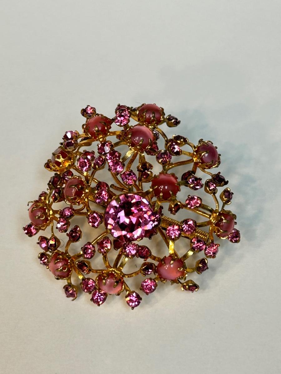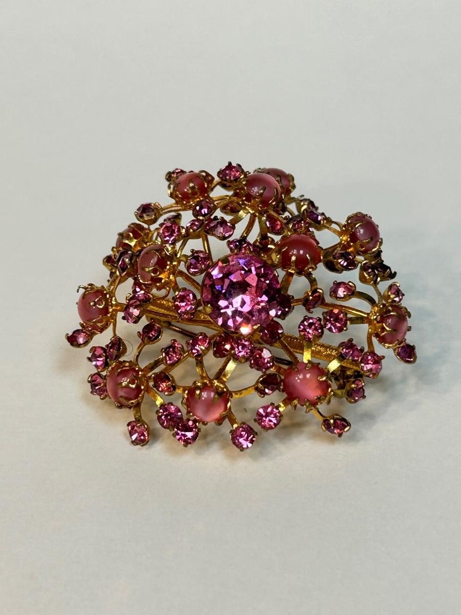 Vintage Costume Fashion Pink Rhinestone & Cabochon Pin Brooch with Shiny Gold Tone Setting Austria