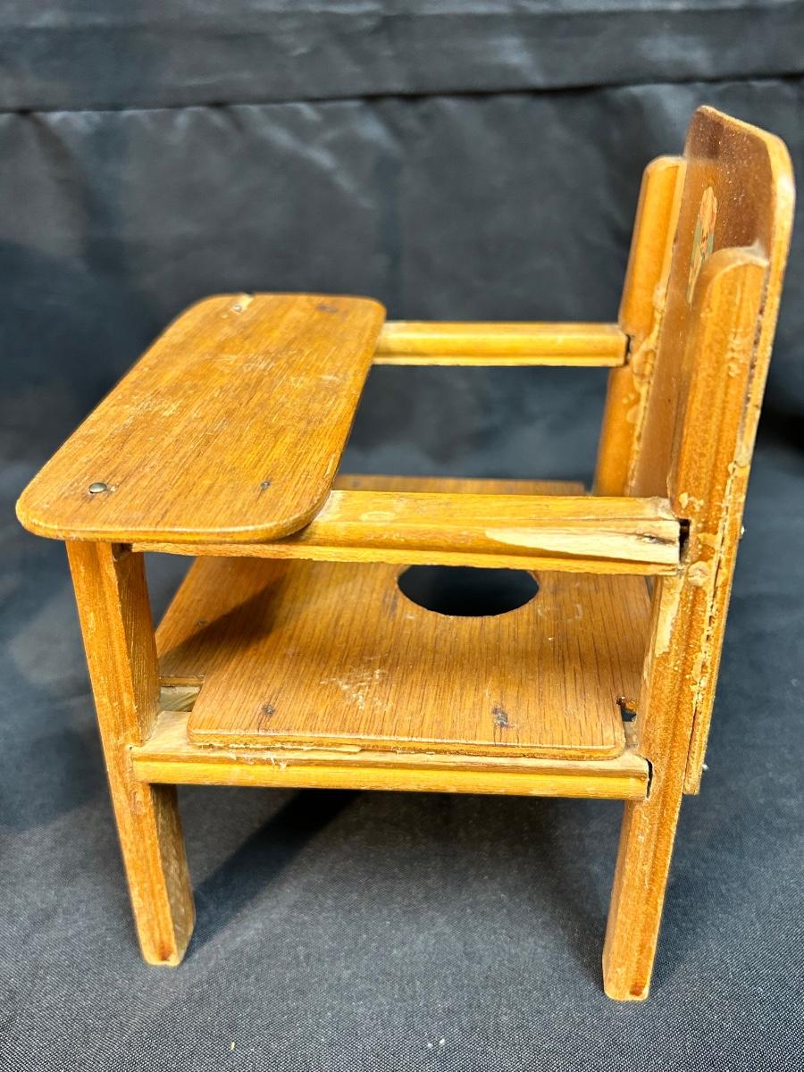 Pair of Vintage Wood Doll Furniture Chair & Highchair Imagination Play or Display. In vintage played with condition. Some signs of age and wear. Highchair shows age more than the chair.
