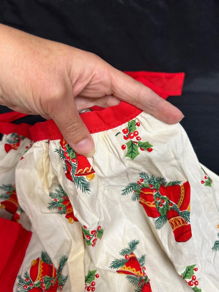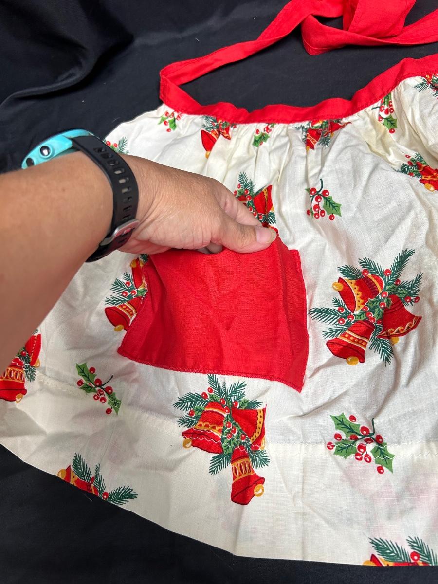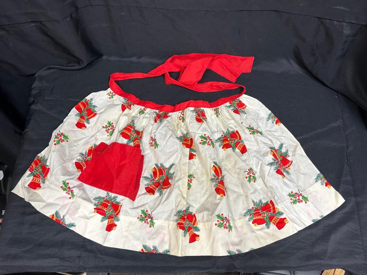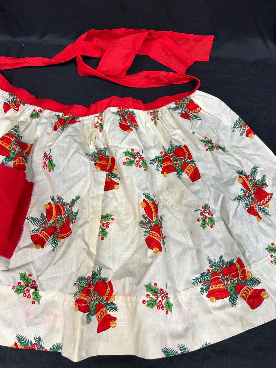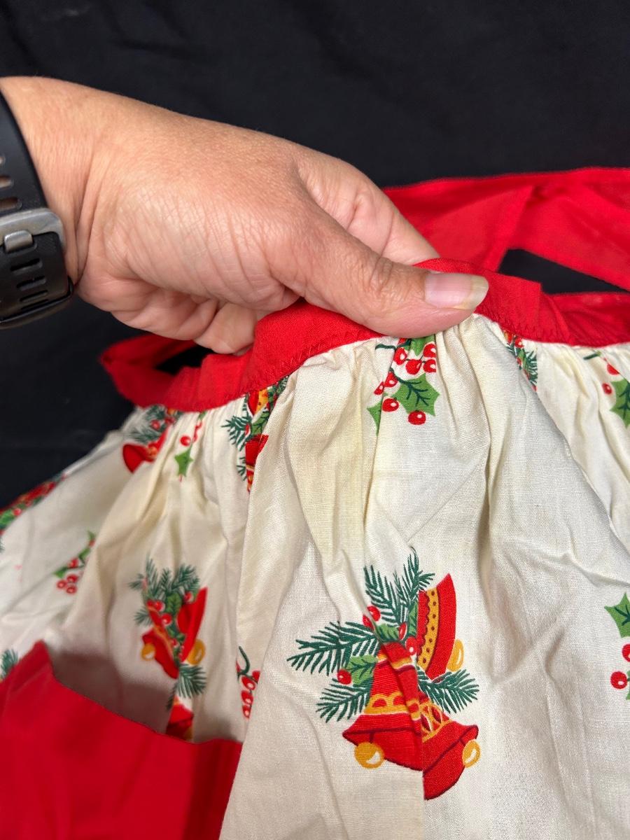 Vintage Christmas Holiday Holly and Bells Half Apron Tie Waist with Pocket. In previously used vintage condition. Some spots and discoloration.