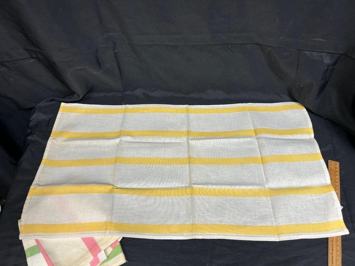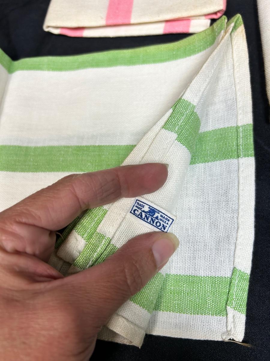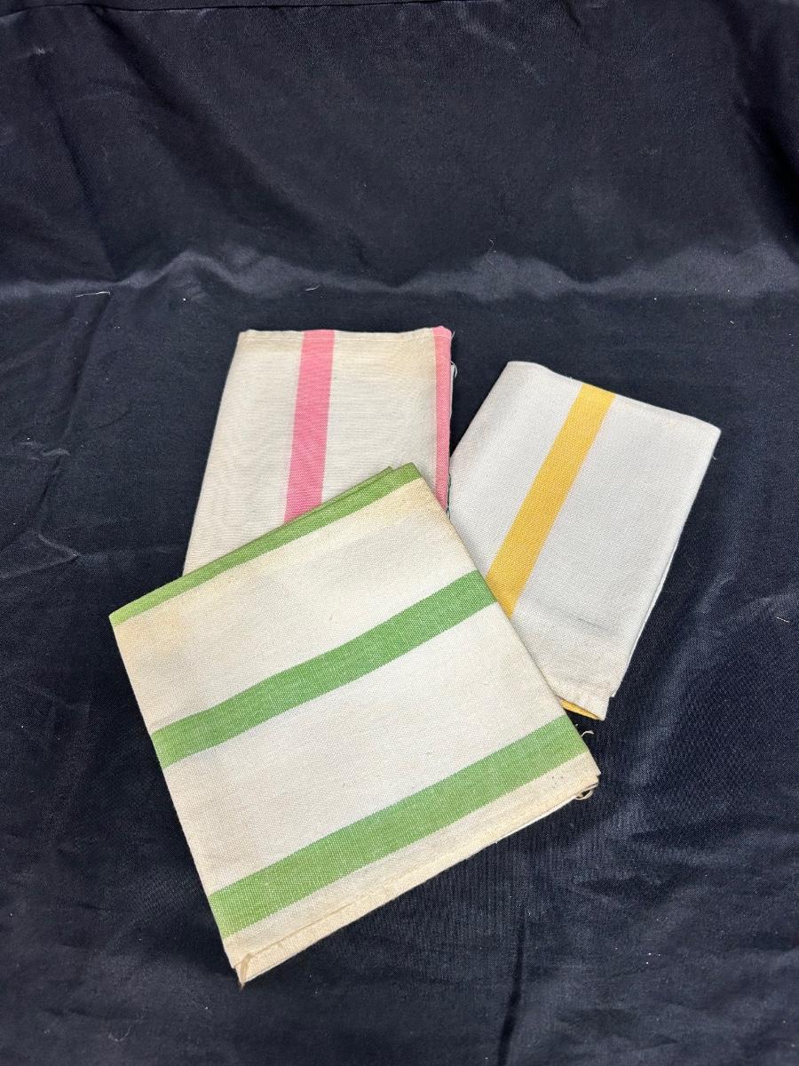 Set of Three Pastel Color Stripe Dish Tea Towels Yellow Green Pink. In good used condition. The only discolorations are at the fold creases mainly from years of storage. Made by Cannon.