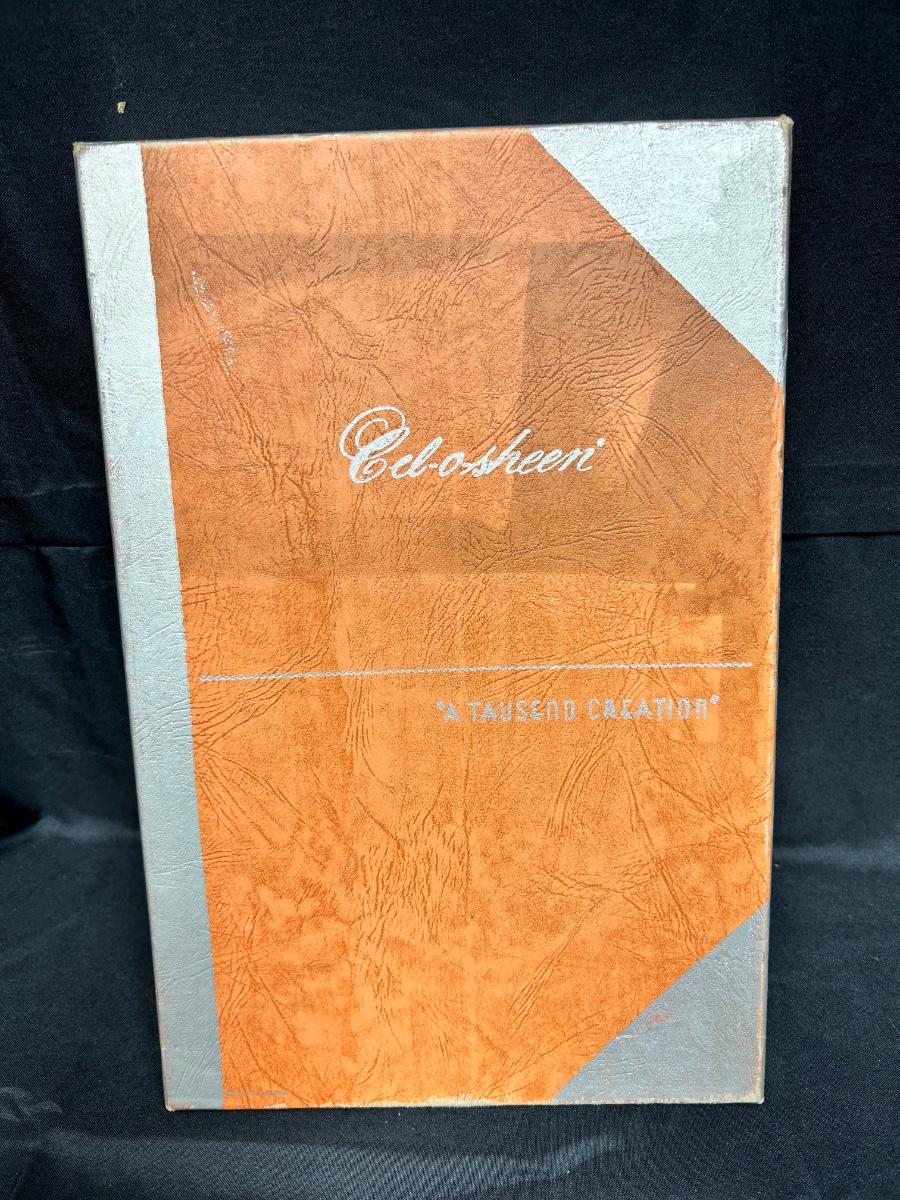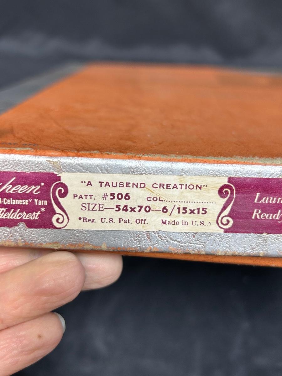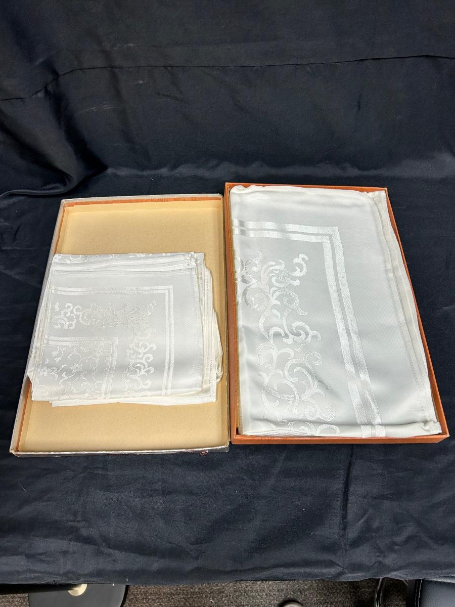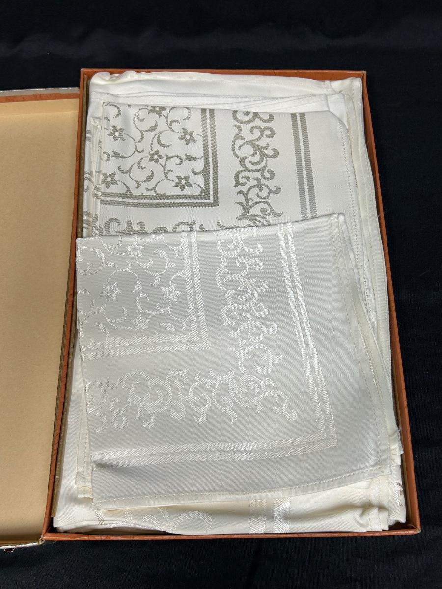 Vintage Cel-o-sheen A Tausend Creation Tablecloth and Dinner Napkin Set White by Fieldcrest. In good condition, original box. Tablecloth is 54x70, napkins are 15x15.