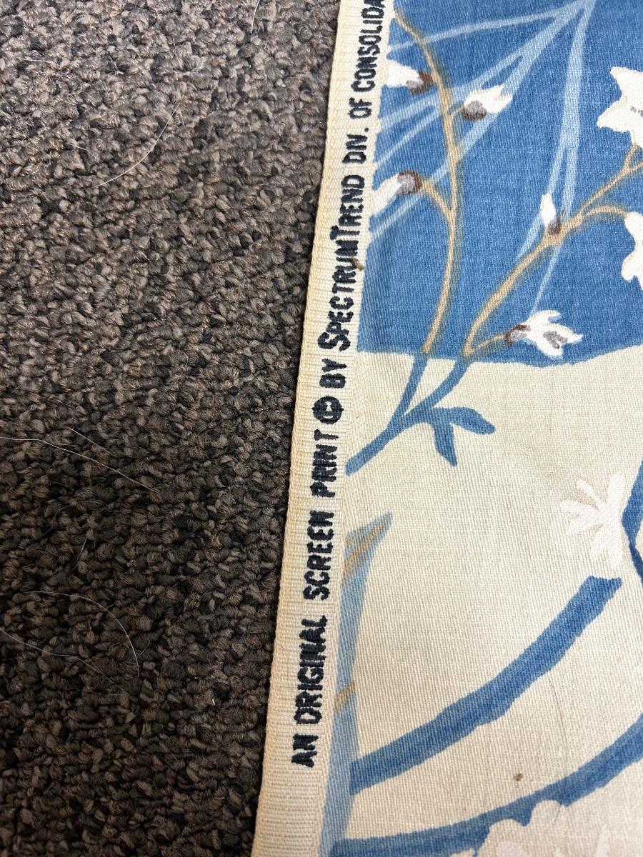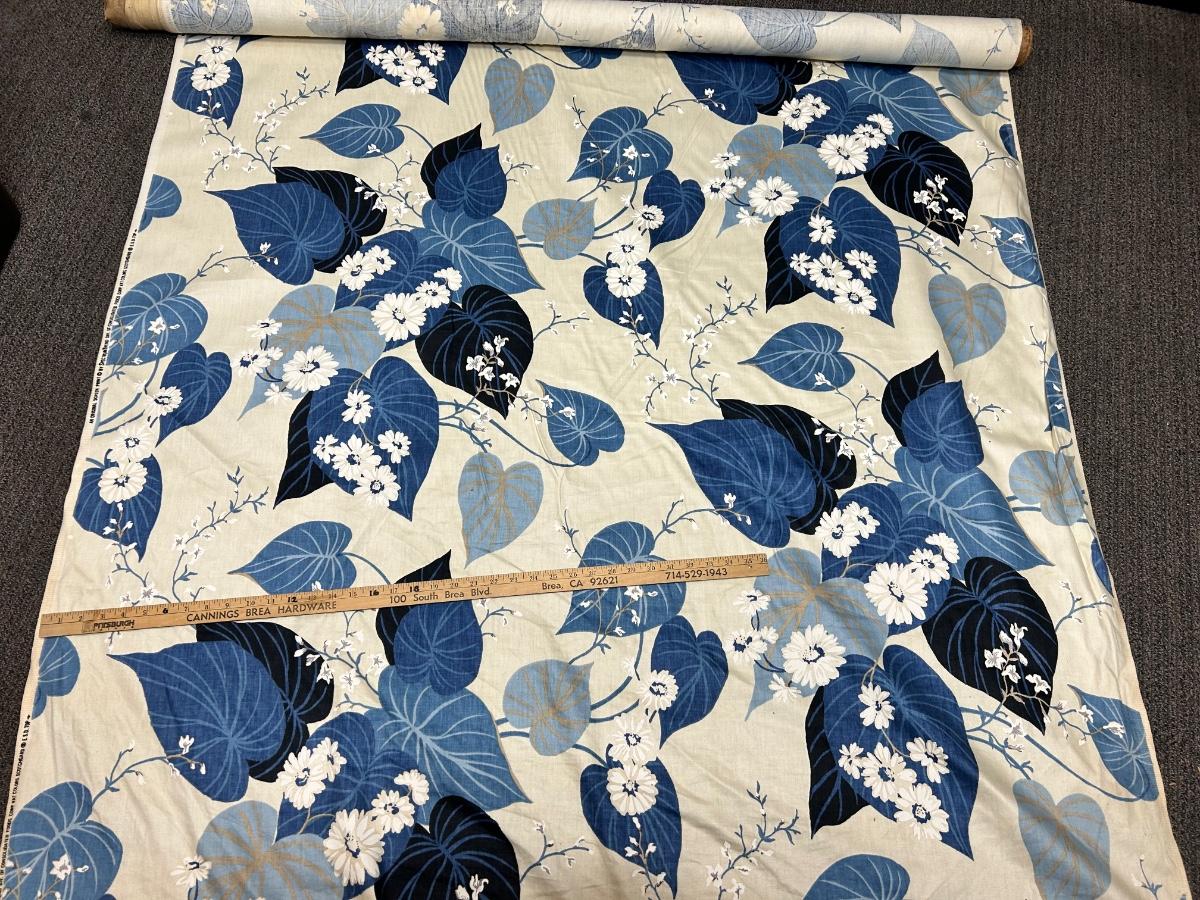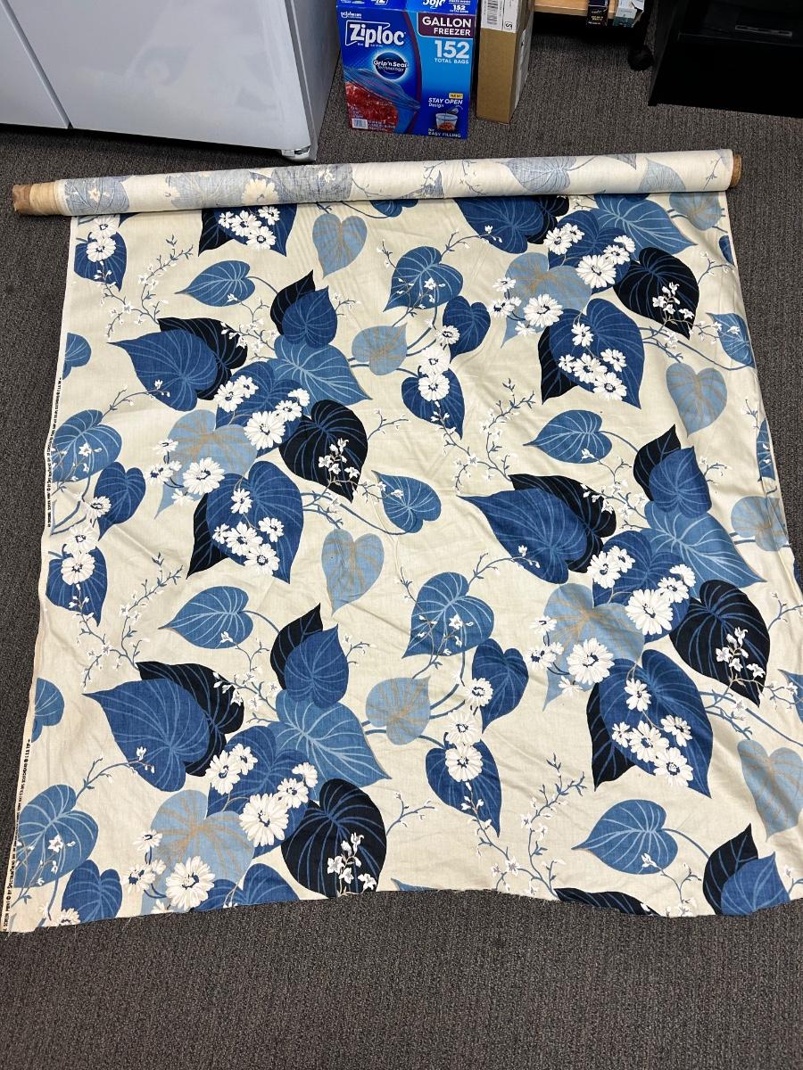 On the Roll Blue and White Floral Screen Printed Fabric. Looks like a decent amount is left on roll. Some discolor along edge from age and storage. About 4' wide. Sturdy fabric, good for upholstery projects, curtains, and more.