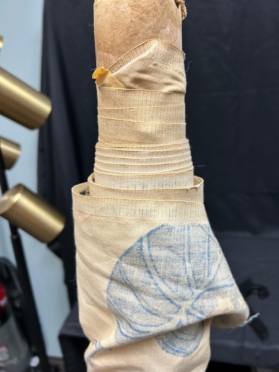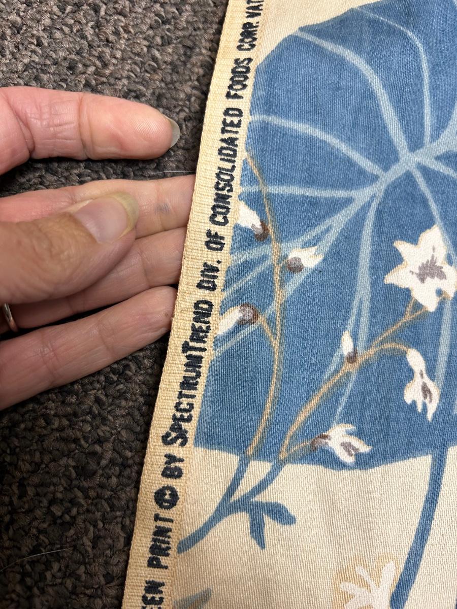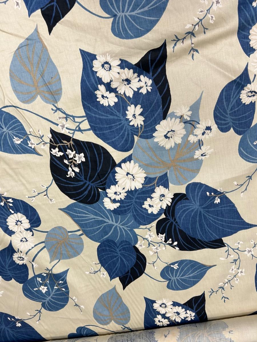 On the Roll Blue and White Floral Screen Printed Fabric. Looks like a decent amount is left on roll. Some discolor along edge from age and storage. About 4' wide. Sturdy fabric, good for upholstery projects, curtains, and more.