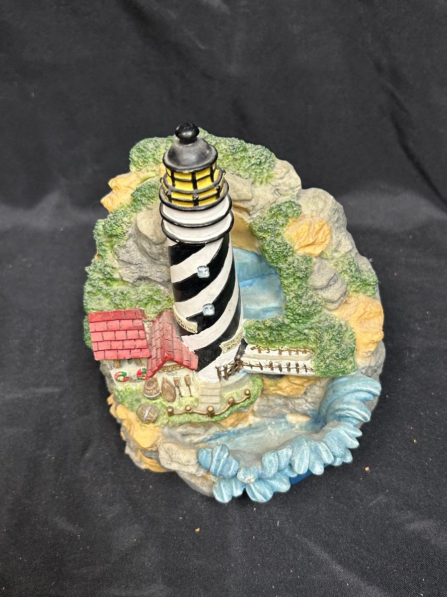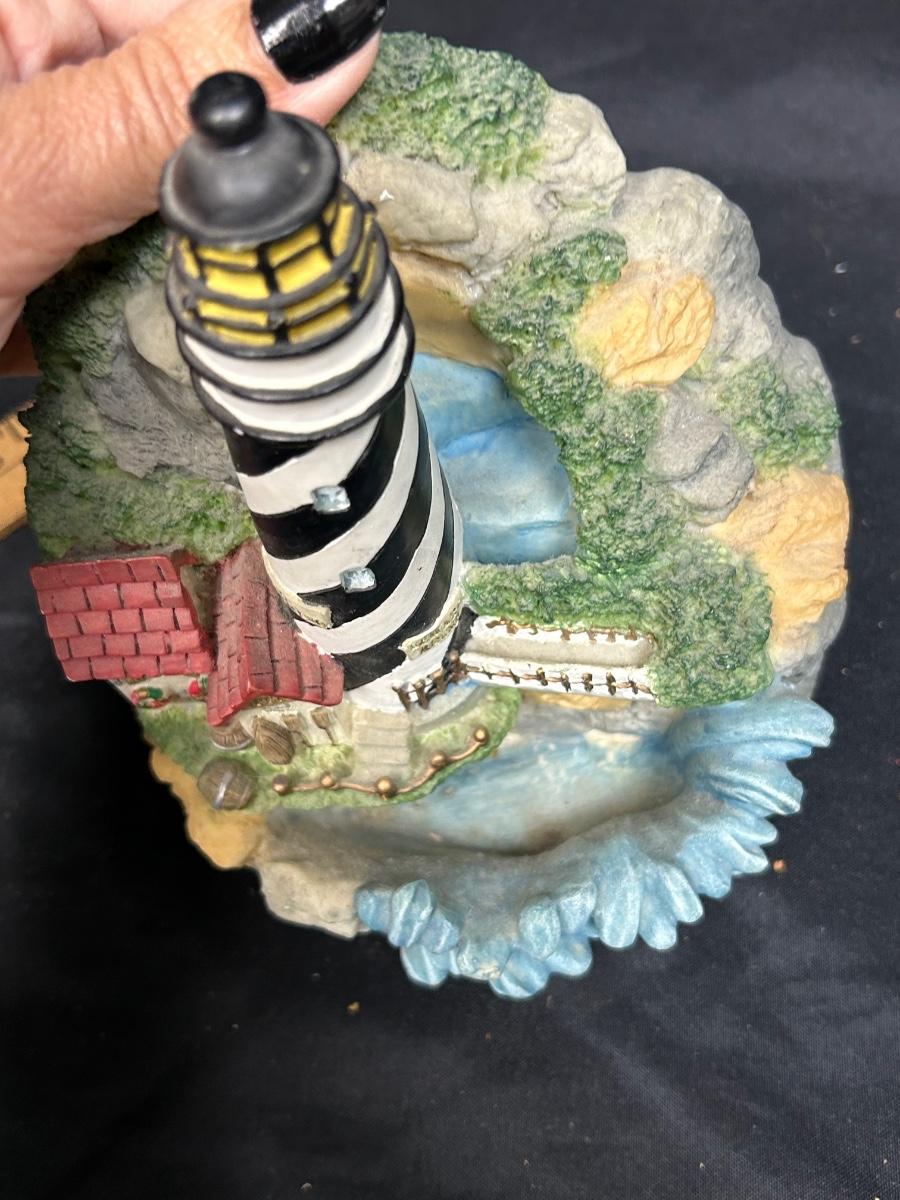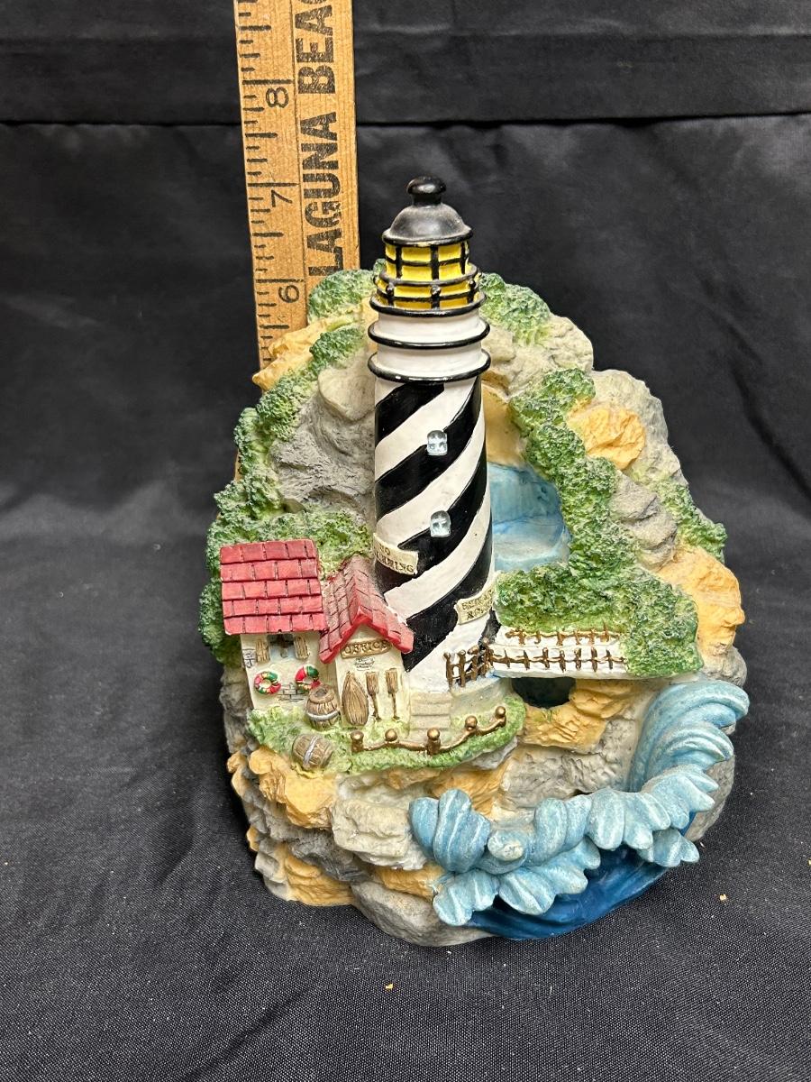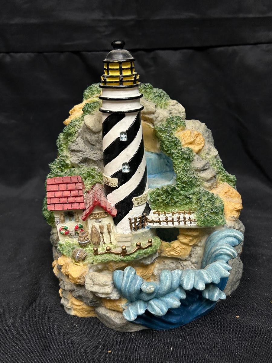 Small Lighthouse Themed Water Fountain Figurine Statuette Display. Battery operated but battery terminal is corroded so not working. Displays nice as is. About 7" size.
