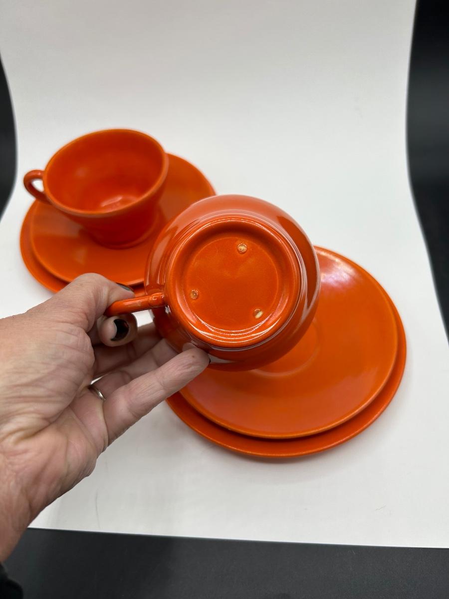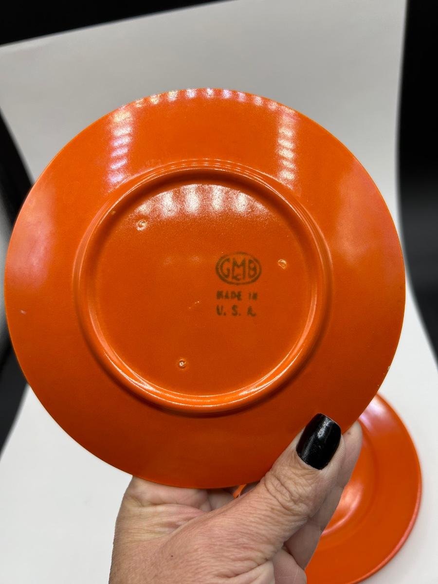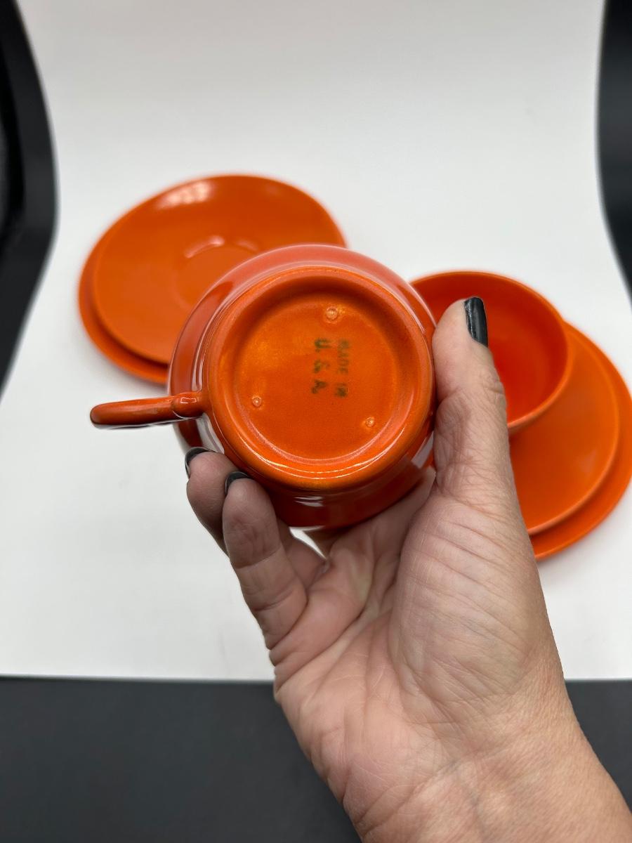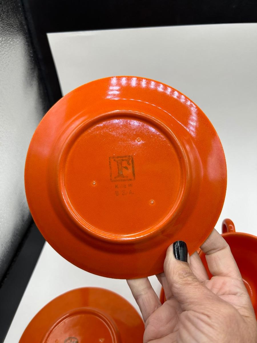 Pair of Vintage Franciscan Gladding McBean California Pottery Orange Cup Saucer Dessert Bread Plate. Great orange color. No chips.