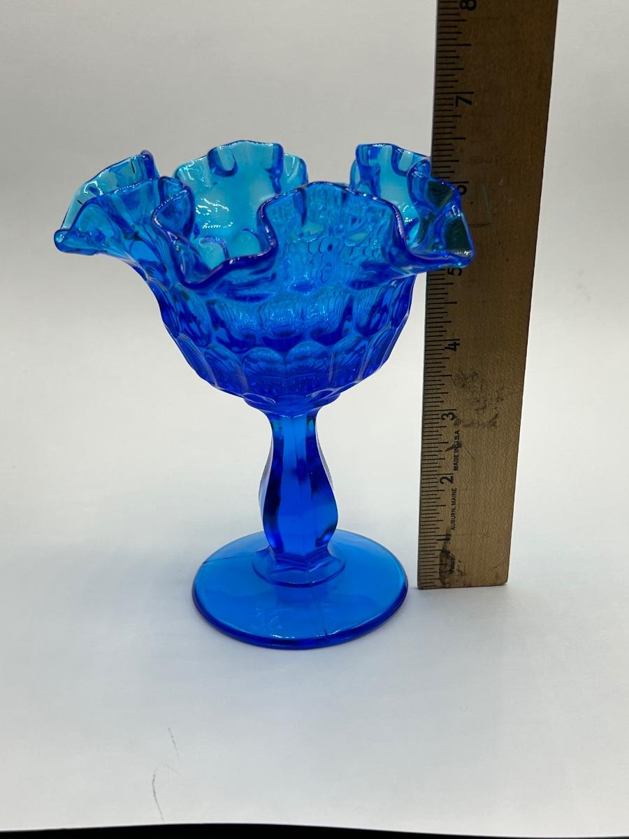 Vintage Colonial Blue Fenton Ruffled Edge Thumbprint Compote Pedestal Candy Dish. In good condition. No chips. About 6" size.
