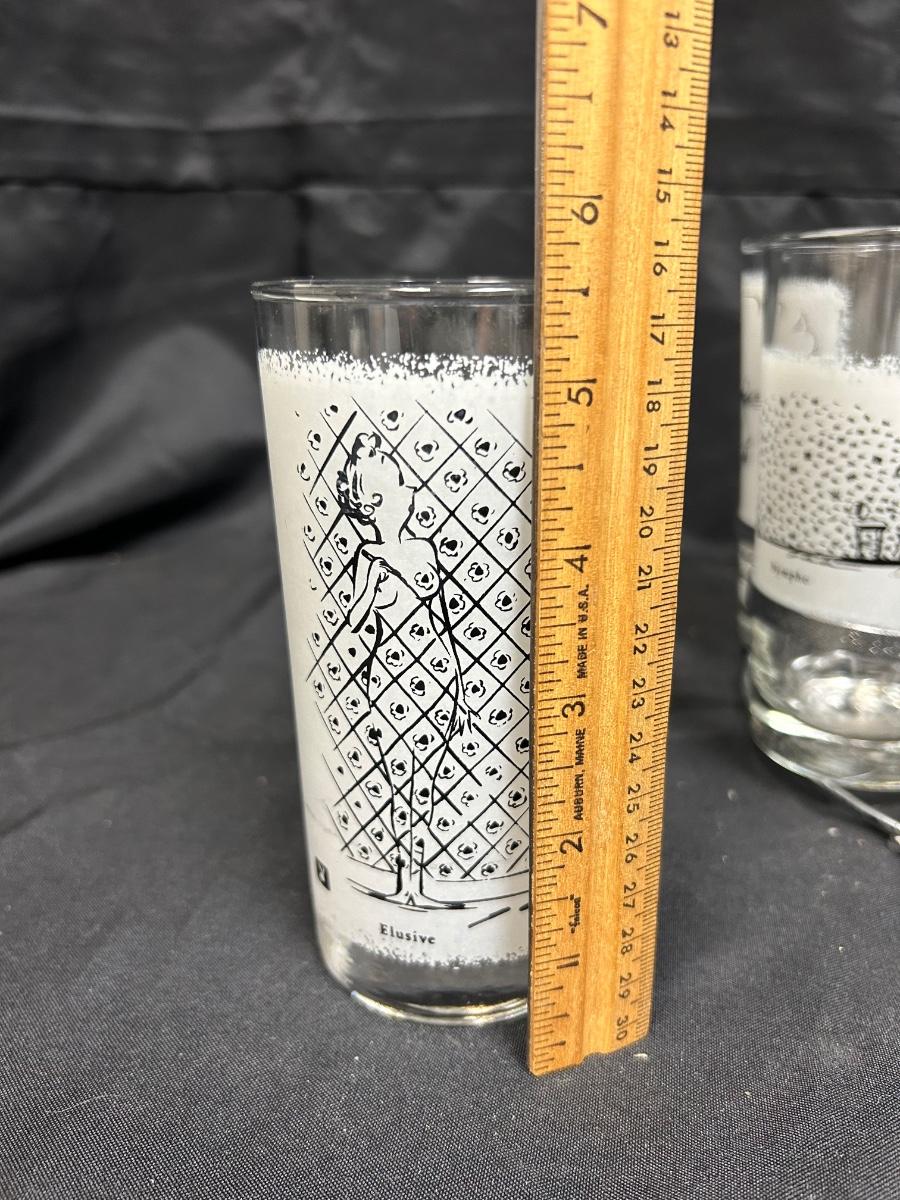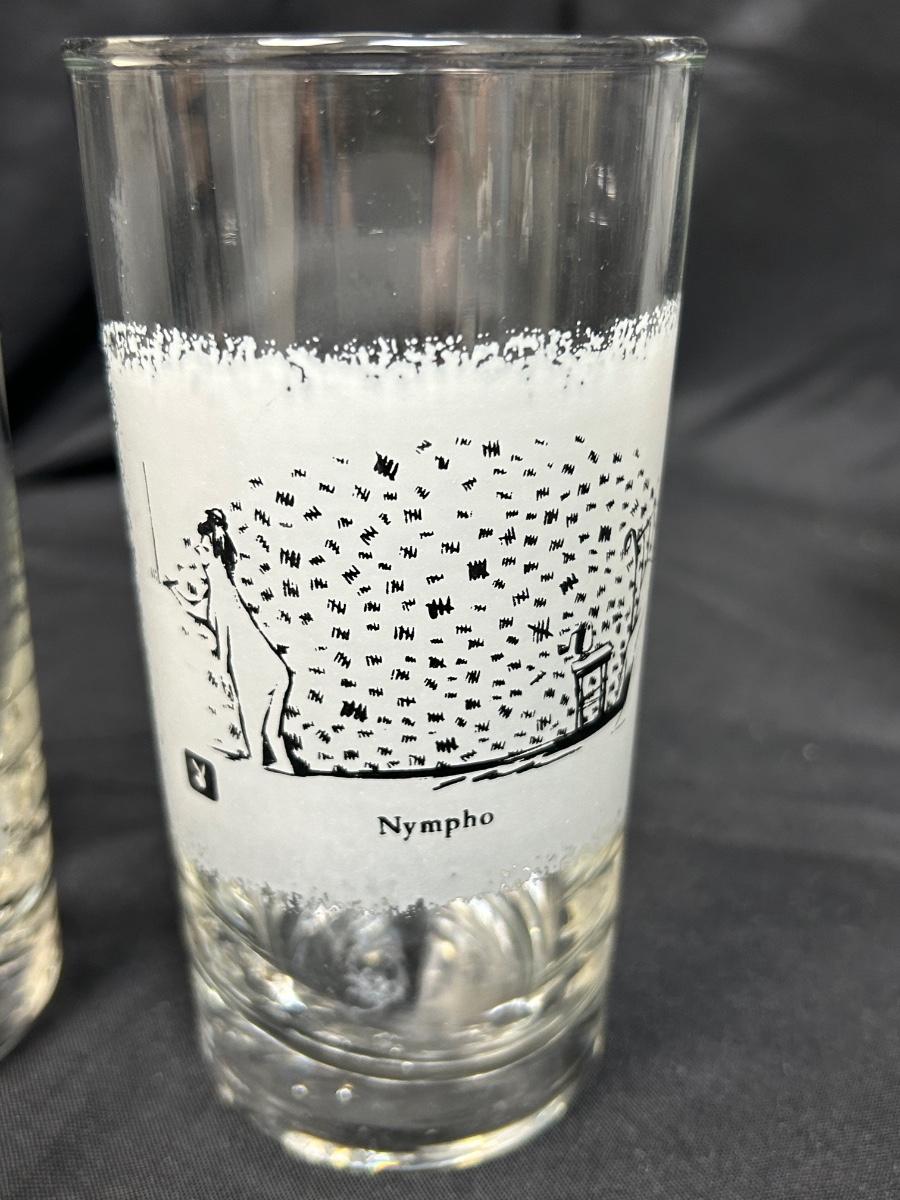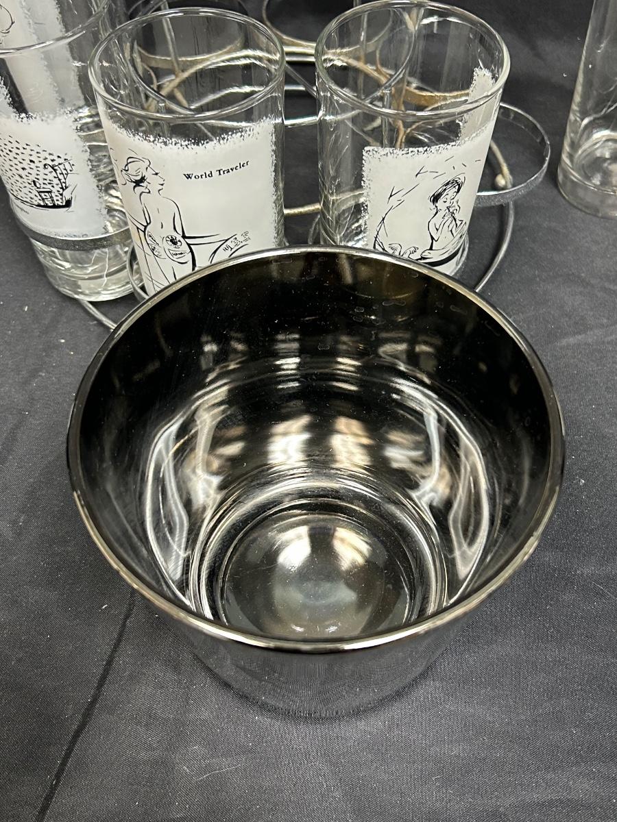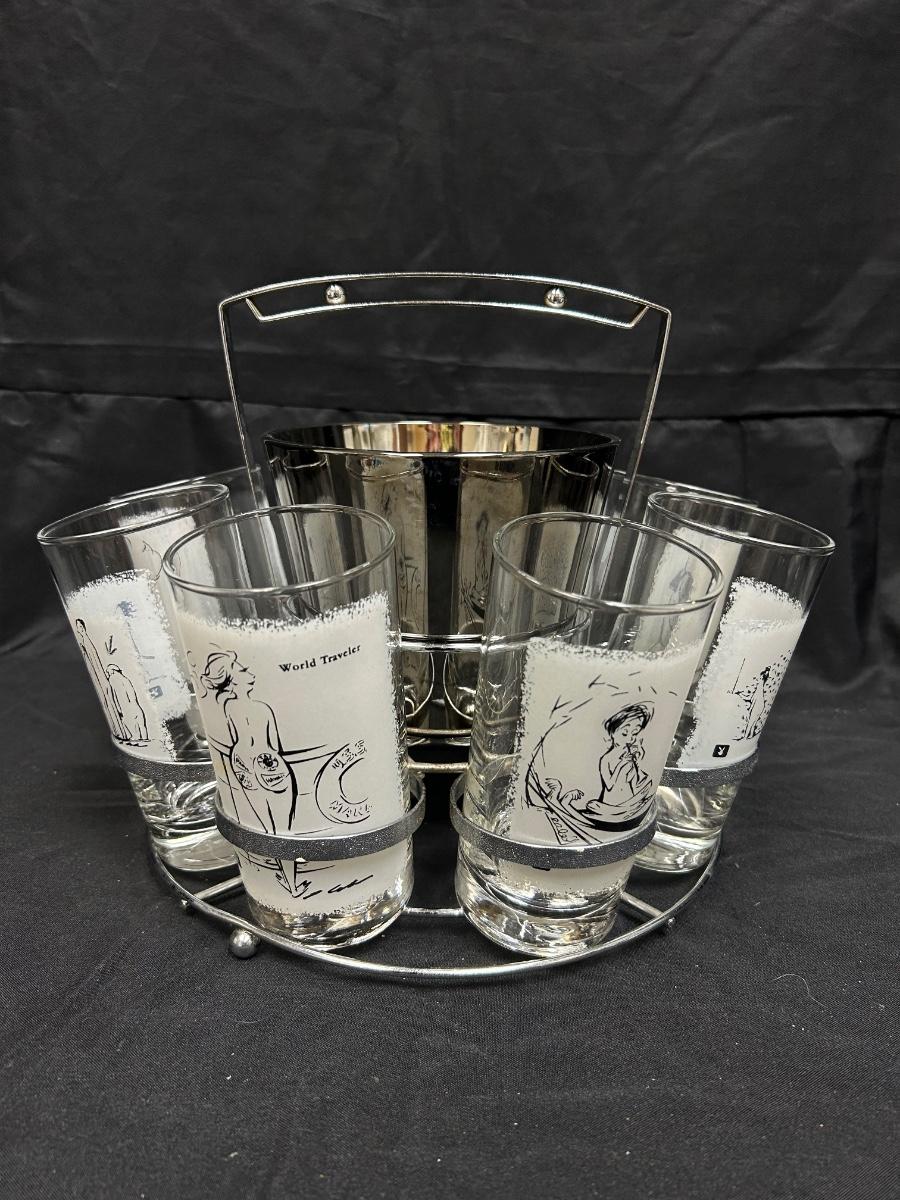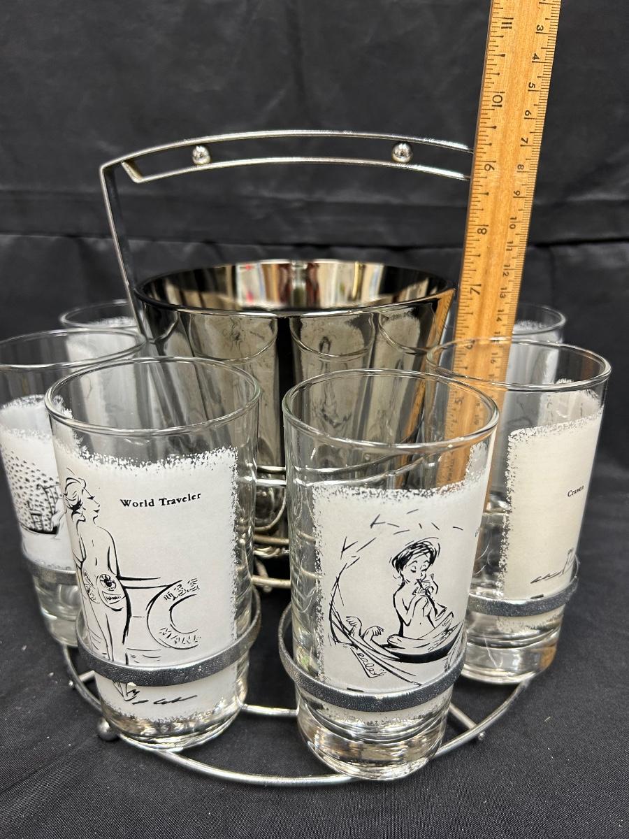 Midcentury Highball Drink Glass Set with Ice Bucket and Caddy Playboy Comic Statement Glasses
