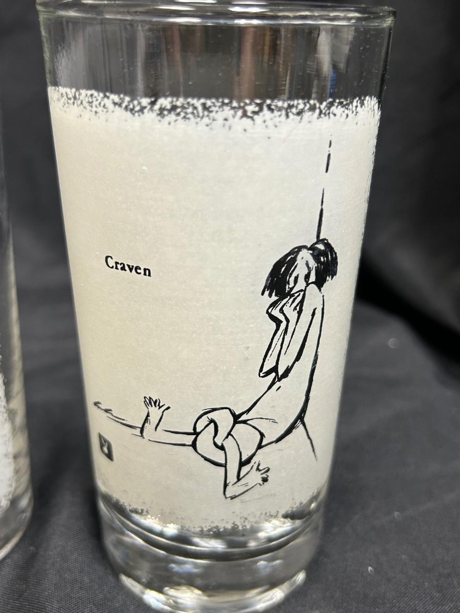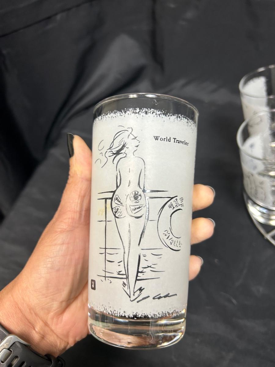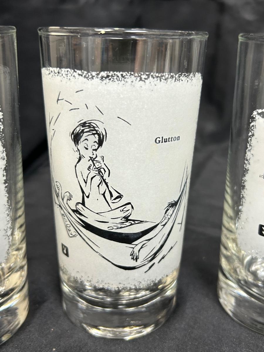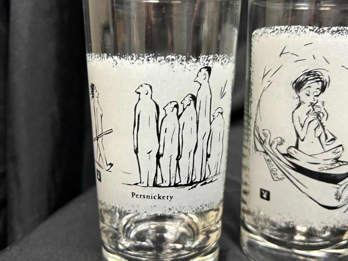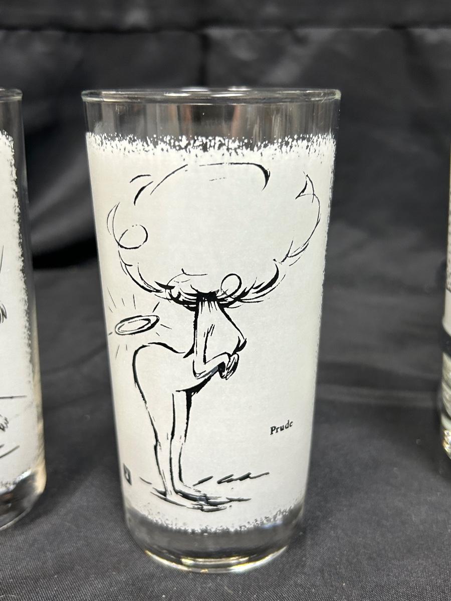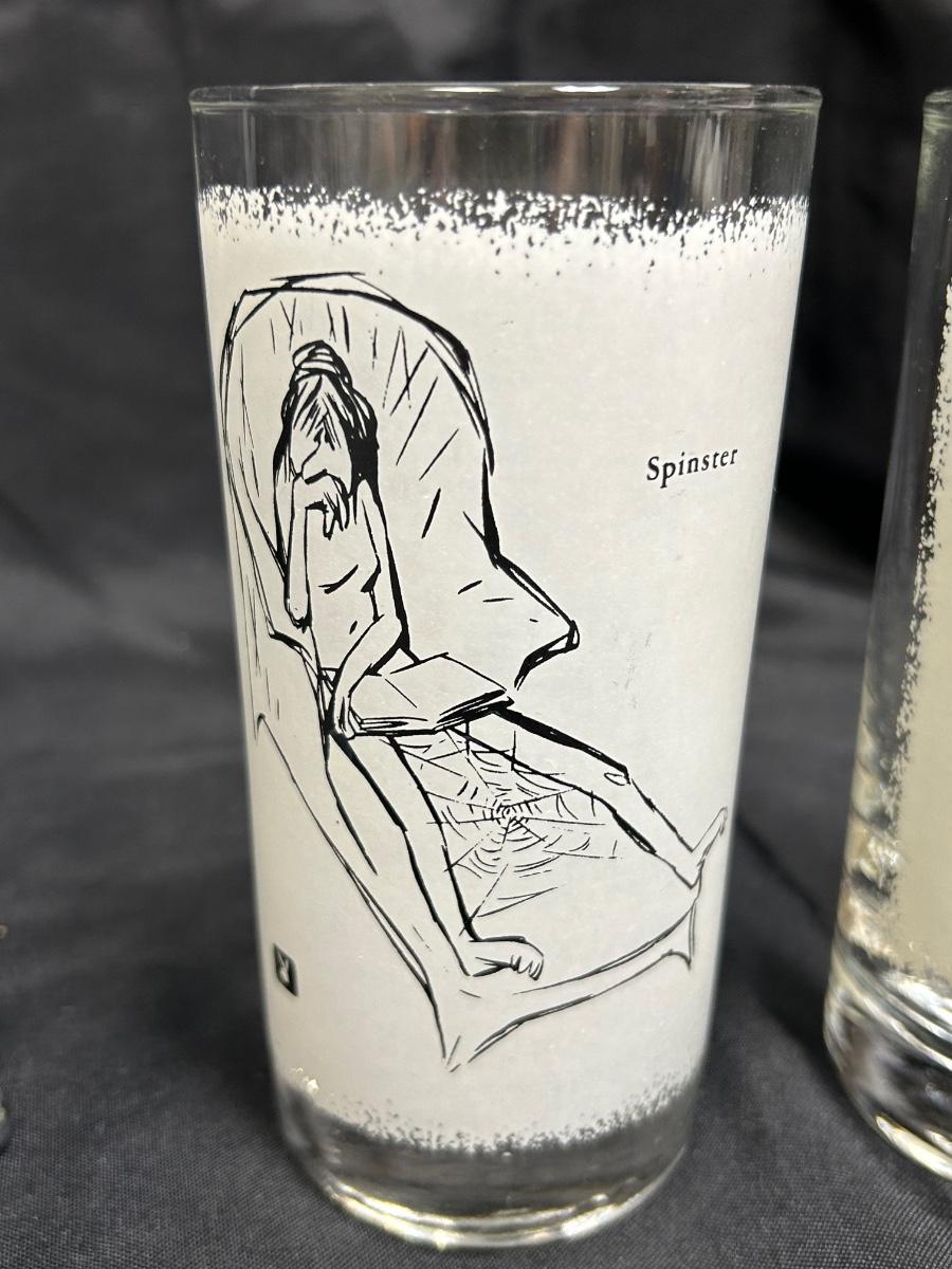 Midcentury Highball Drink Glass Set with Ice Bucket and Caddy Playboy Comic Statement Glasses