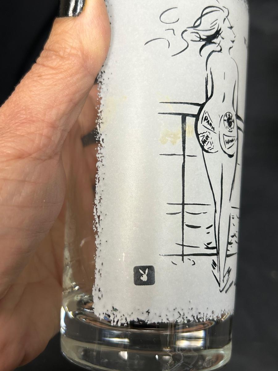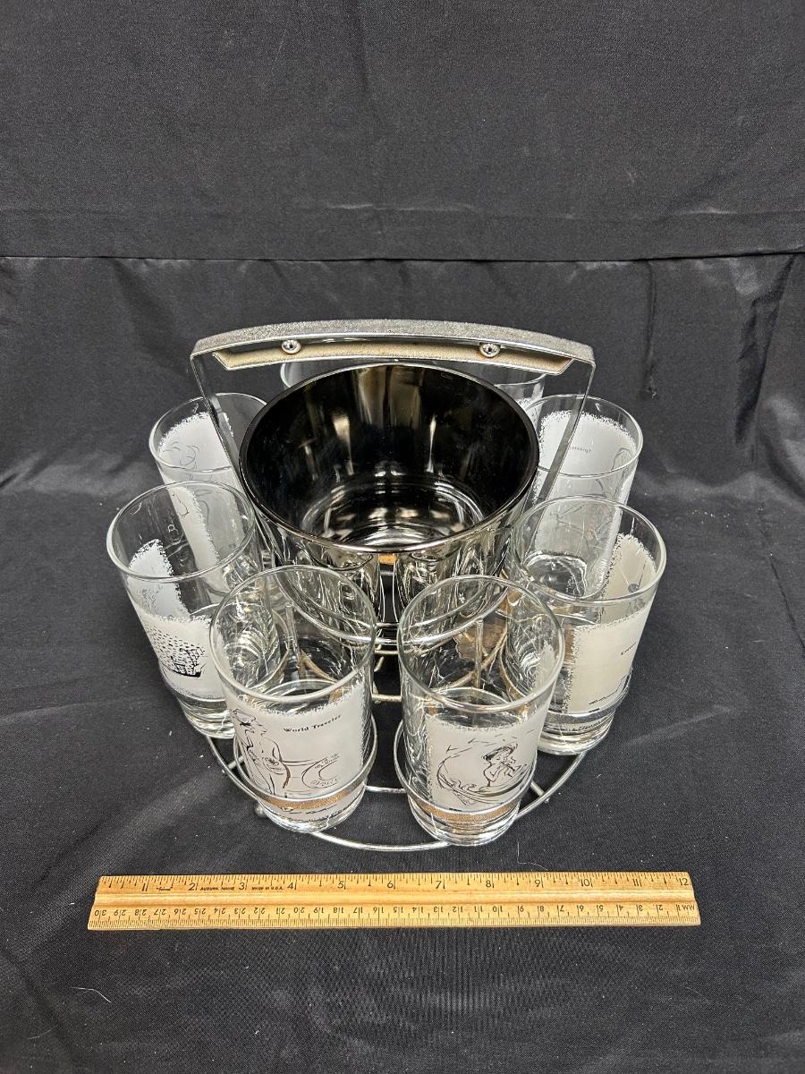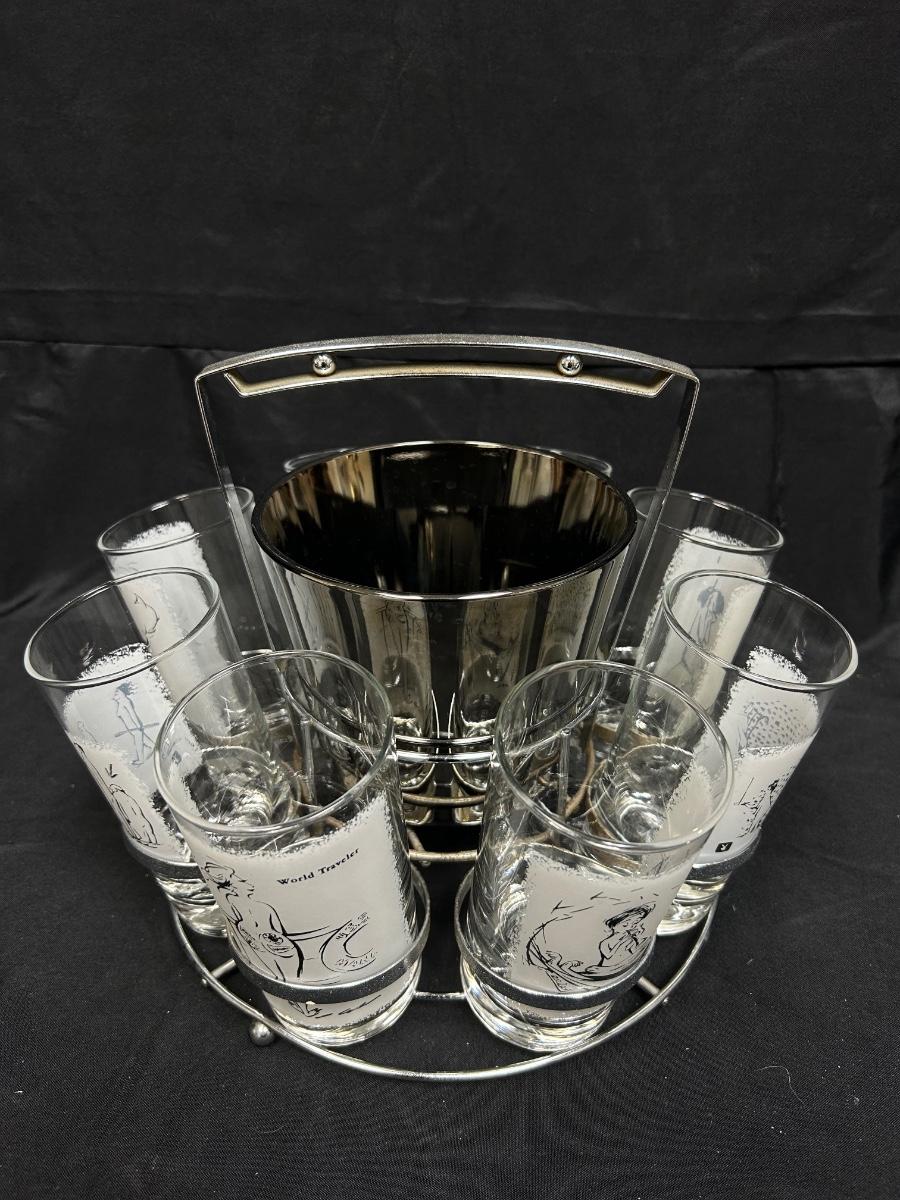 Vintage Midcentury Highball Drink Glass Set with Ice Bucket and Caddy Playboy Comic Glasses. Set of 8 drink glasses, each one different but all have the Playboy Bunny hallmark at the bottom. Artwork looks to be from one of Playboys comic artists. In good condition. Ice Bucket is metallic finished glass. Caddy has carry handle for easy moving and serving. Some light signs of age to the metal. In overall good condition for use and display.