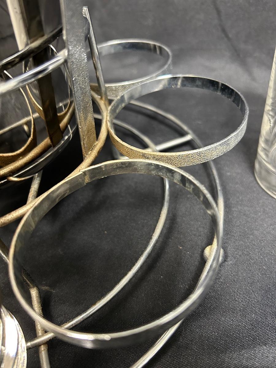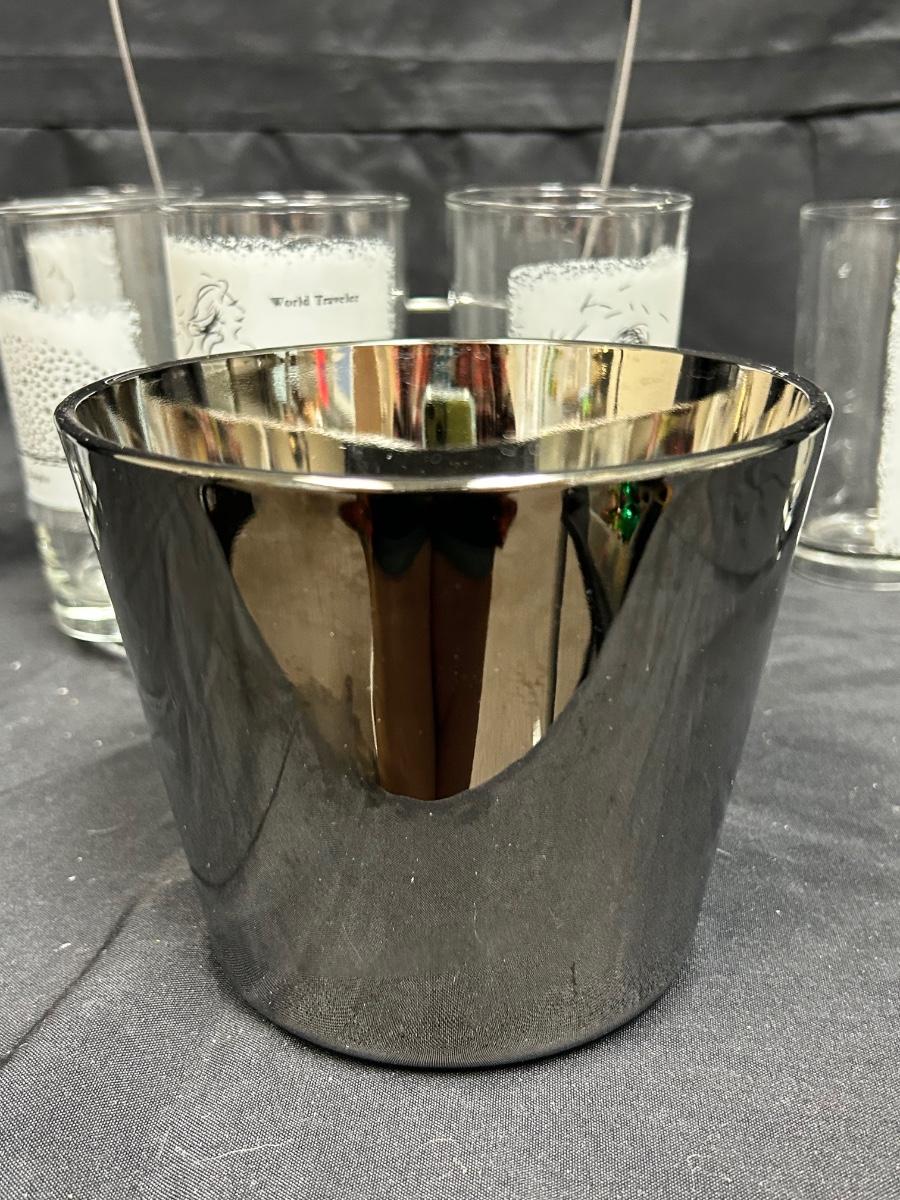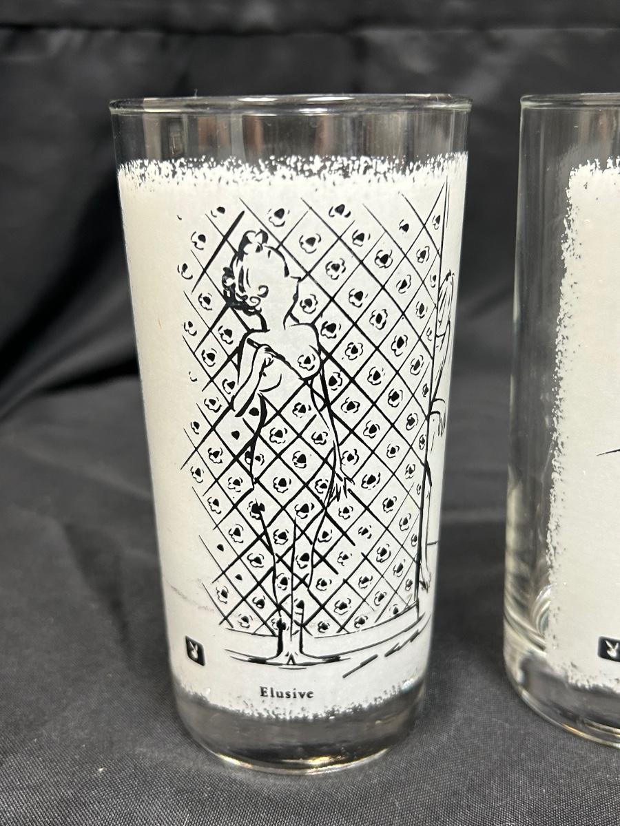 Vintage Midcentury Highball Drink Glass Set with Ice Bucket and Caddy Playboy Comic Glasses. Set of 8 drink glasses, each one different but all have the Playboy Bunny hallmark at the bottom. Artwork looks to be from one of Playboys comic artists. In good condition. Ice Bucket is metallic finished glass. Caddy has carry handle for easy moving and serving. Some light signs of age to the metal. In overall good condition for use and display.
