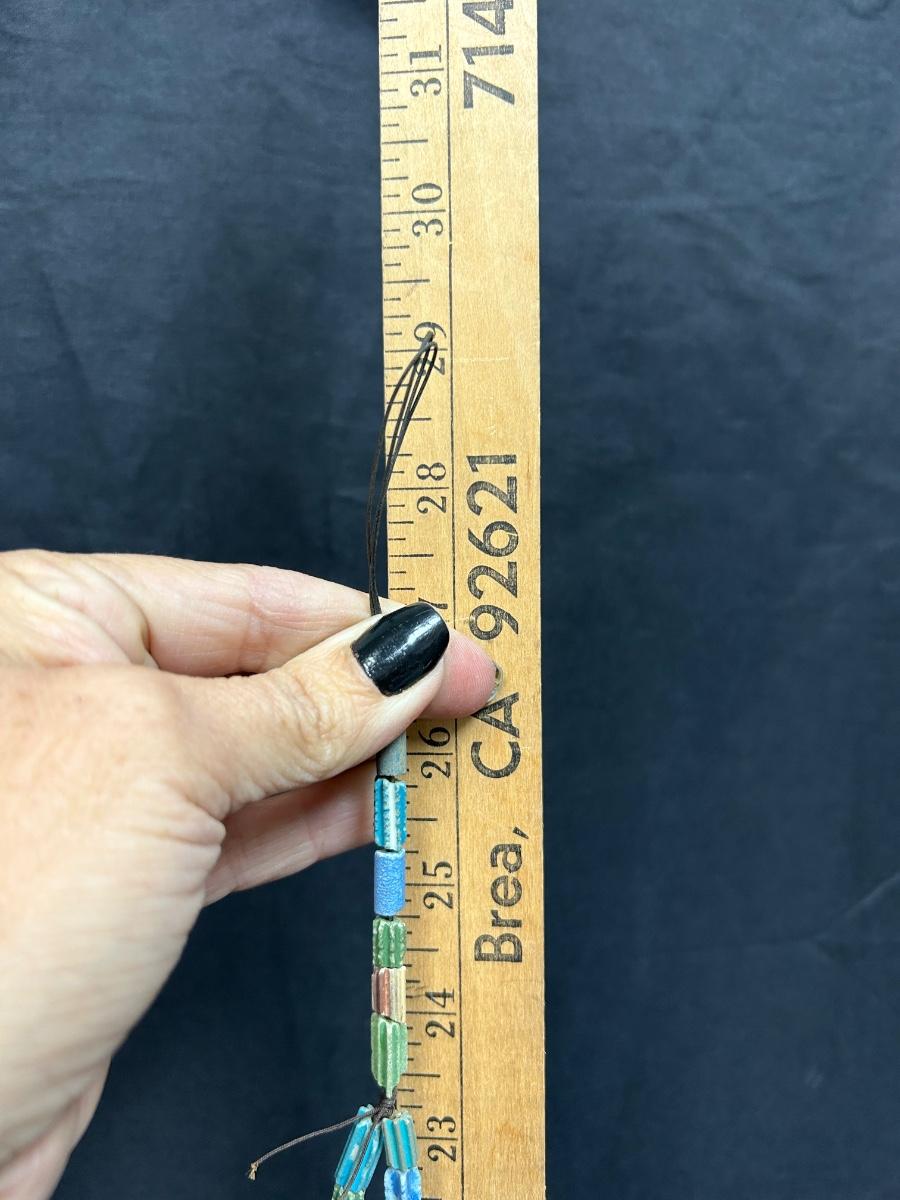 Vintage Hanging Clay Ceramic Pottery Hand Painted Bells. In good condition, no broken bells. About 29" total length when hanging. Great for indoor or outdoor display.