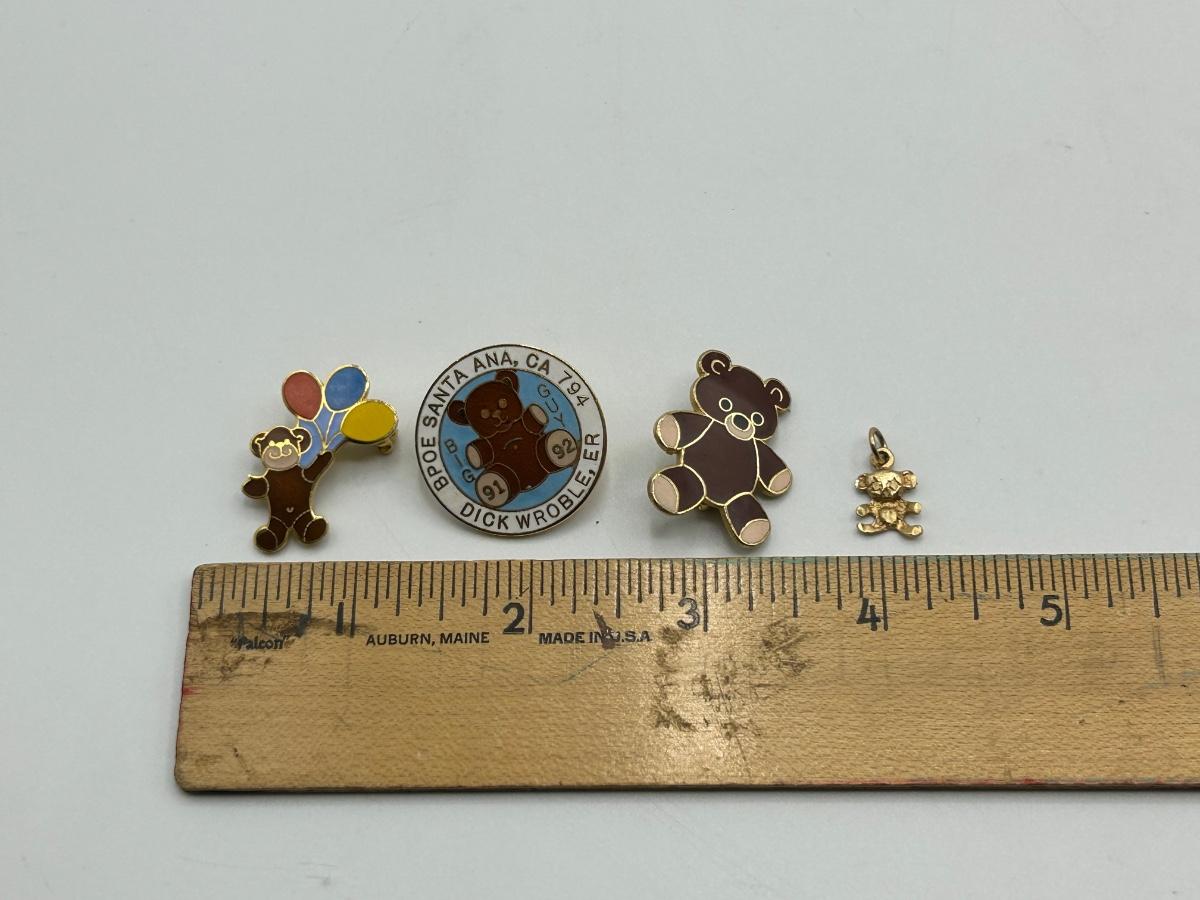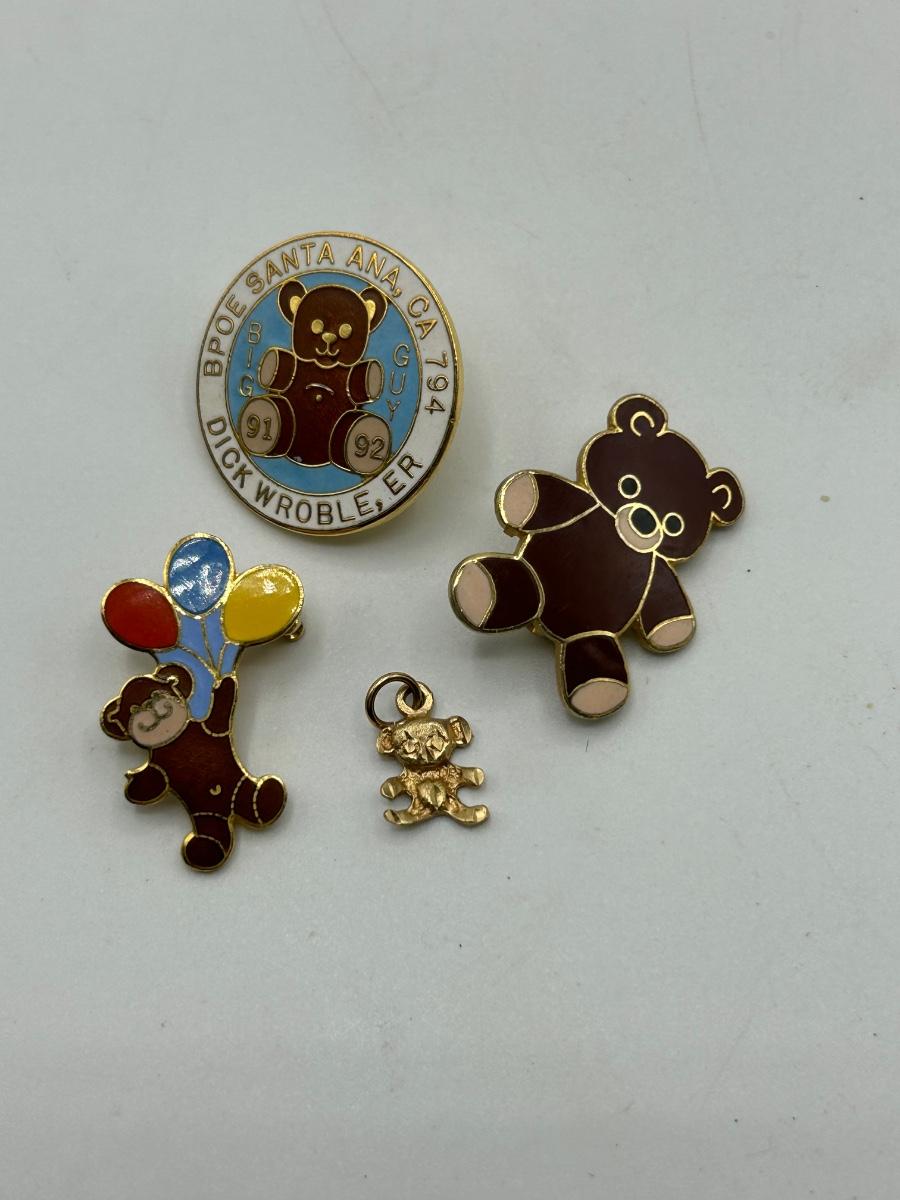 Teddy Bear Jewelry Lot Pin Buttons Charm. Three enamel pins and a gold tone charm. In good condition.
