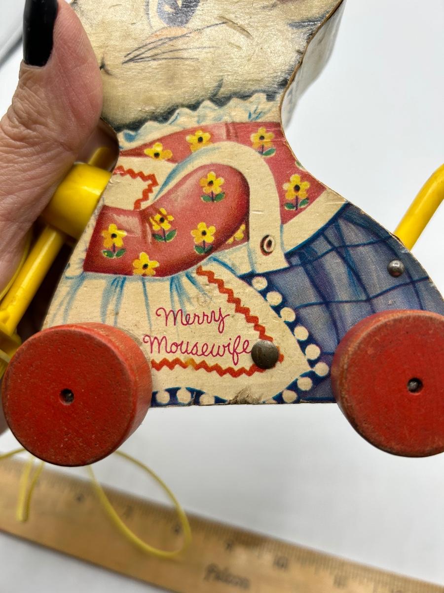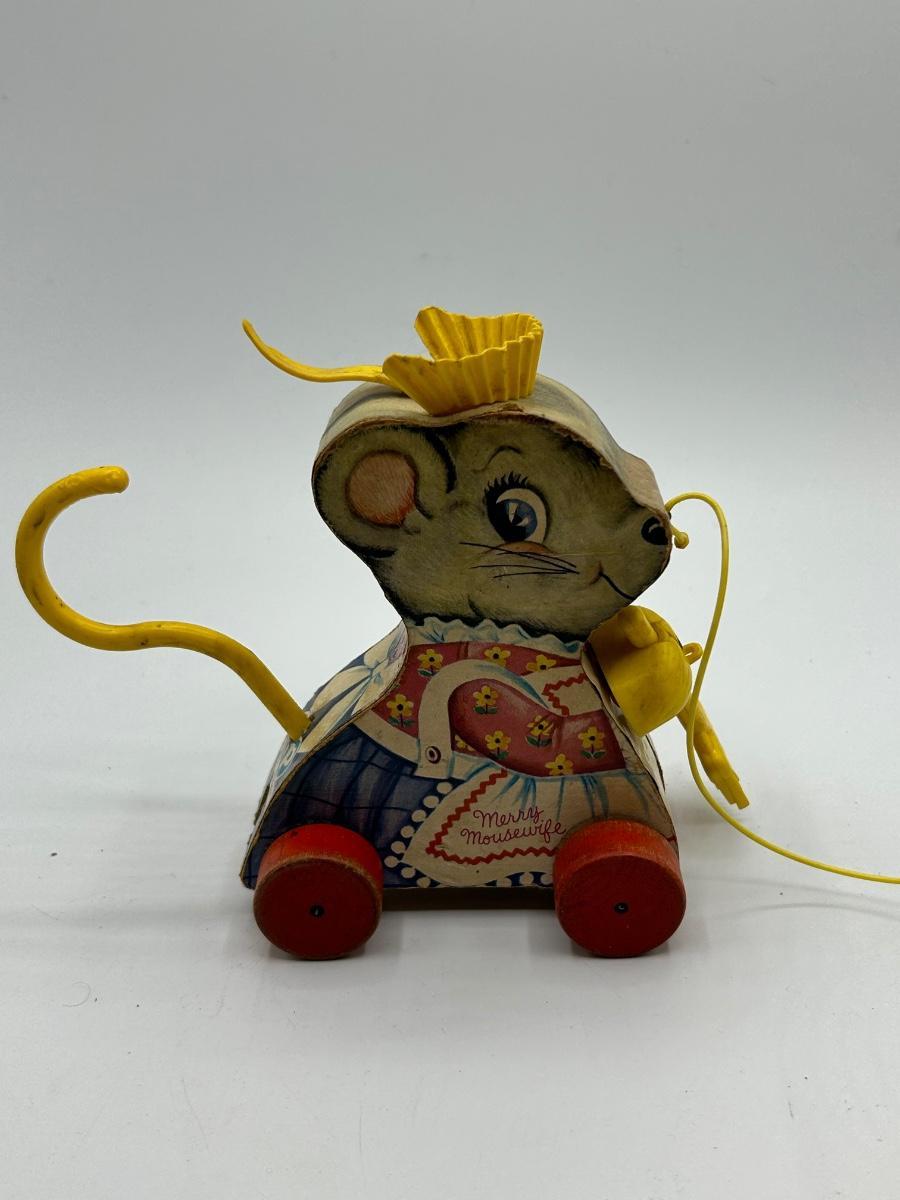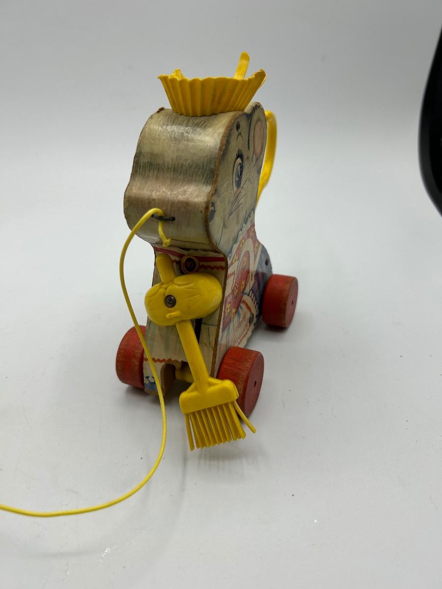 Vintage Fisher Price Pull Along Toy Merry Mousewife Wood Toy 1962. In good vintage condition. Pull string attached, mouse sweeps when pulled. Displays great.