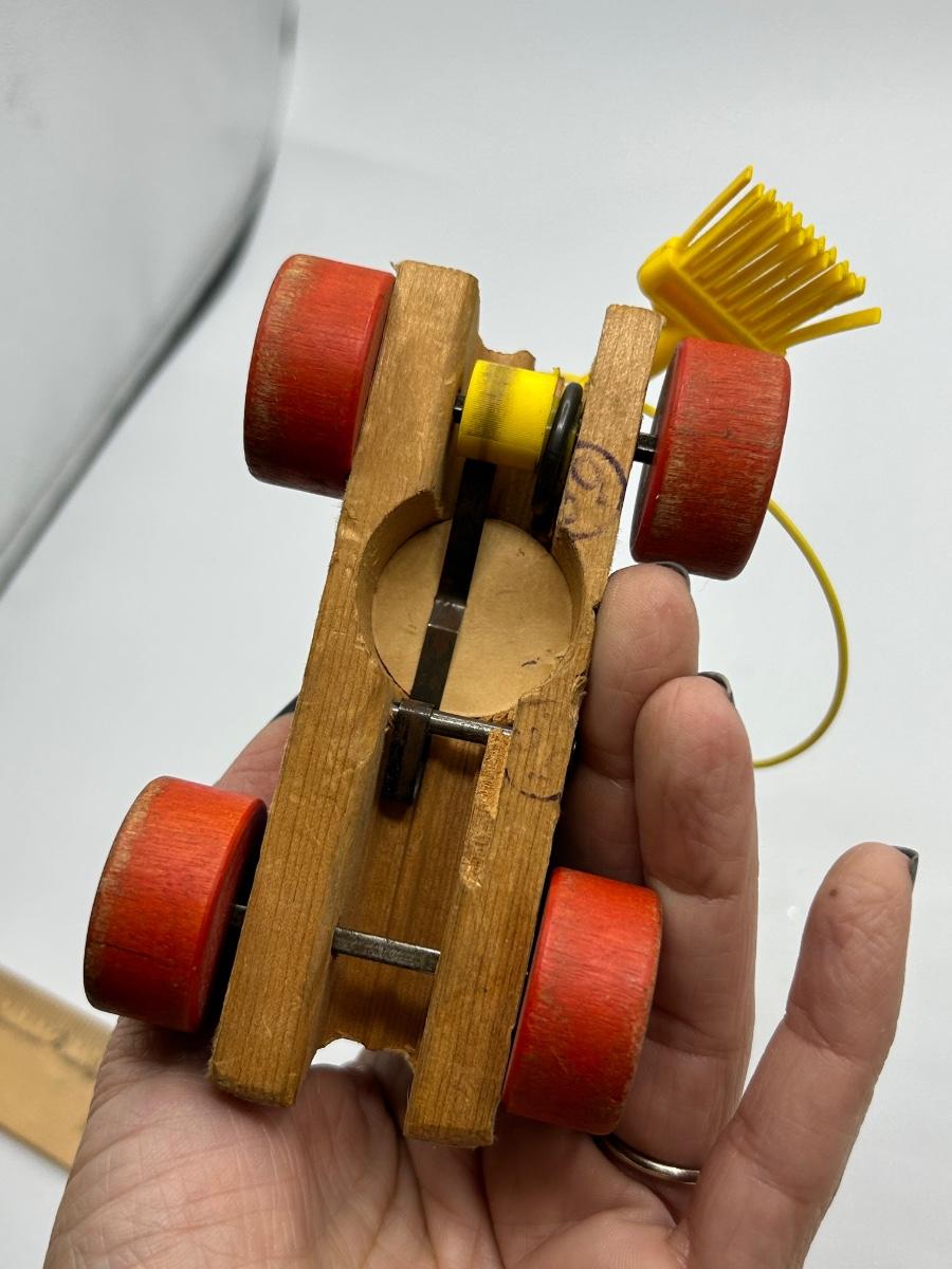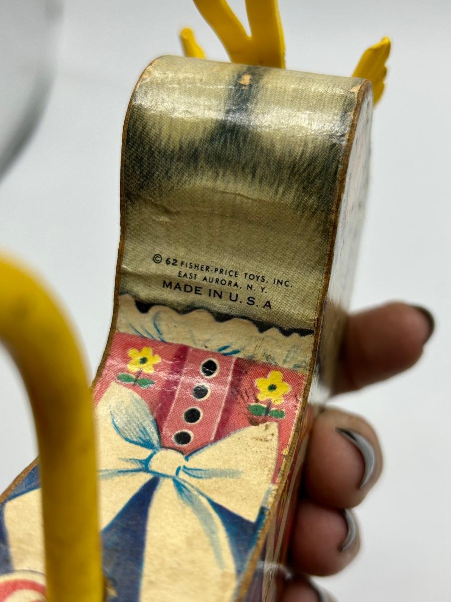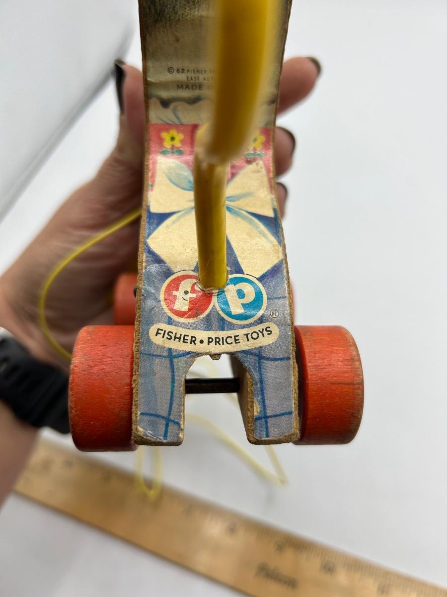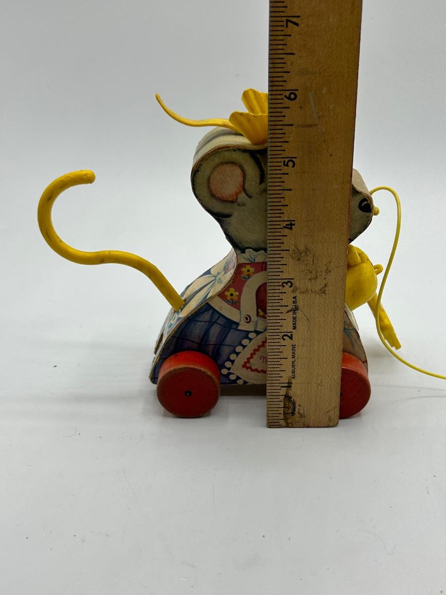 Vintage Fisher Price Pull Along Toy Merry Mousewife Wood Toy 1962. In good vintage condition. Pull string attached, mouse sweeps when pulled. Displays great.