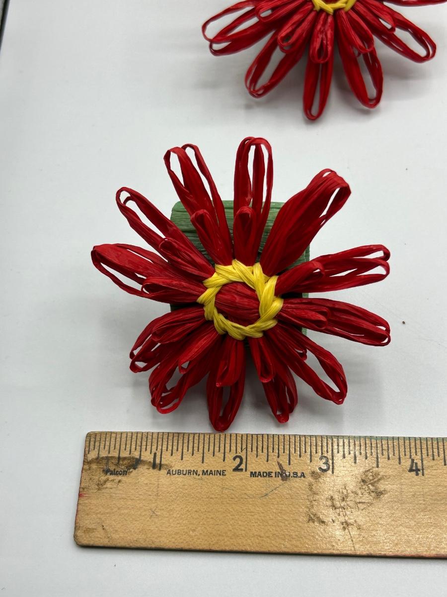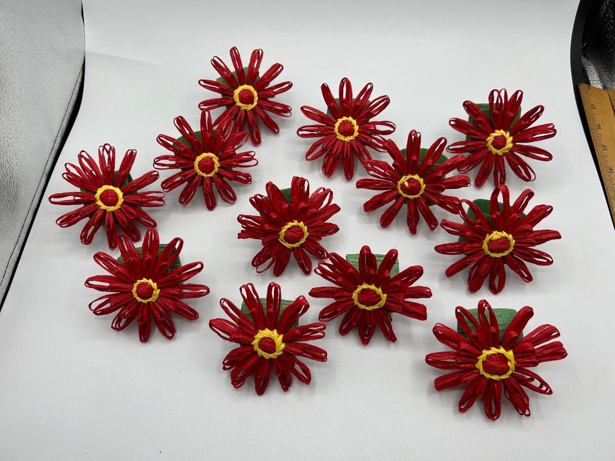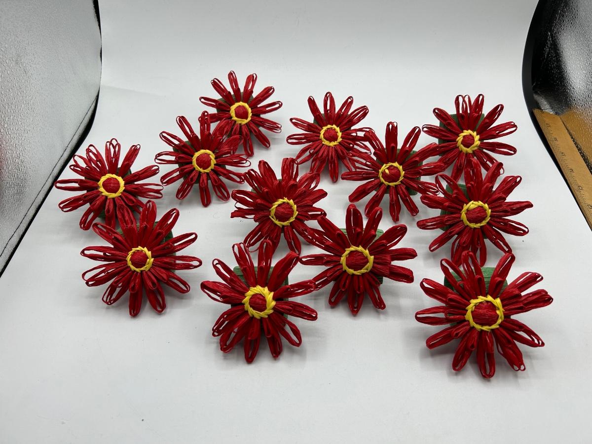 Set of 12 Red Paper Raffia Flower Napkin Ring Holders. Nicely made. In good condition.