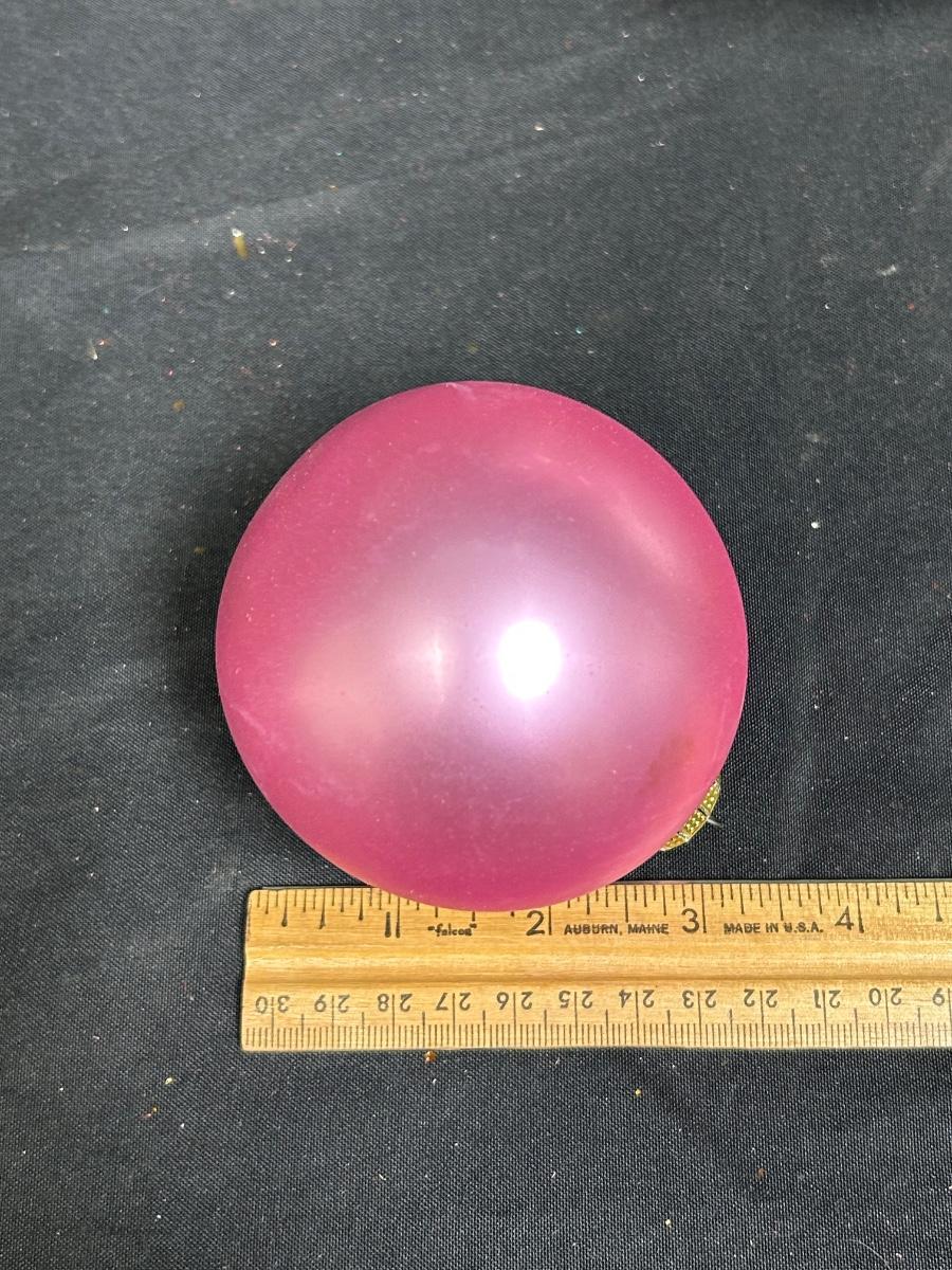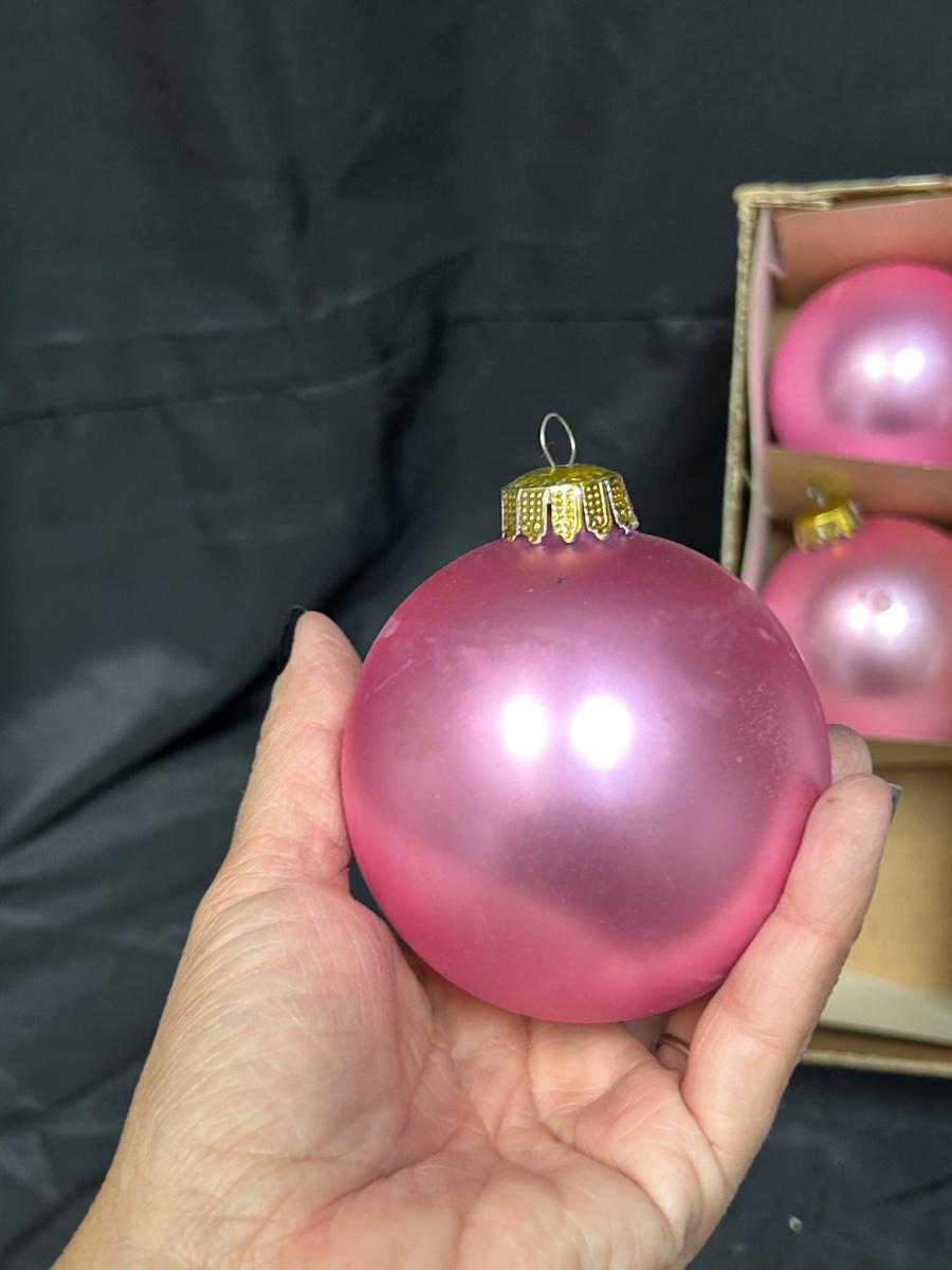 Set of 6 Large 3" Satin Bubblegum Pink Blown Glass Christmas Holiday Tree Ornaments. In good condition, little to no wear from age.