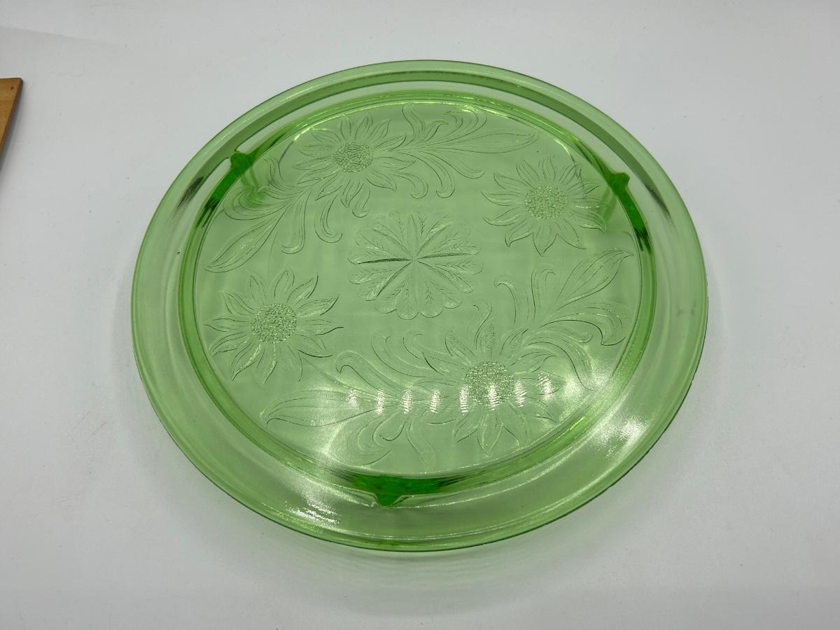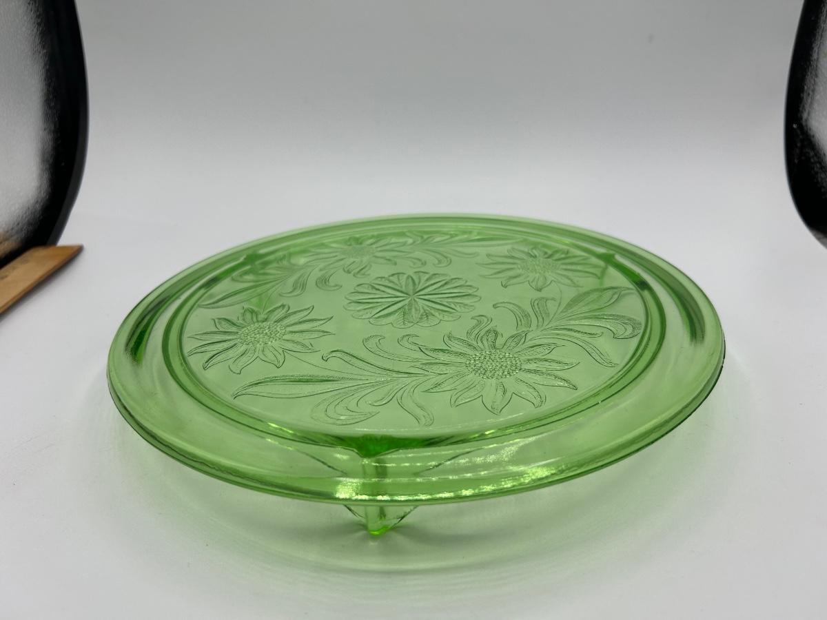 Vintage Anchor Hocking Green Glass Flower Embossed Footed Cake Dessert Serving Plate