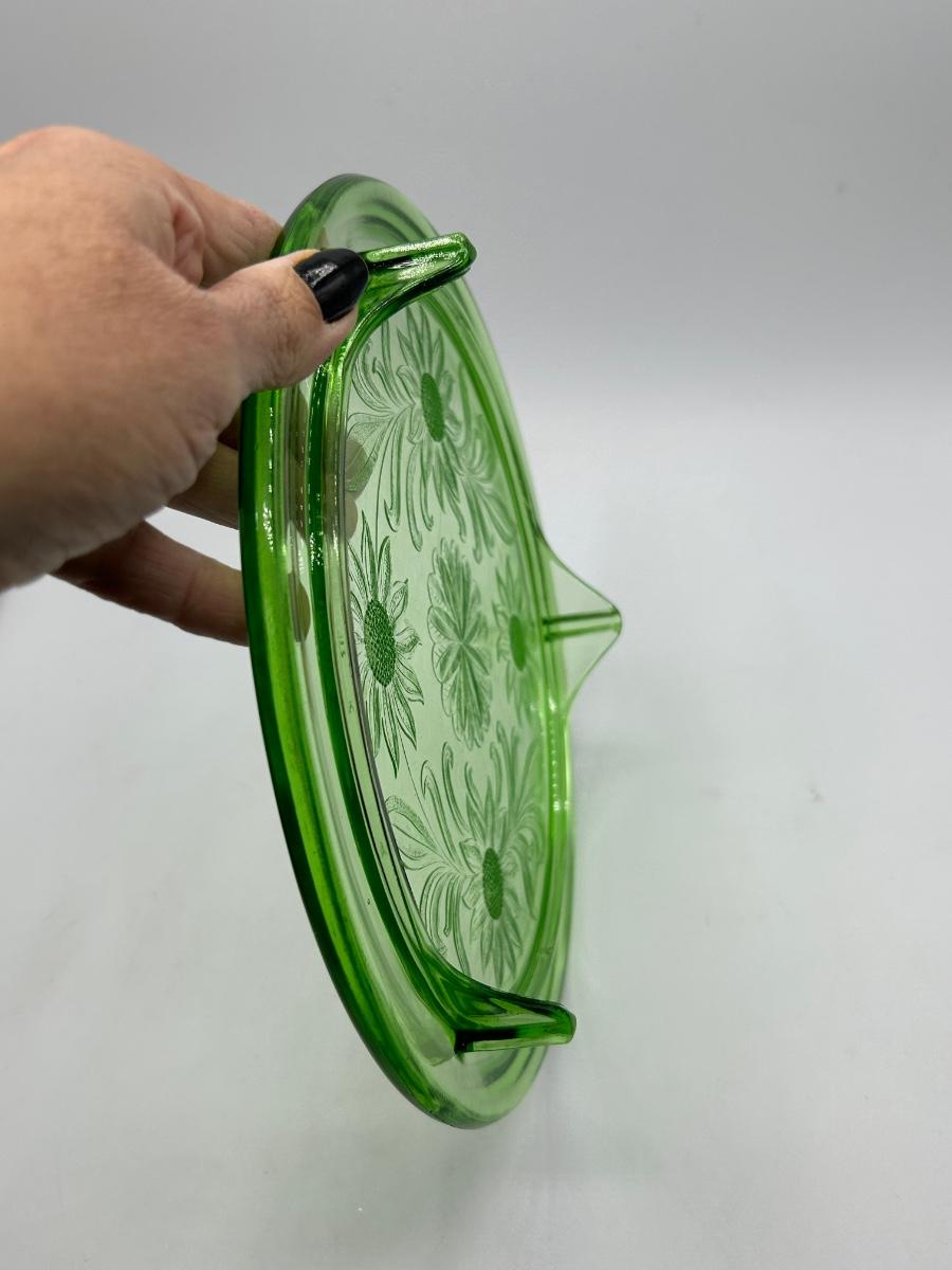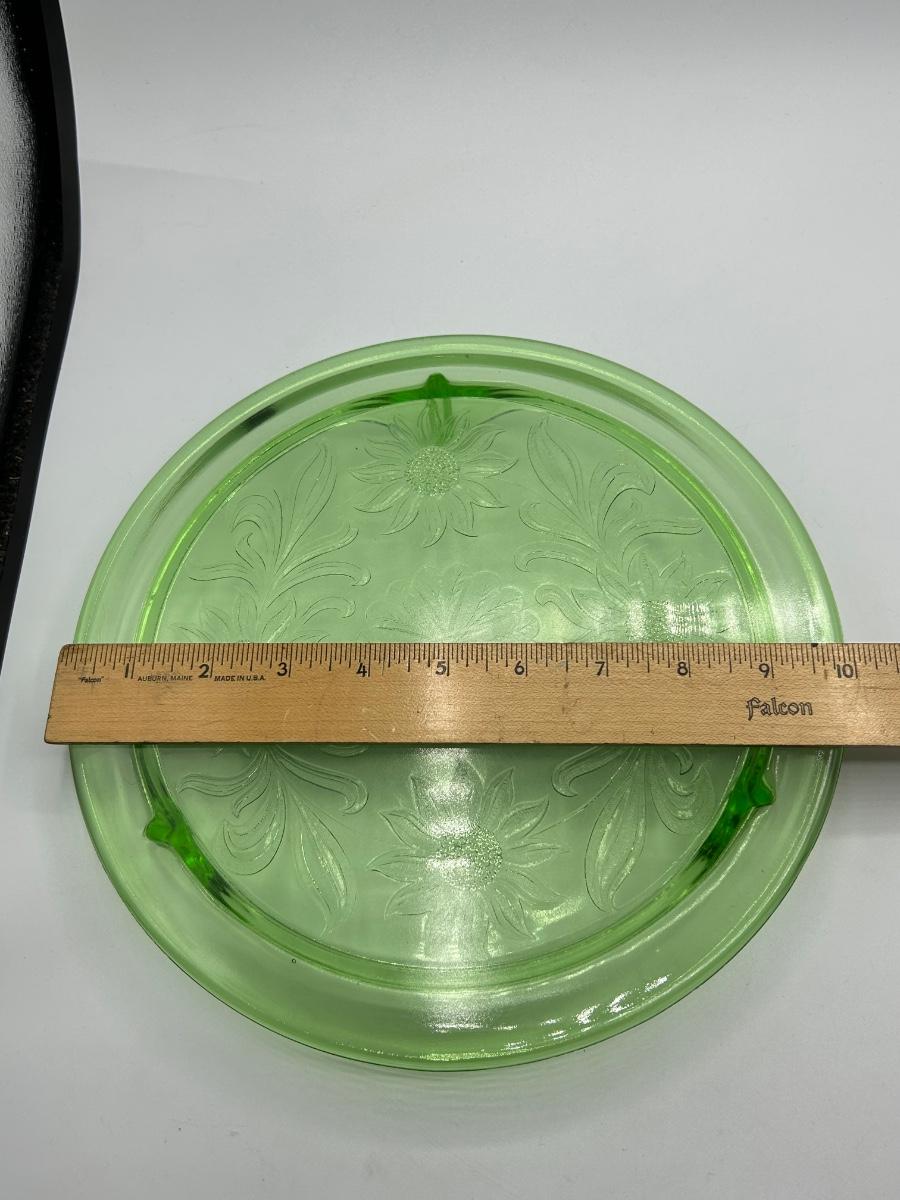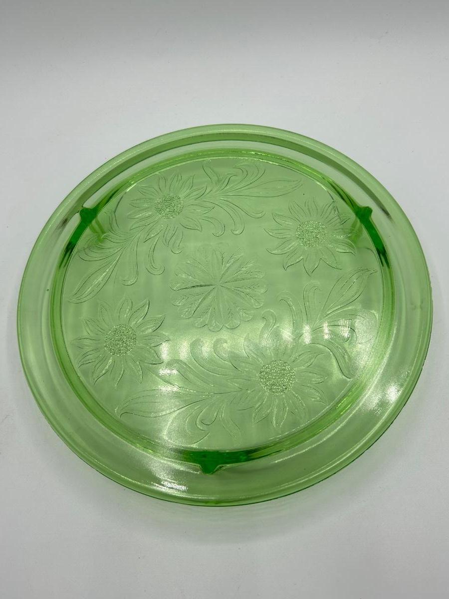 Vintage Green Glass Flower Embossed Footed Cake Dessert Serving Plate. In good condition. Not vaseline glass, checked. Made by Anchor Hocking.