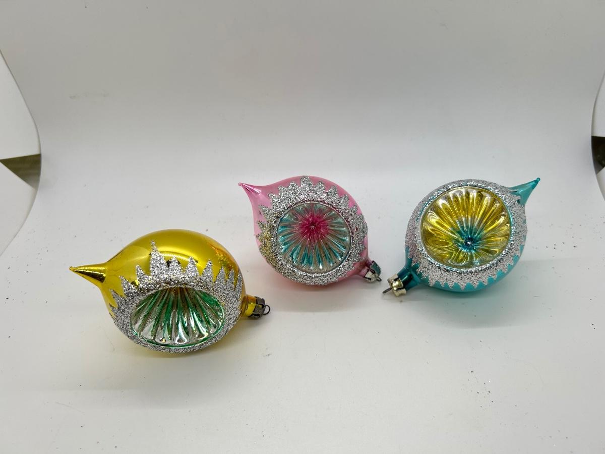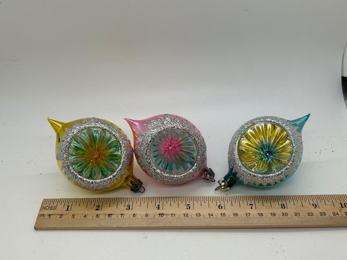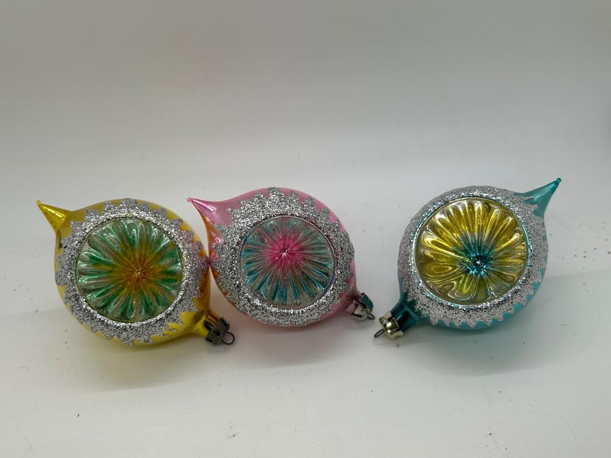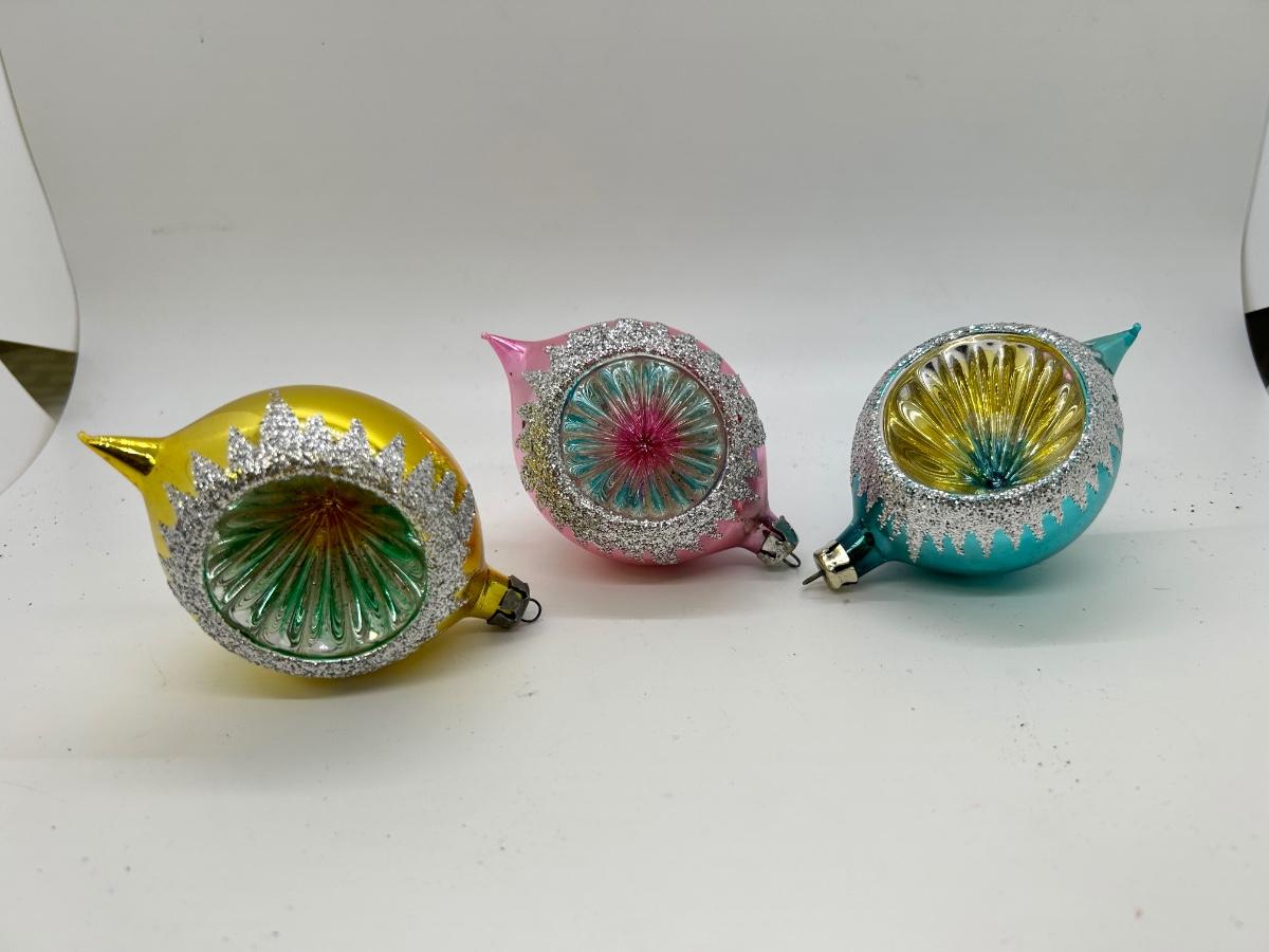 Lot of Three Pastel Color & Glitter Blown Glass Indent Christmas Holiday Tree Ornaments. Beautiful vintage glass ornaments. In good condition, no broken bulbs. About 3' size.