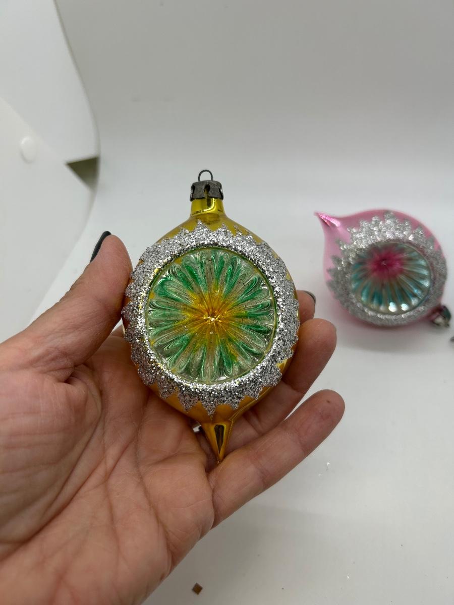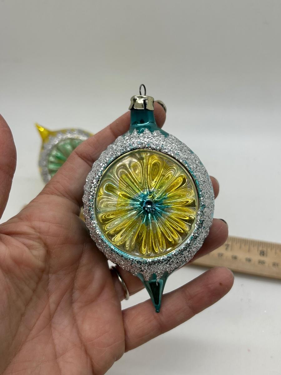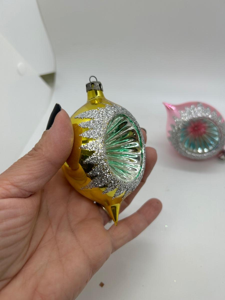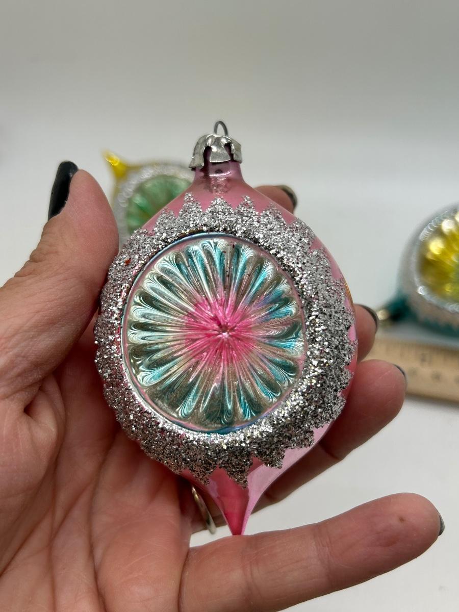 Lot of Three Pastel Color & Glitter Blown Glass Indent Christmas Holiday Tree Ornaments. Beautiful vintage glass ornaments. In good condition, no broken bulbs. About 3' size.