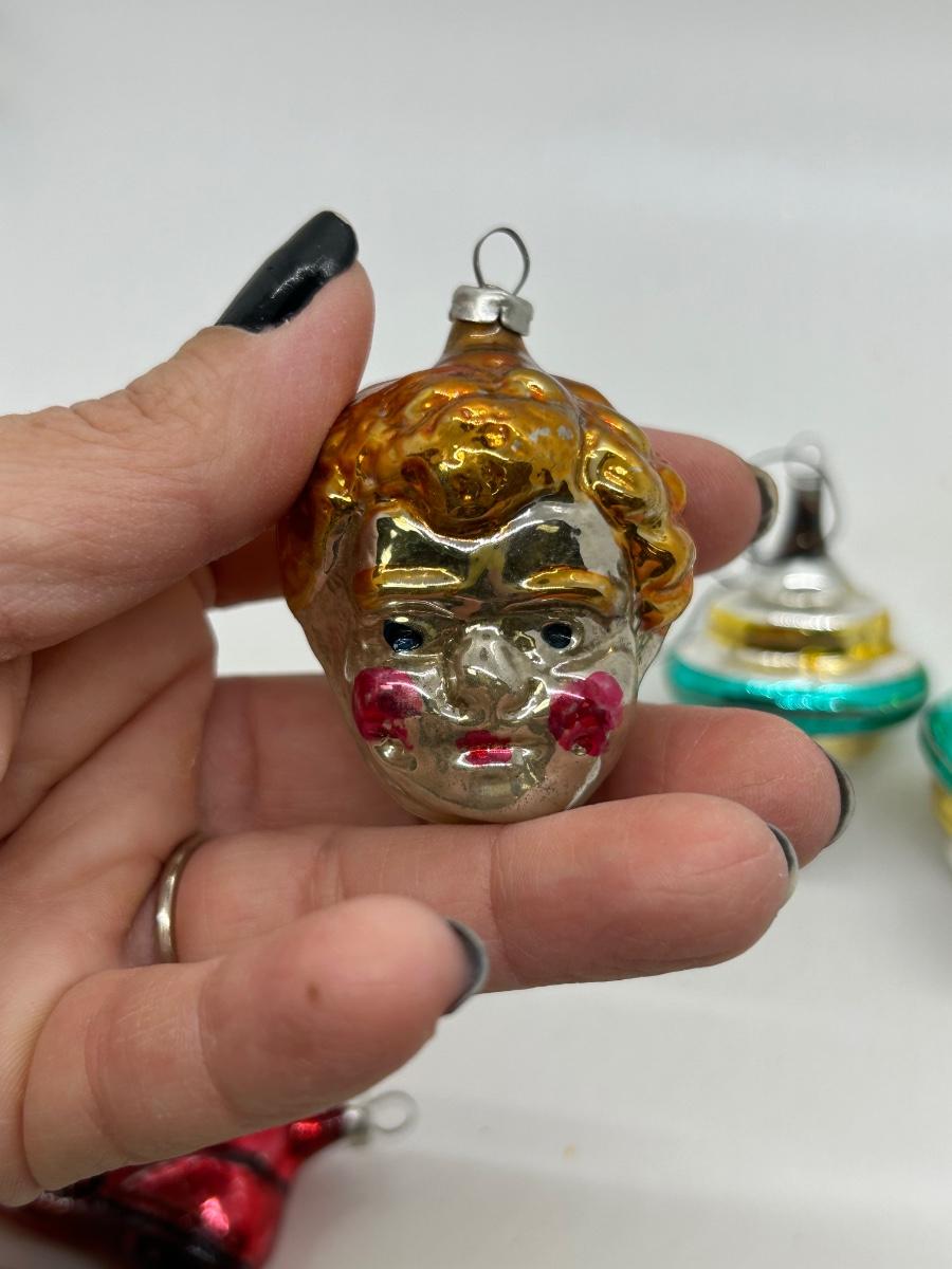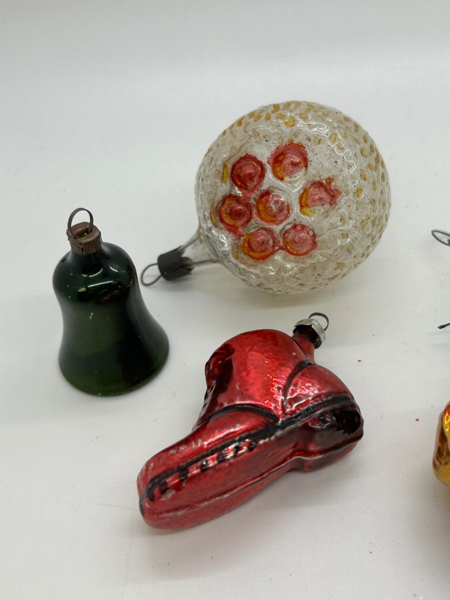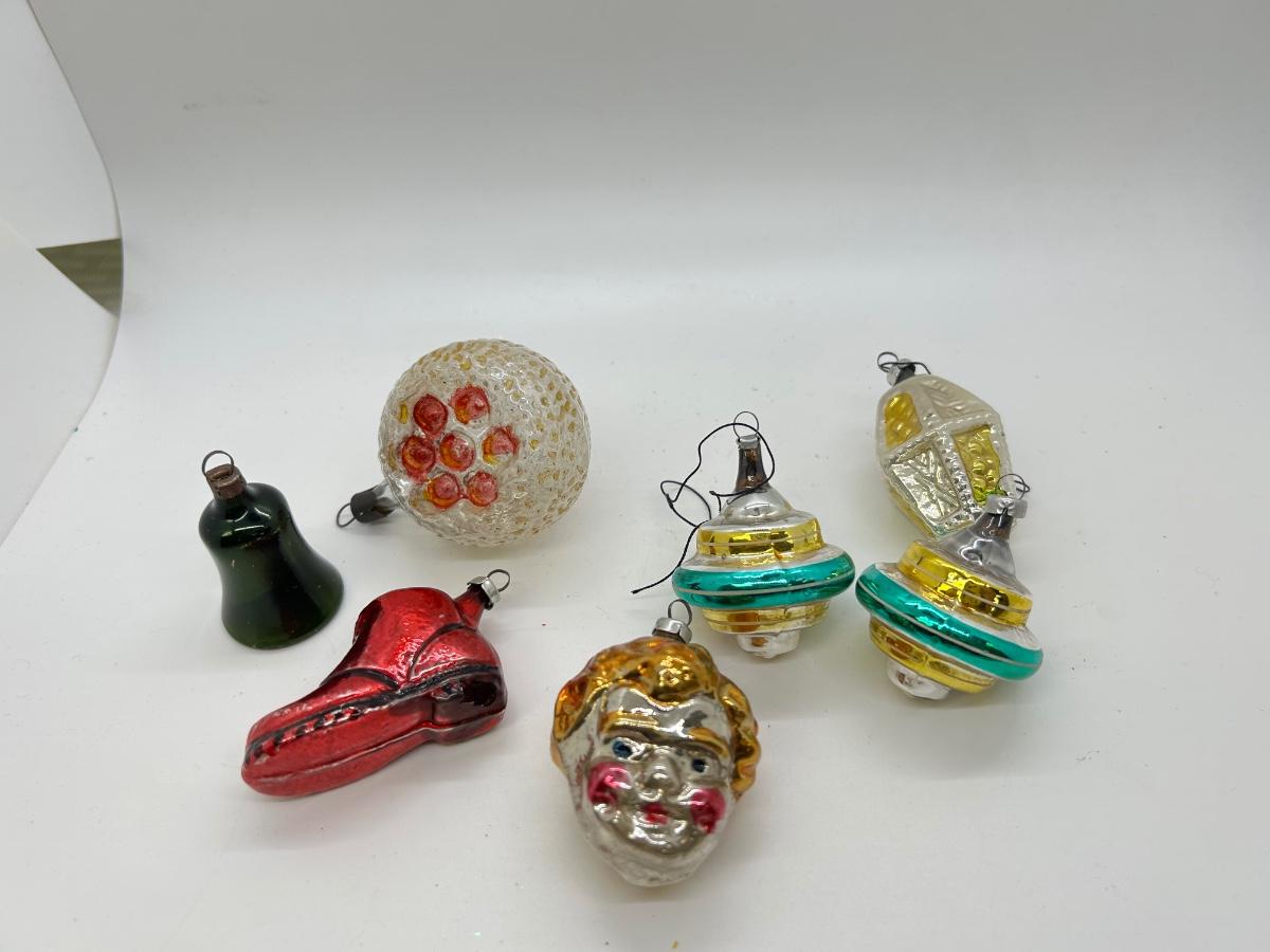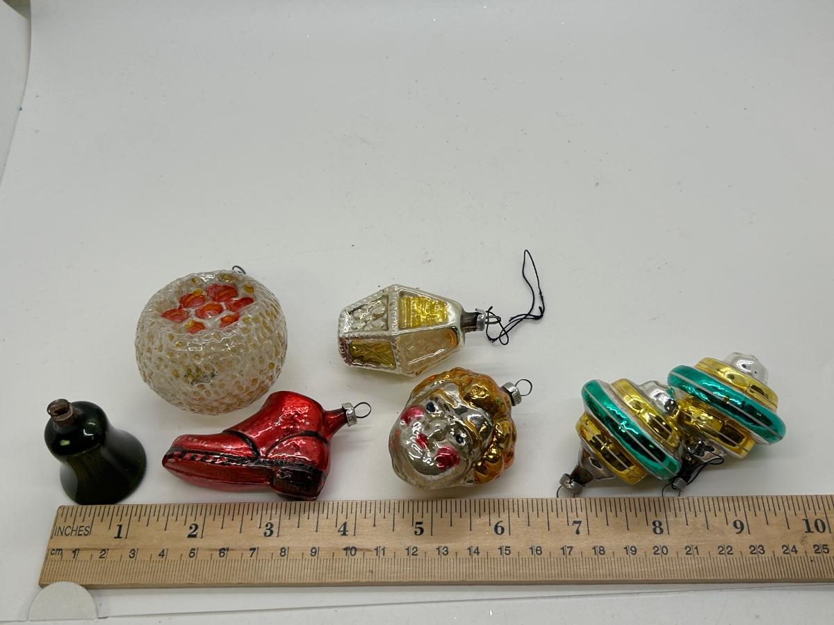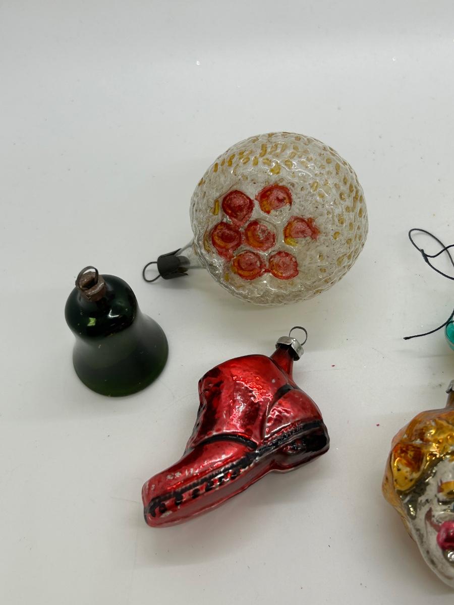 Mixed Lot of Small Blown Glass Holiday Christmas Ornaments Shoe Face Bell Tops. In good vintage condition. Some light wear but no damage.
