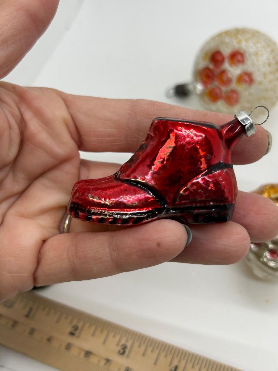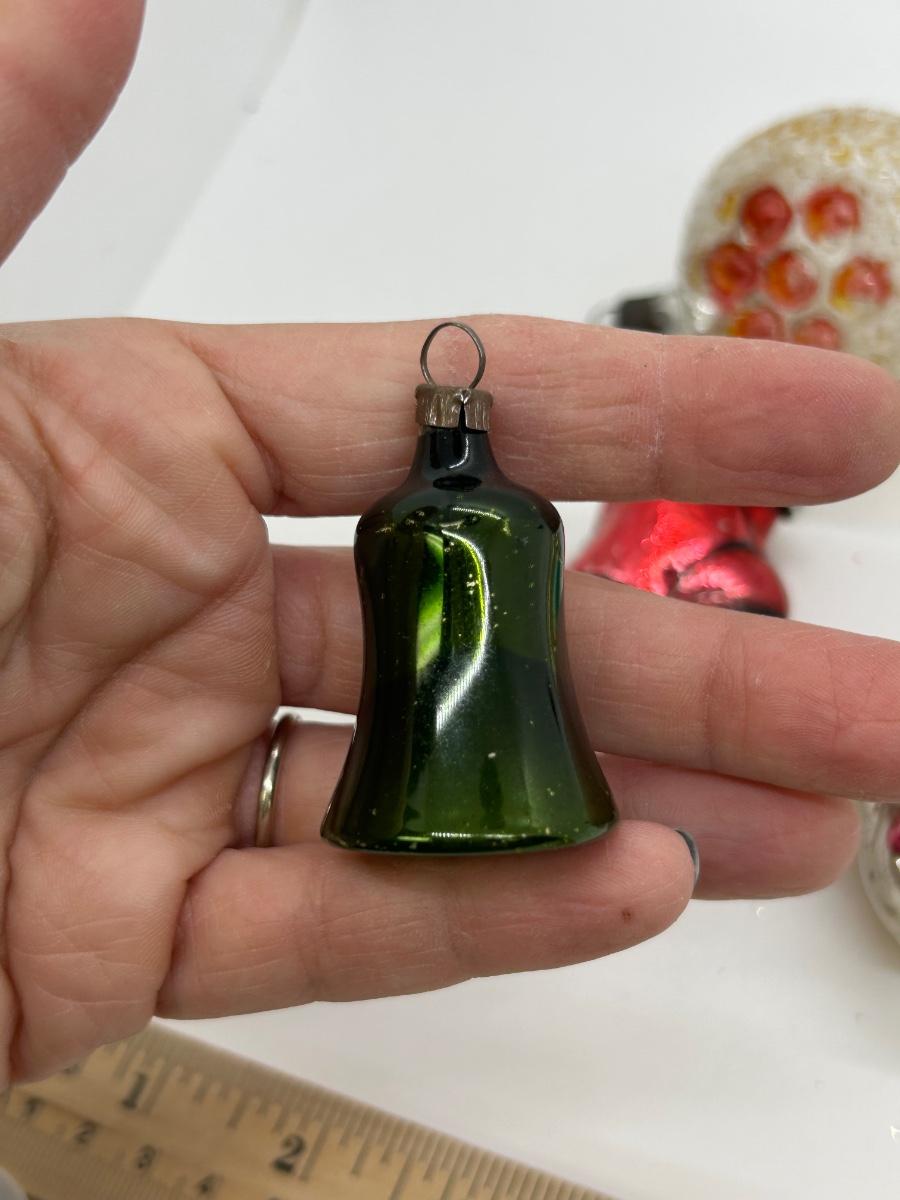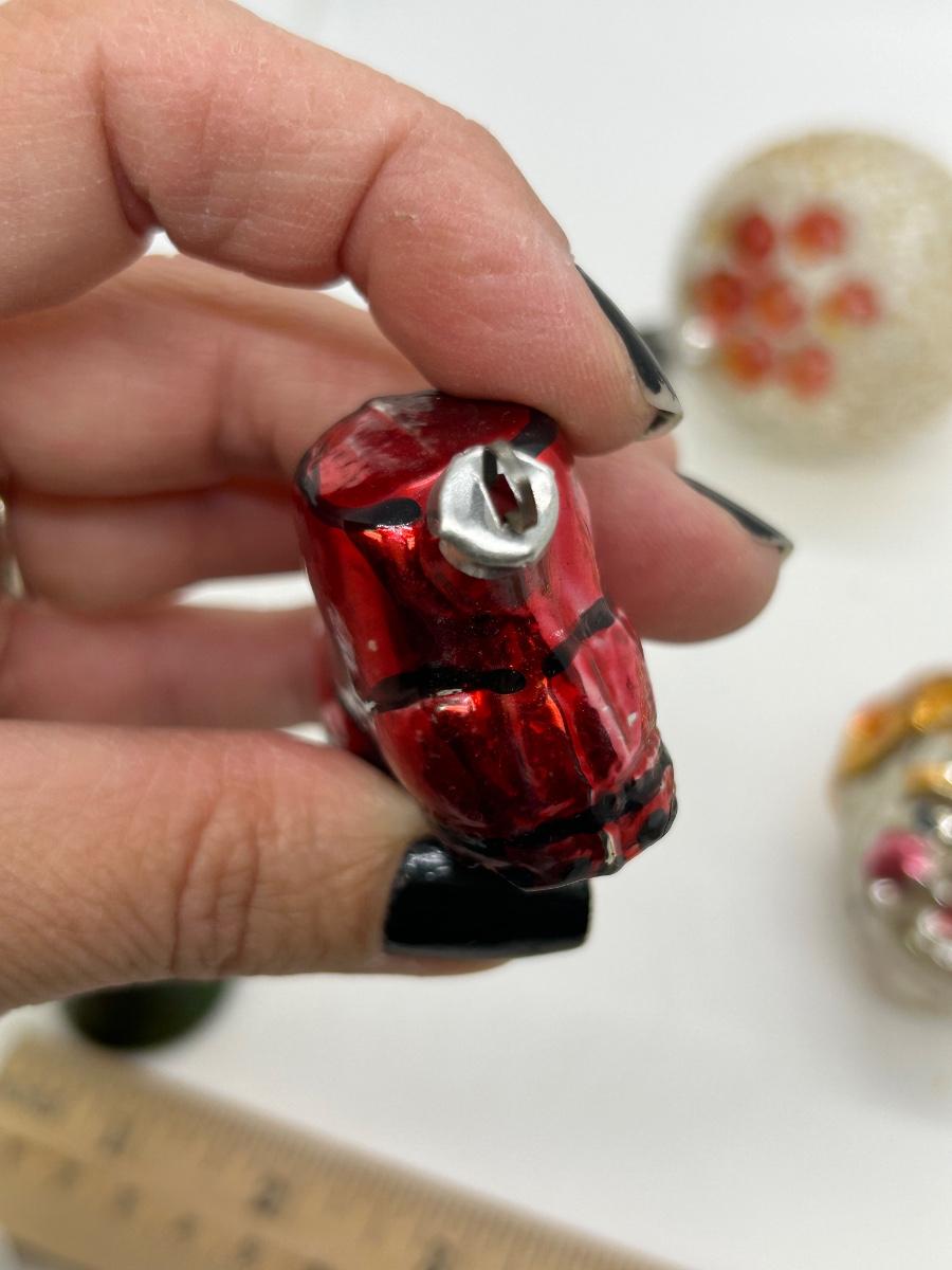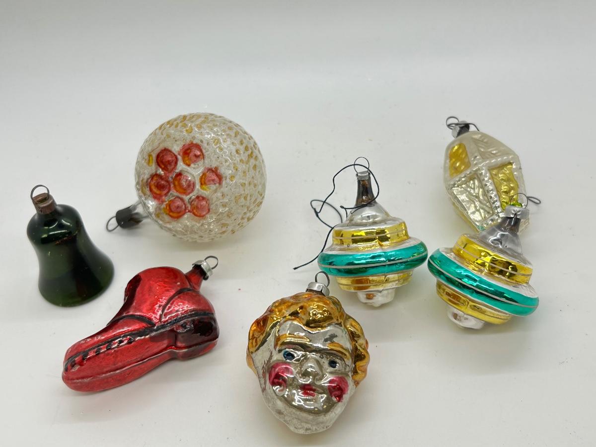 Mixed Lot of Small Blown Glass Holiday Christmas Ornaments Shoe Face Bell Tops. In good vintage condition. Some light wear but no damage.