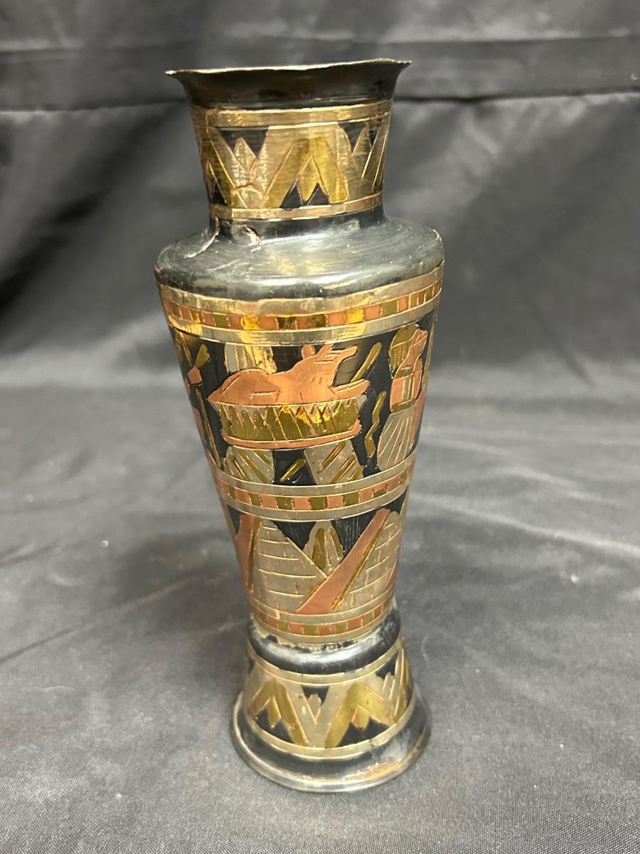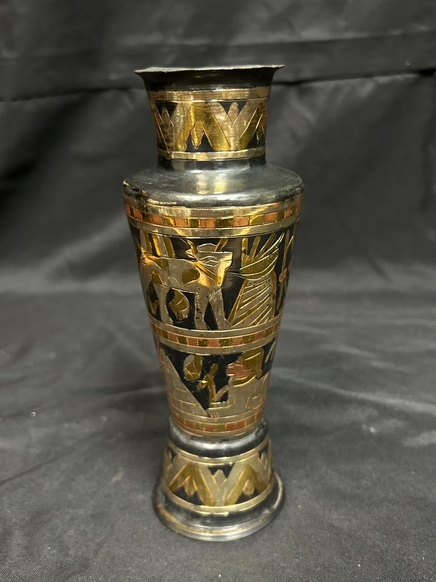Vintage Mixed Metals Egyptian Revival Vacation Souvenir Vase Urn. In fair condition. Some denting at the opening and it kind of sits crooked. About 8" size.