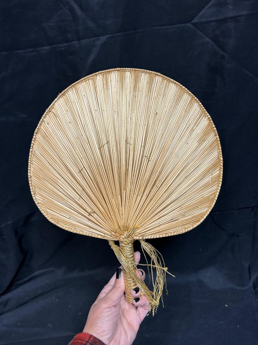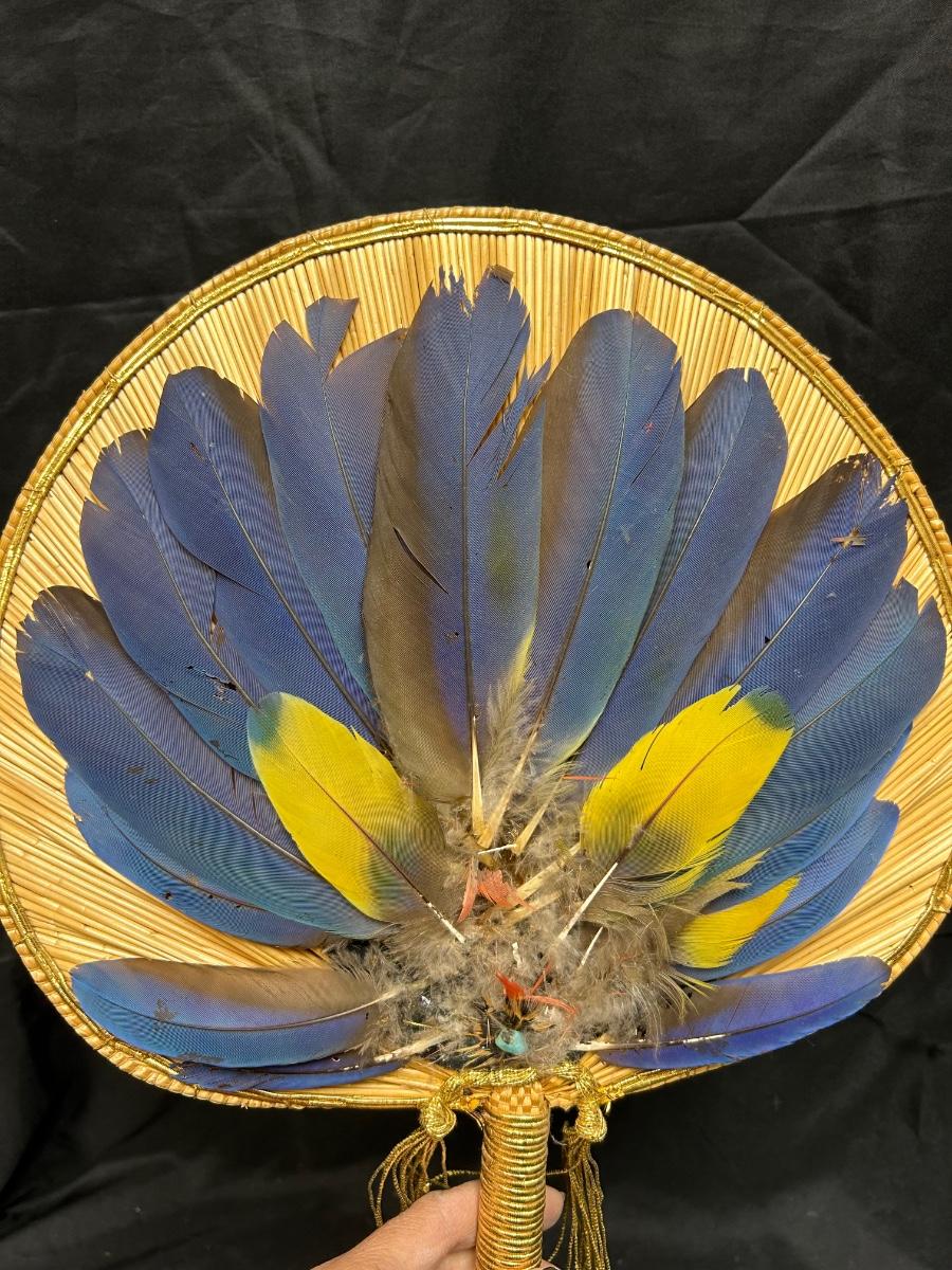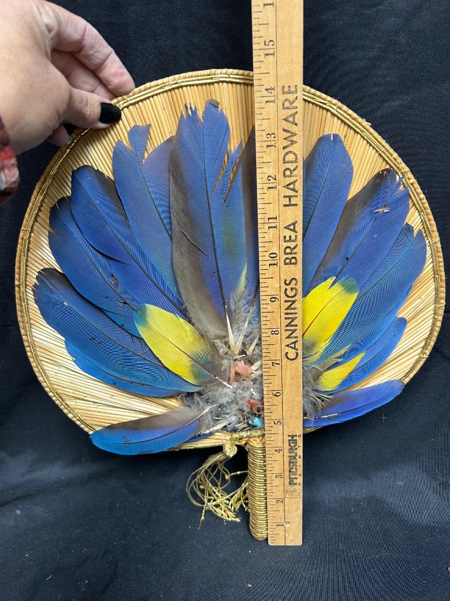 Vintage Retro Bamboo Reed Hand Fan with Blue & Gold Macaw Parrot Feathers Attached