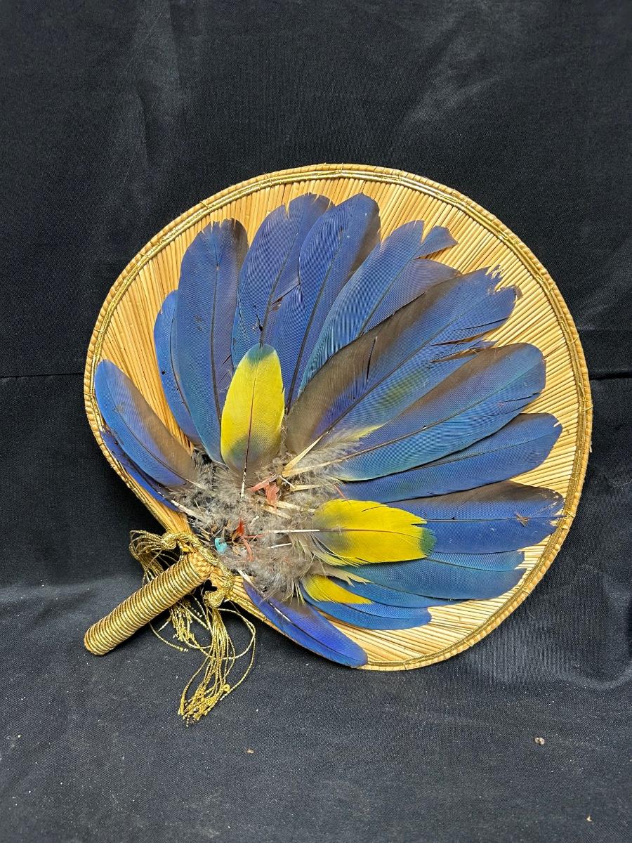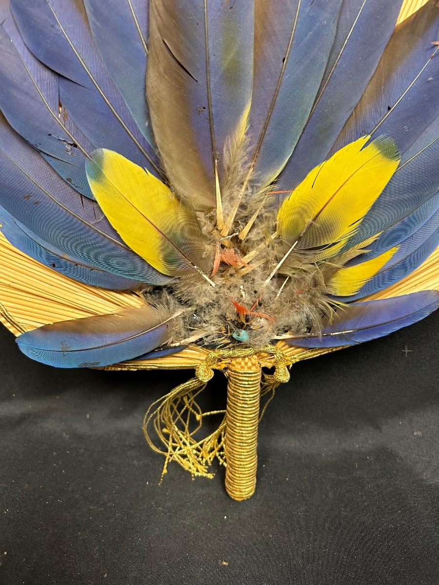 Vintage Retro Bamboo Reed Hand Fan with Blue & Gold Macaw Parrot Feathers Attached. Some wear to the feathers, might be missing something that covered the feather tips originally, looks incomplete.