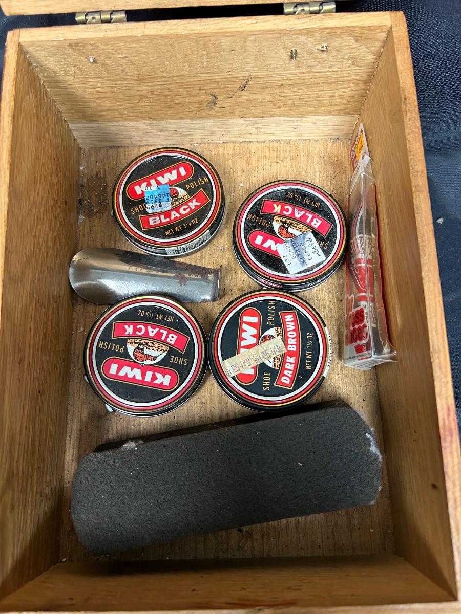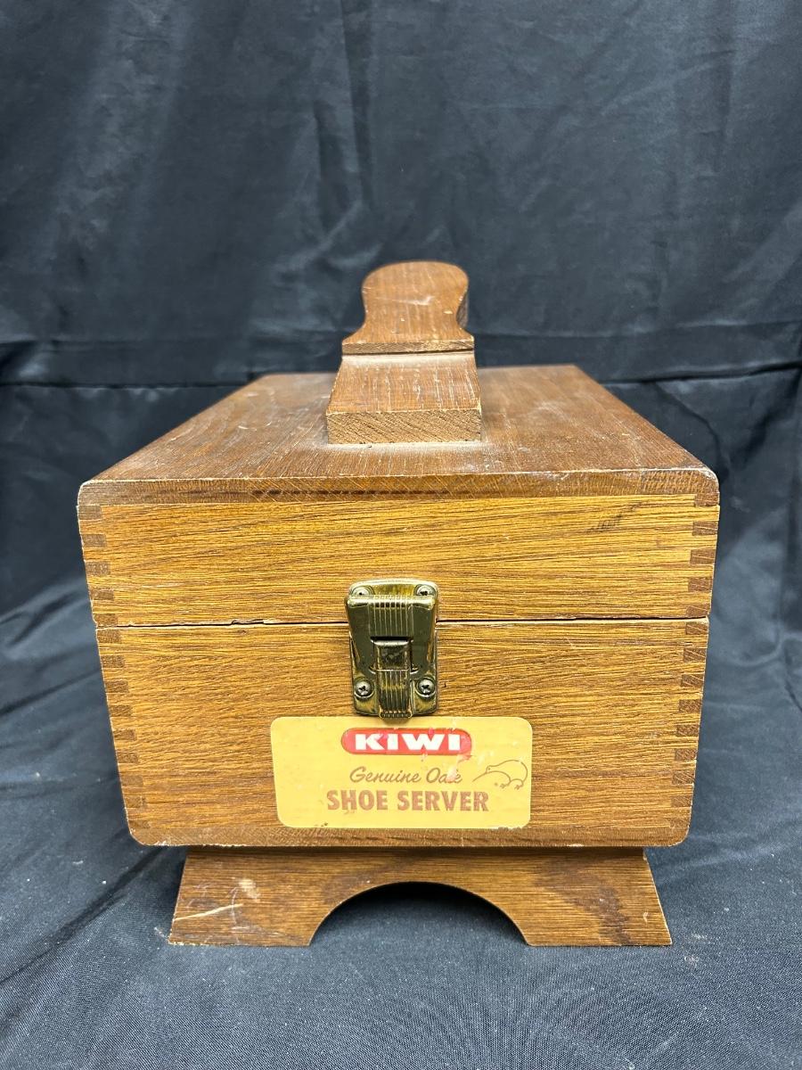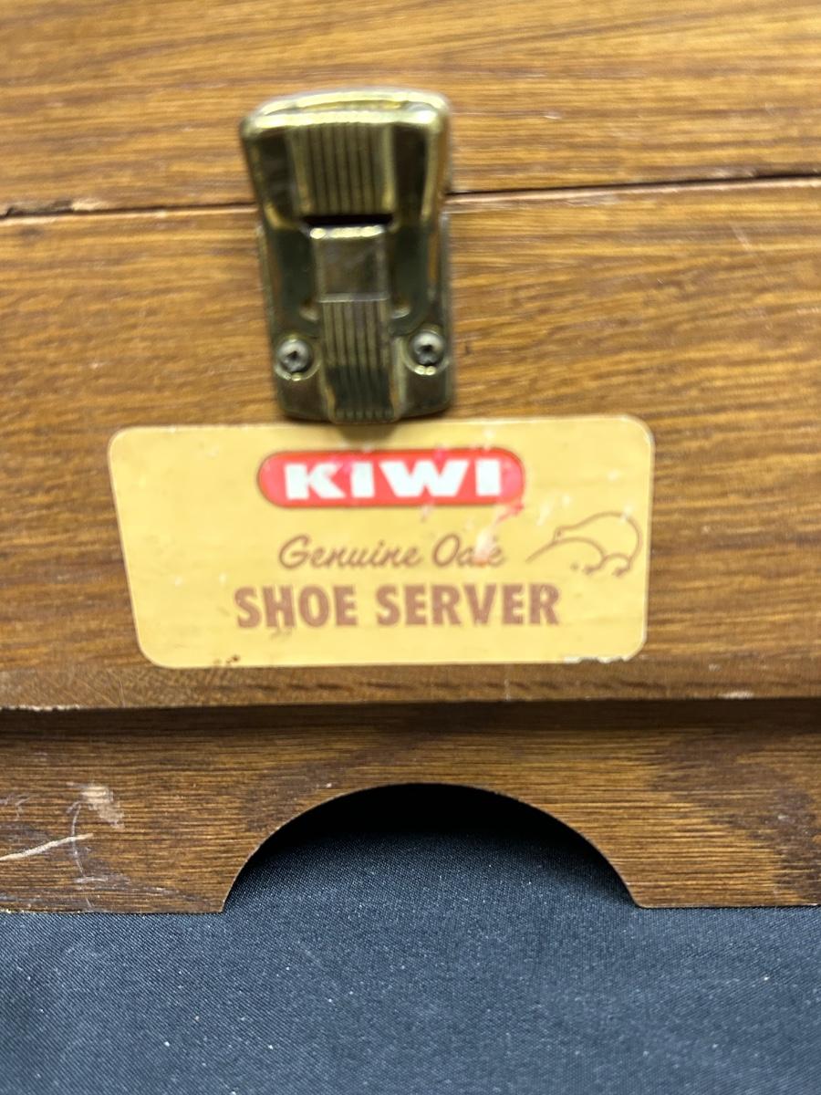 Vintage Kiwi Brand Genuine Oak Shoe Server Cleaning Shining Box. In vintage condition. Previously used, hinge is a little loose. Comes with polish and brush, unsure on quality from age.