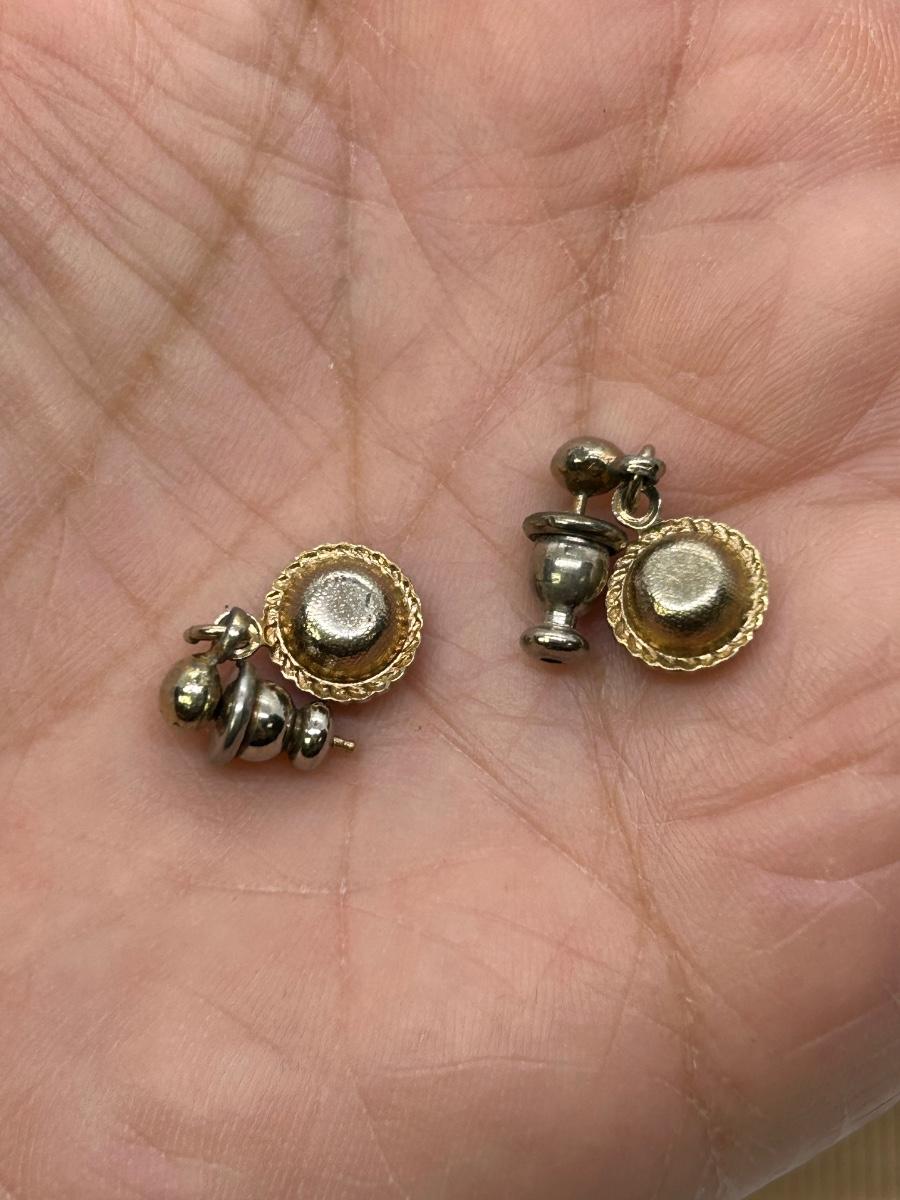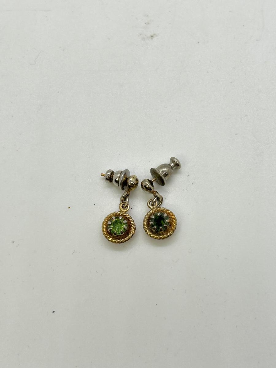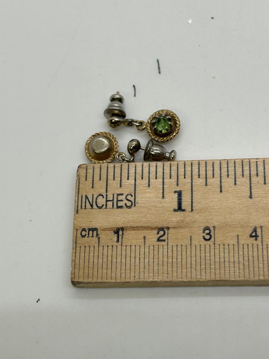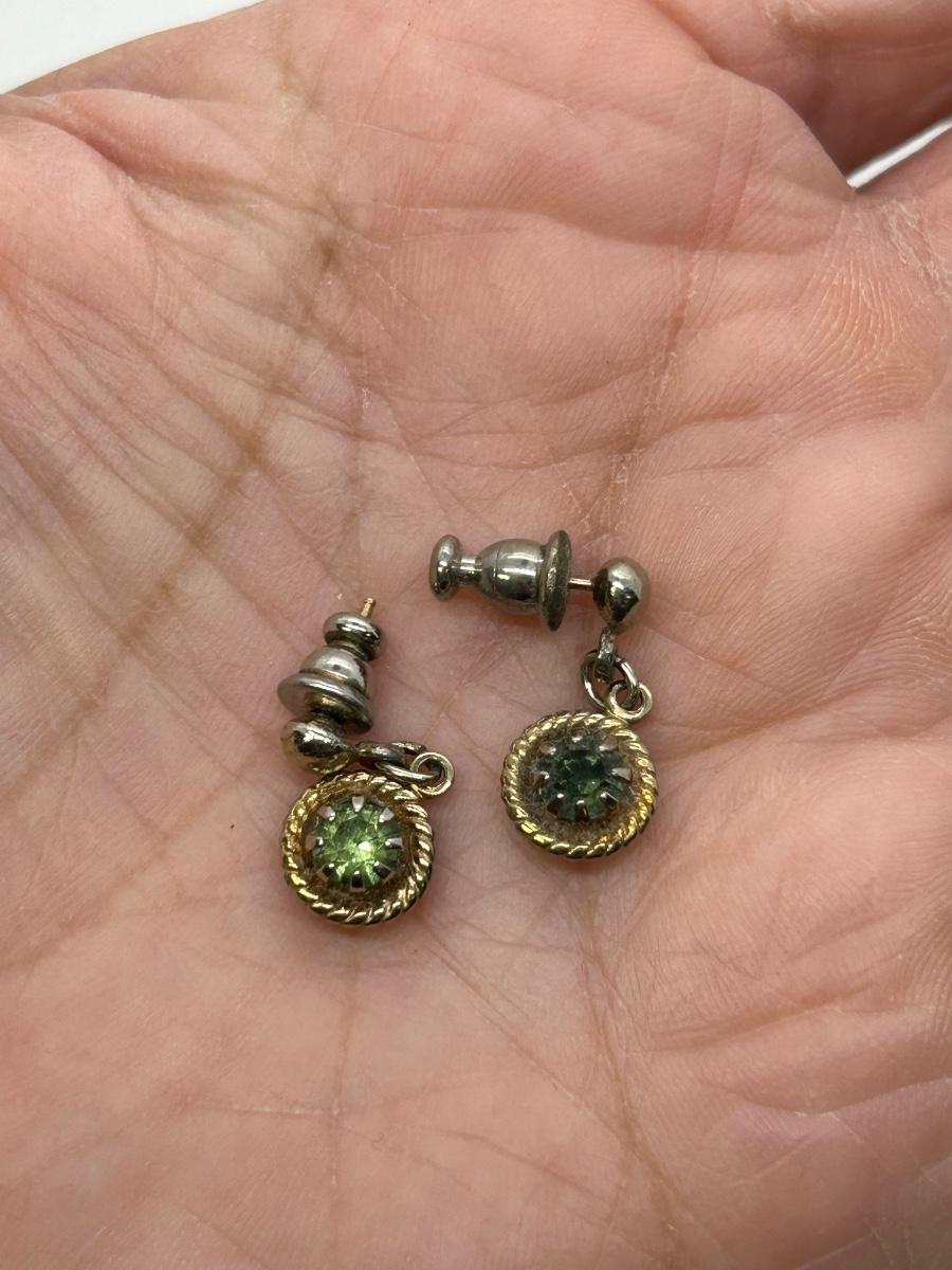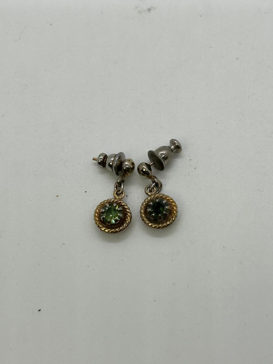 Pair of Gold Tone Medallion Dangle Earrings with Green Rhinestone Center for Pierced Ears. In good previously worn condition. About 1/2" drop length.