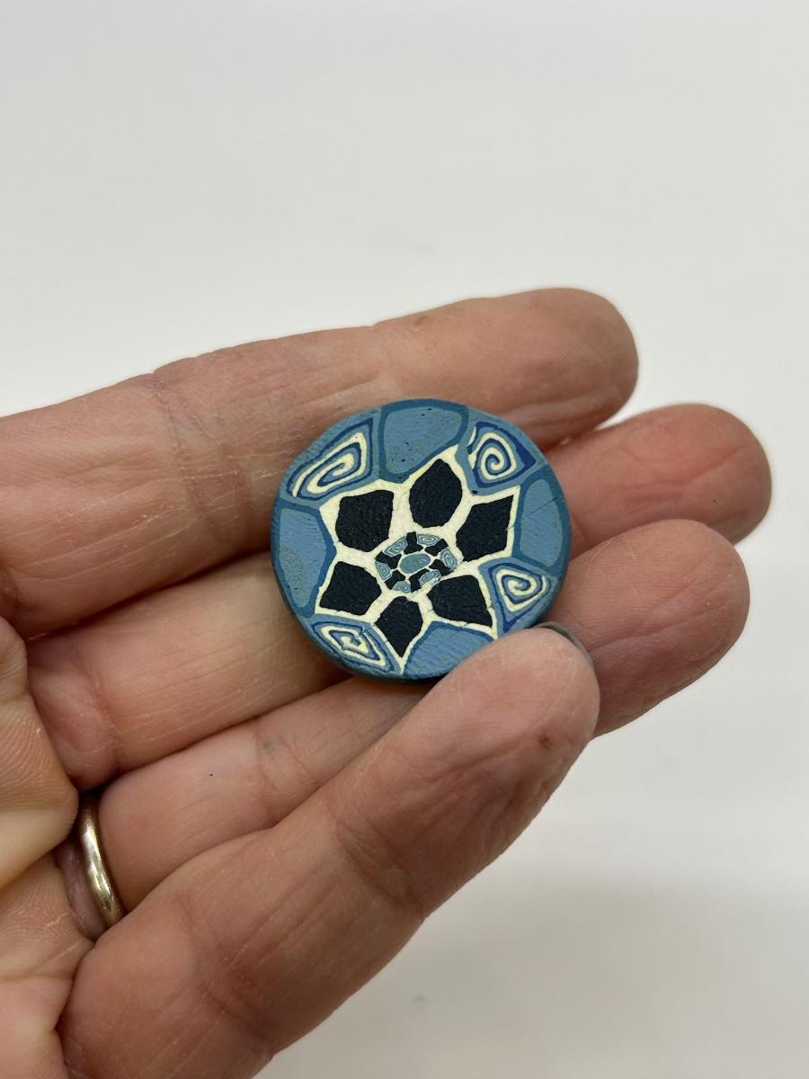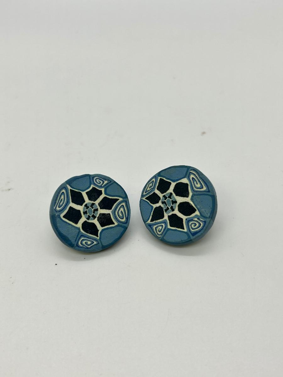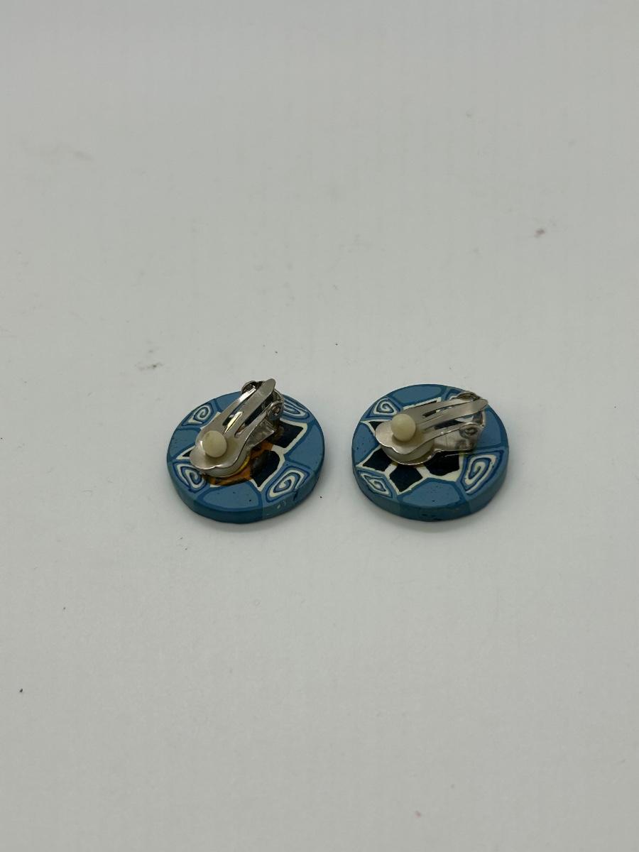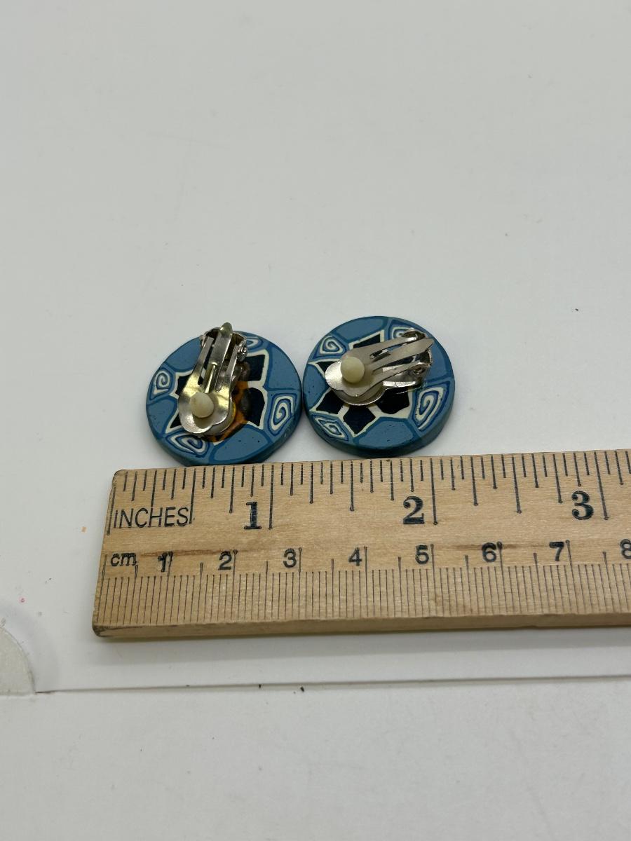 Pair of Funky Blue and White Clay Disc Clip Style Earrings. In good condition. About 1" size.