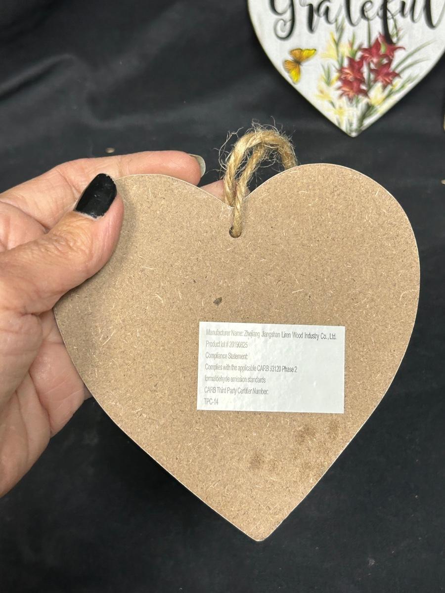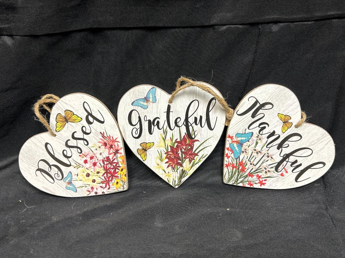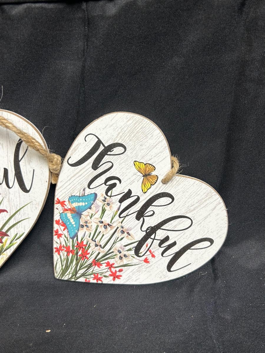 Butterfly and Flowers Heart Shaped Hanging Wall Plaques Blessed Grateful Thankful. In good condition. About 5" size.