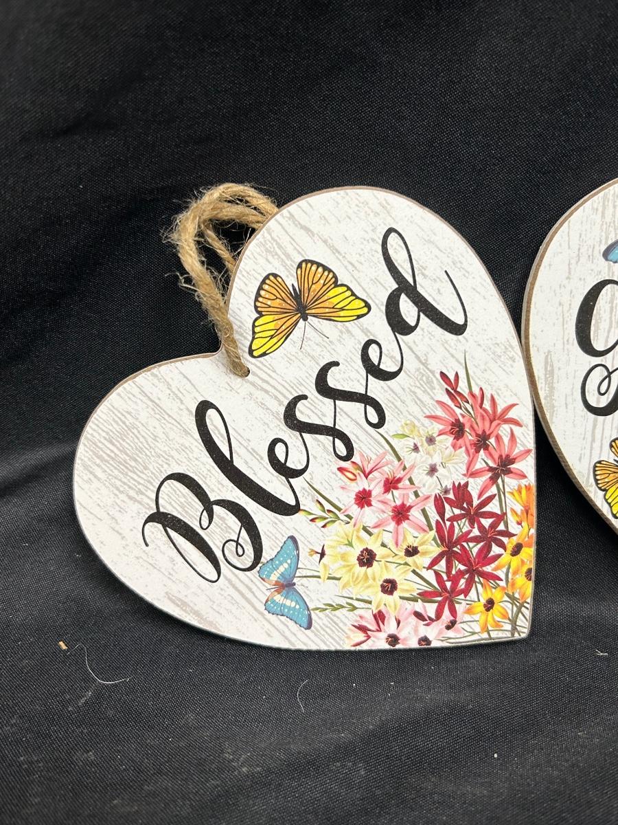 Butterfly and Flowers Heart Shaped Hanging Wall Plaques Blessed Grateful Thankful