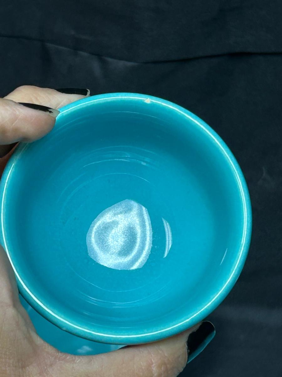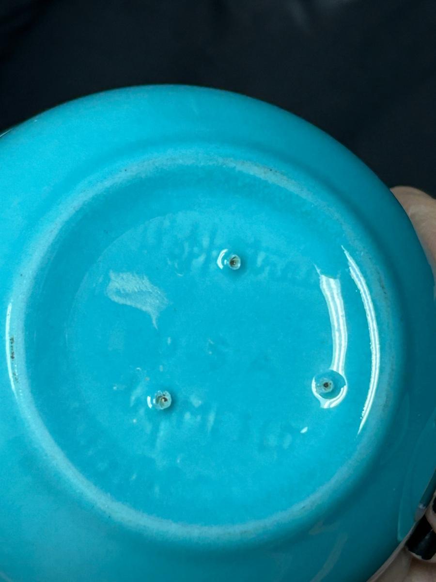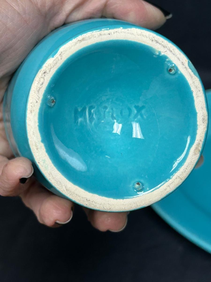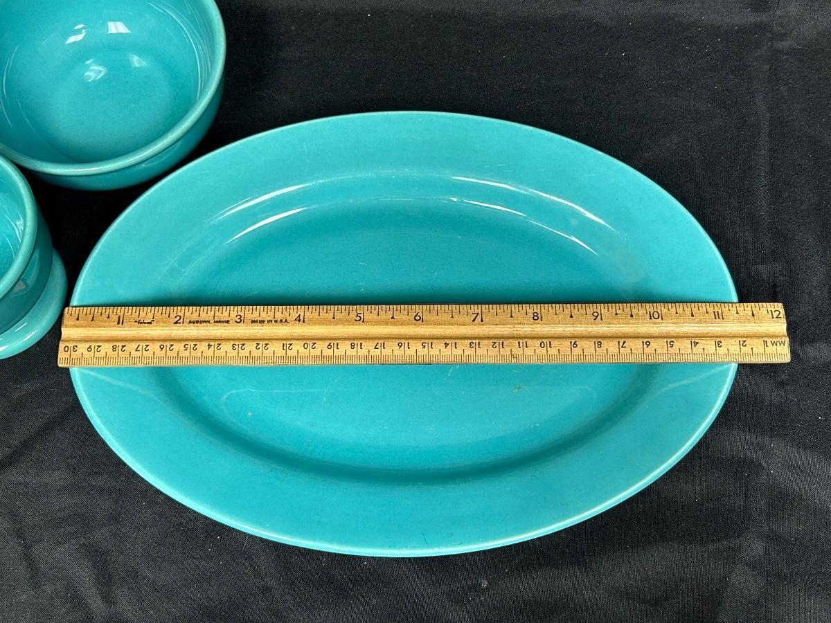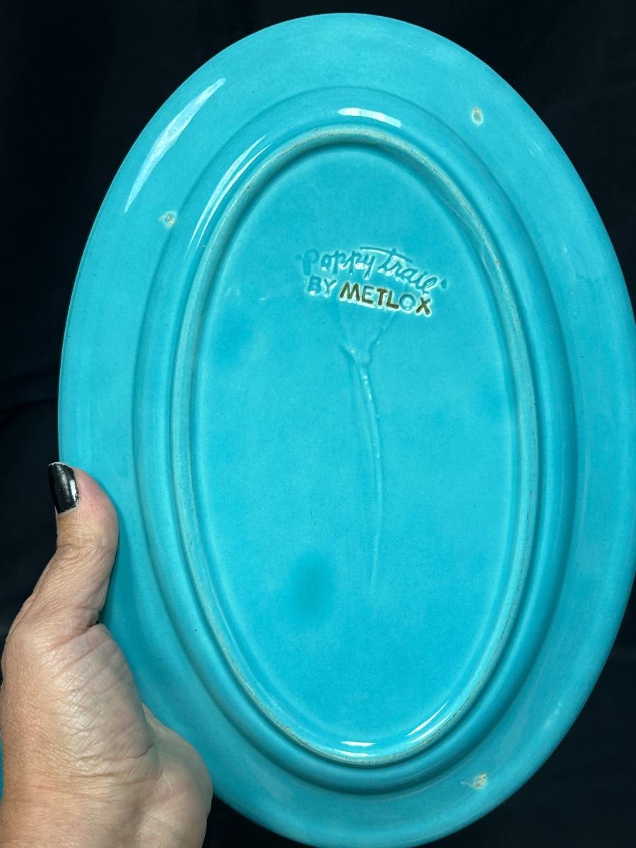 Vintage Metlox Poppy Trail Turquoise Blue Oval Platter with Small Bowl Footed Dish California Pottery. In good condition. The small cereal bowl does have a tiny chip in edge. No other damage noticed.