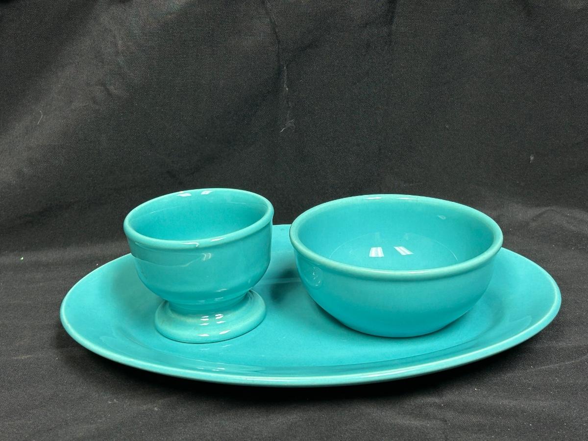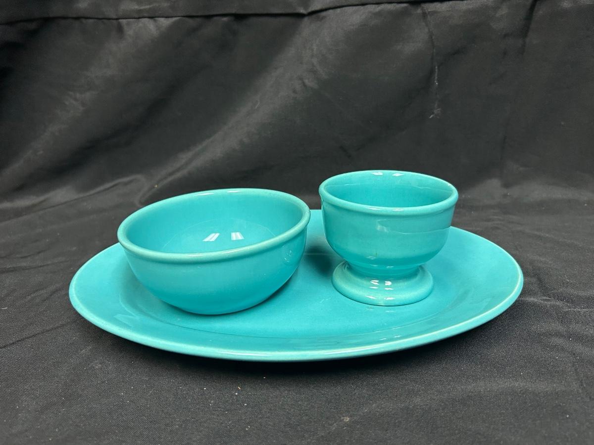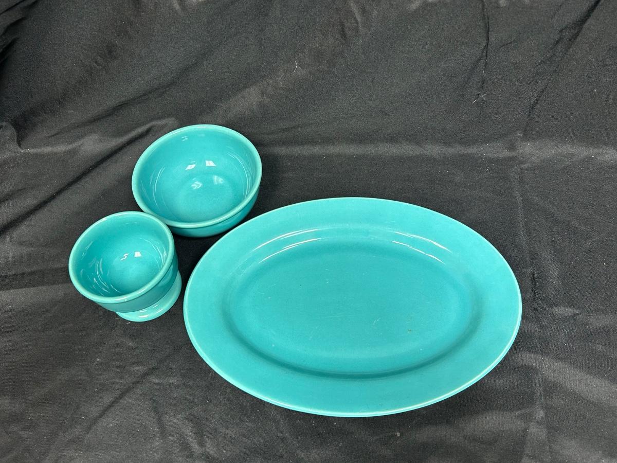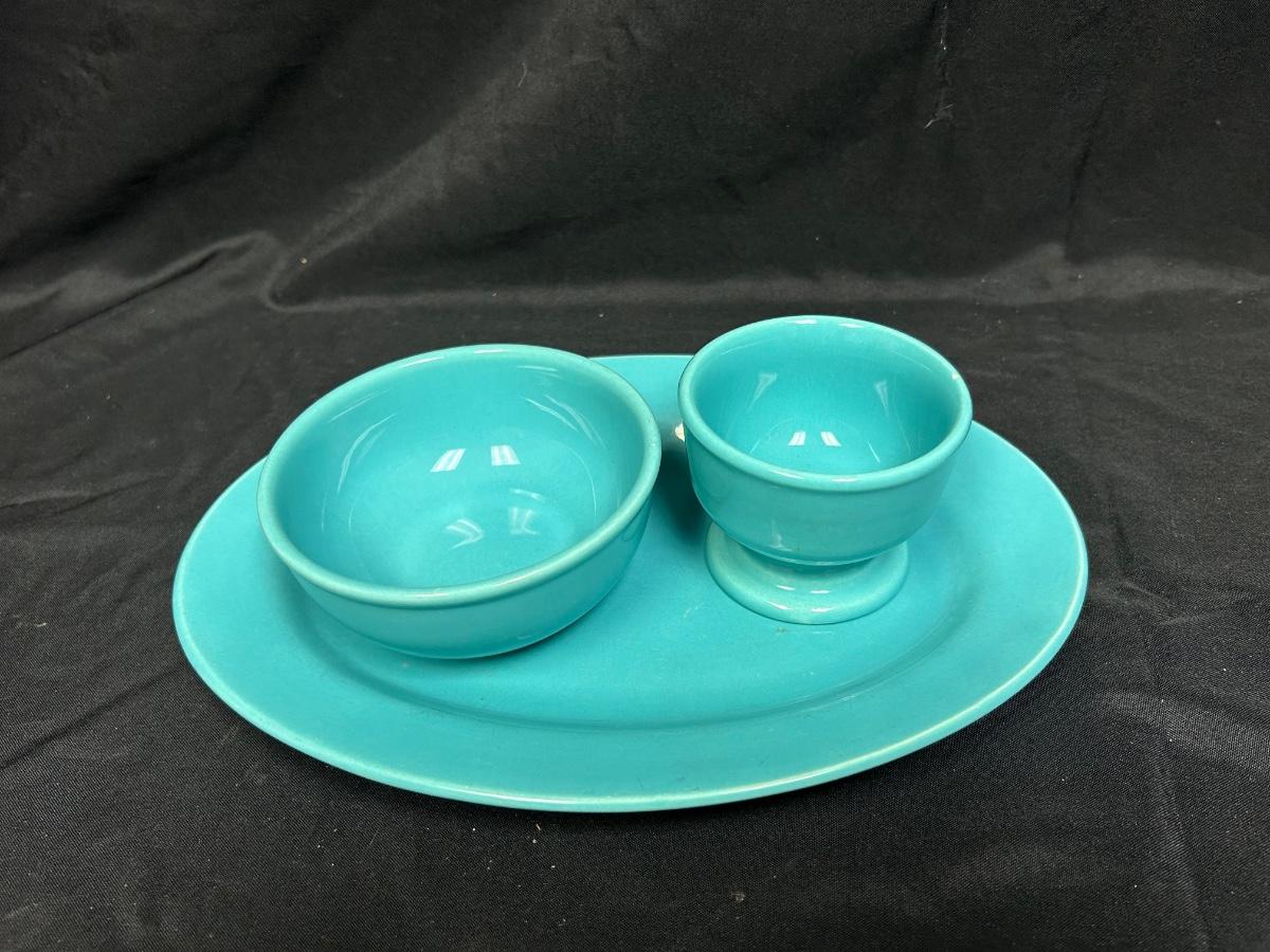 Vintage Metlox Poppy Trail Turquoise Blue Oval Platter with Small Bowl Footed Dish California Pottery
