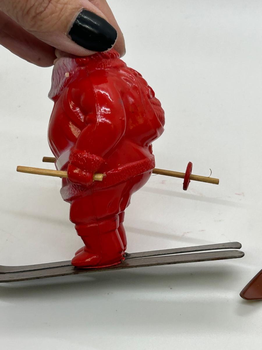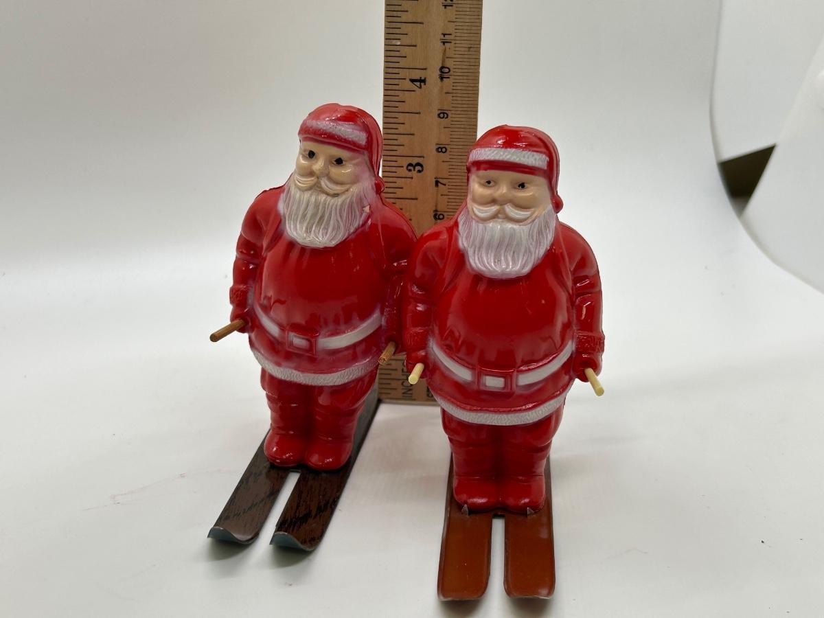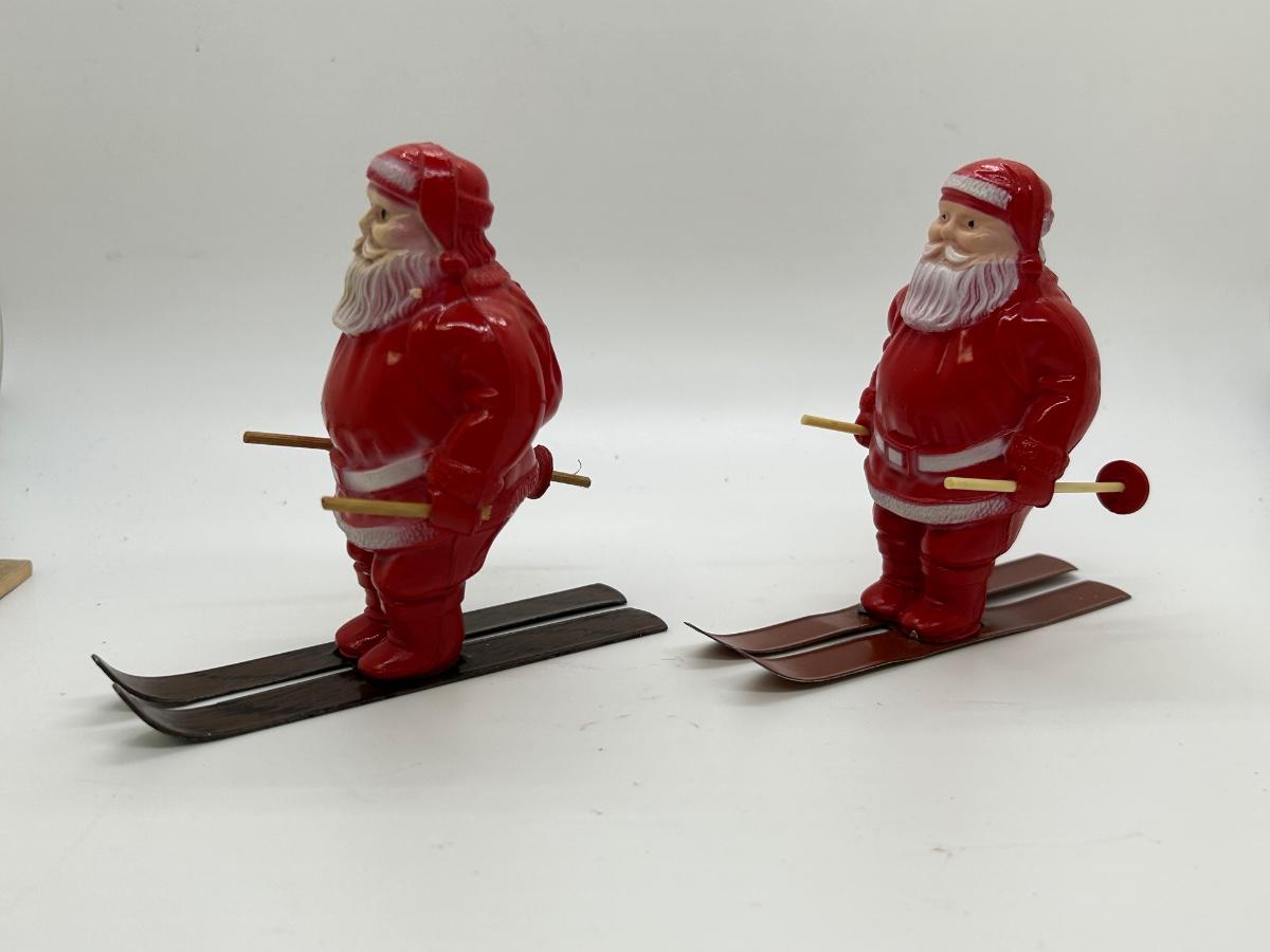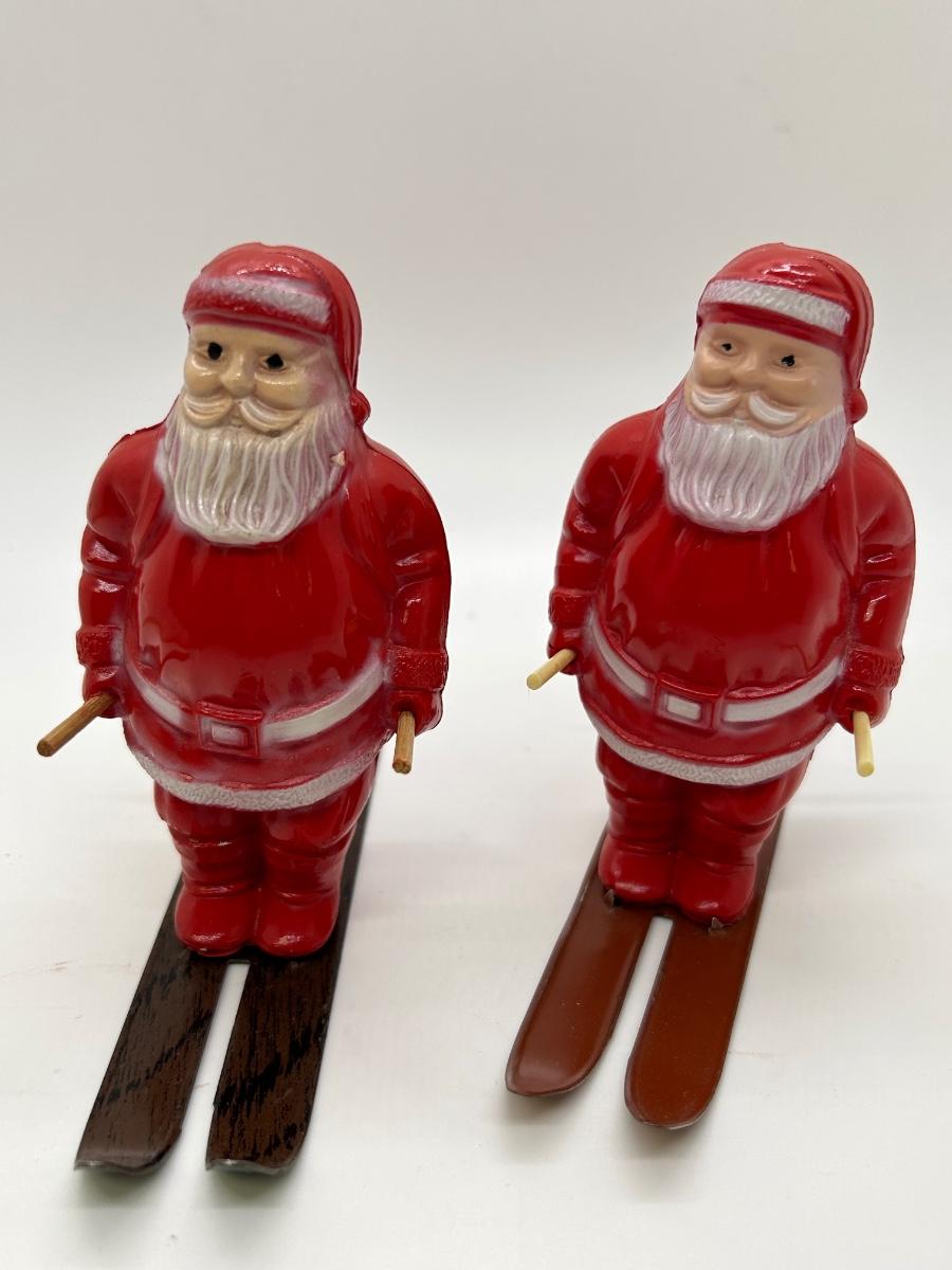 Pair of Vintage Irwin Celluloid Santa Claus on Skis Christmas Holiday Decor Figurines