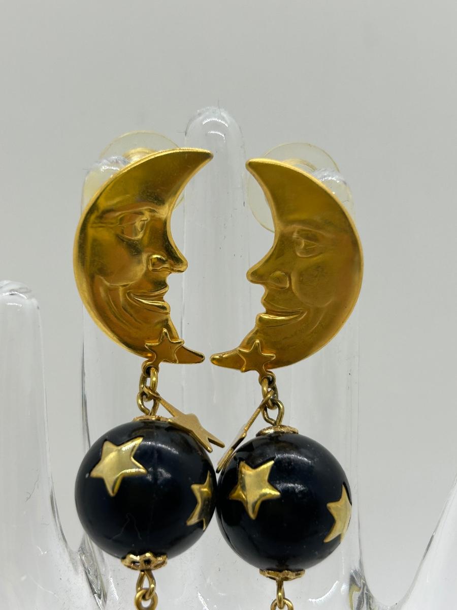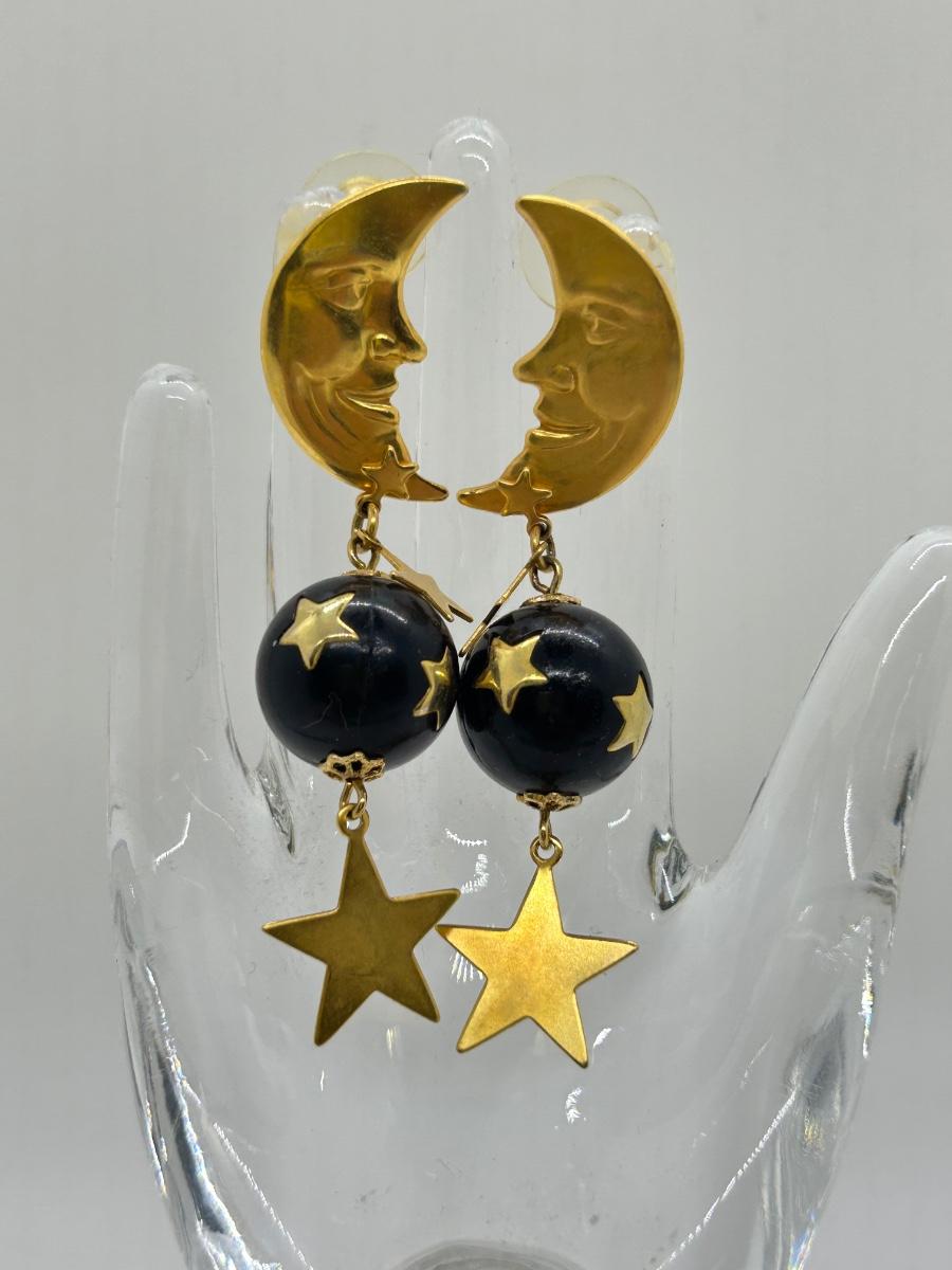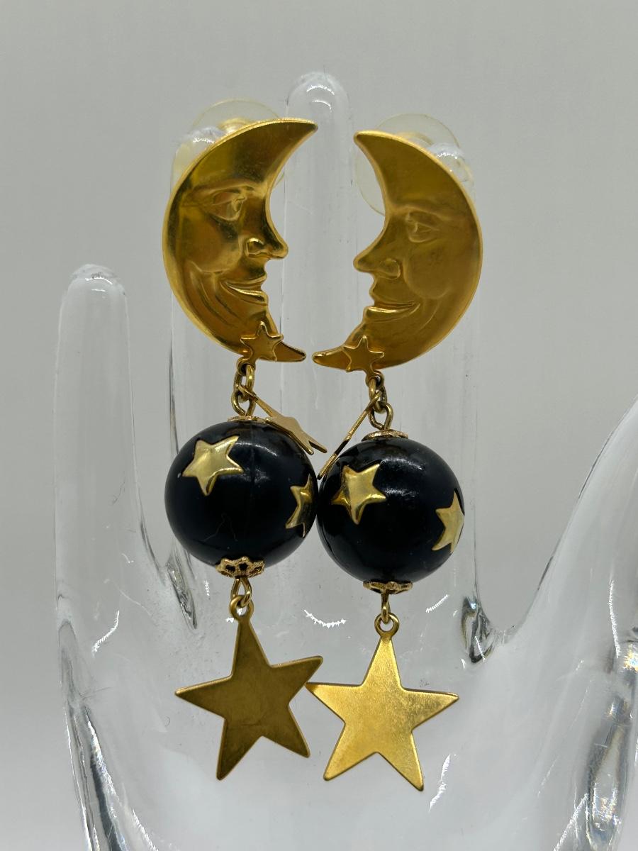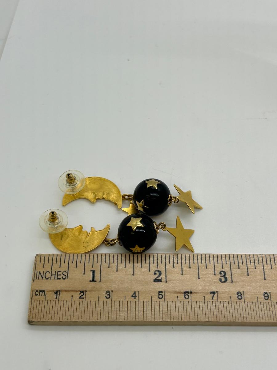 Crescent Moon and Stars Gold Tone Dangling Earrings for Pierced Ears. In good condition.