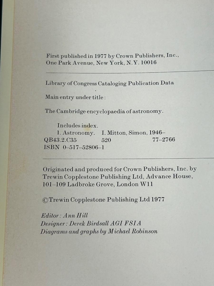 The Cambridge Encyclopedia of Astronomy Coffee Table Style Reference Book. In good condition. Some light wear to the dust jacket. Copyright 1977.