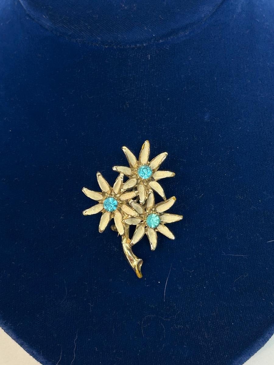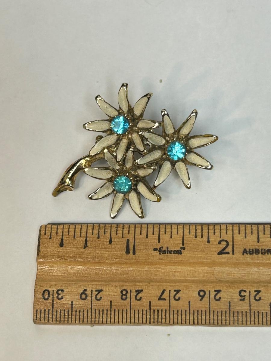 Vintage Gold Tone Flower Pin Enameled Petals with Bright Blue Rhinestone Center. In good vintage condition. Under 2" size.
