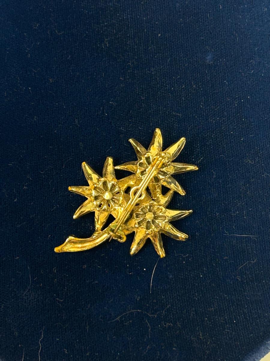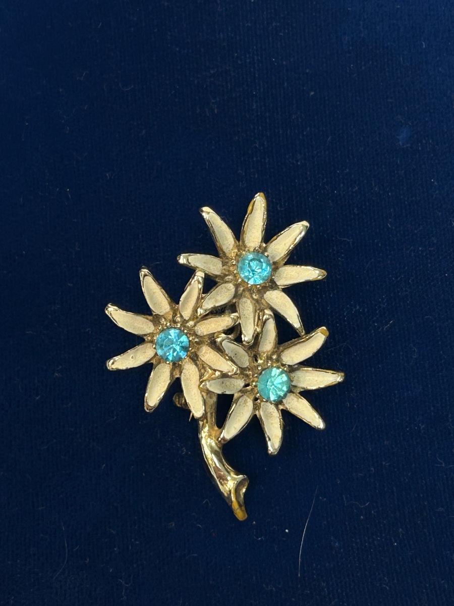 Vintage Gold Tone Flower Pin Enameled Petals with Bright Blue Rhinestone Center