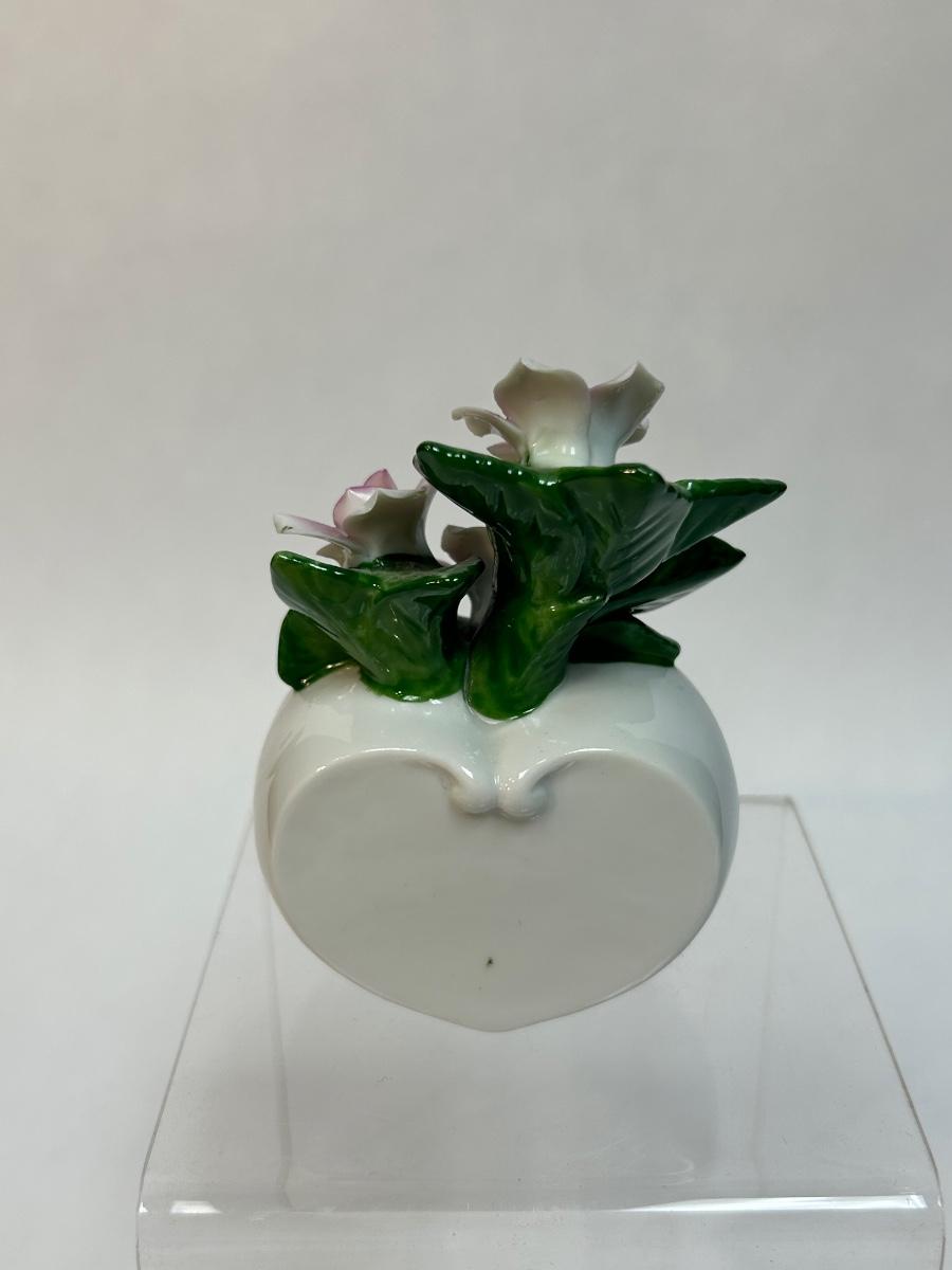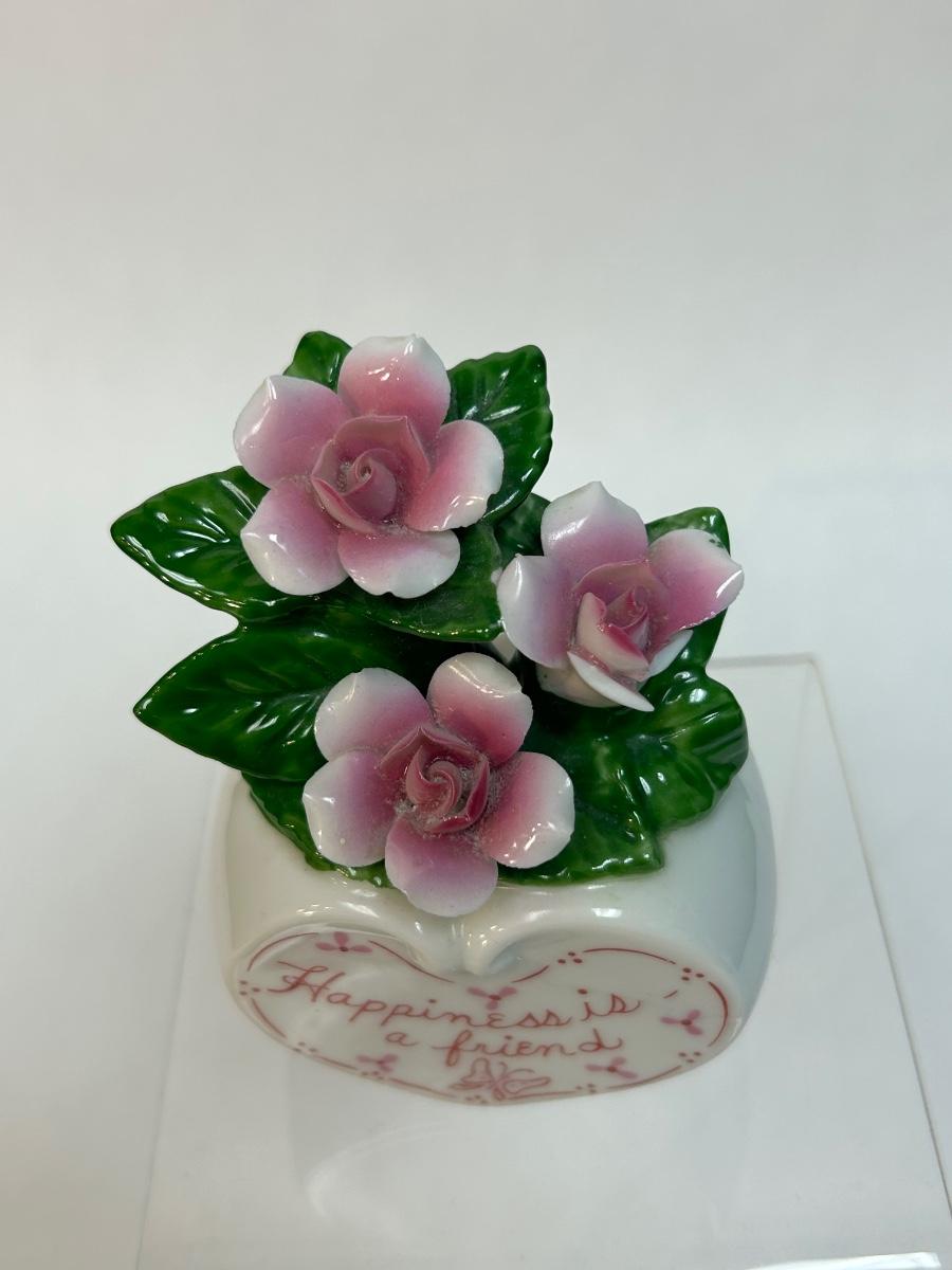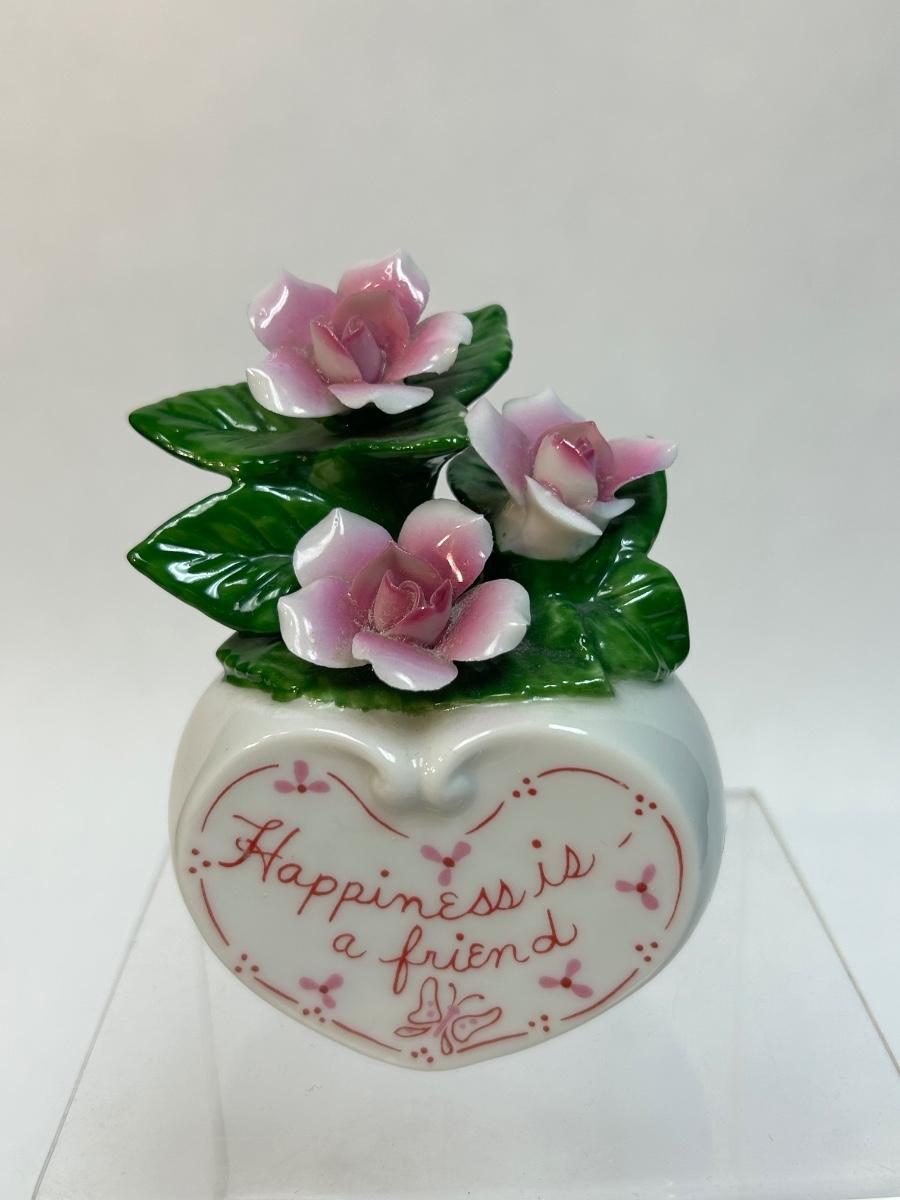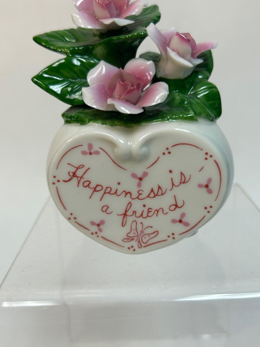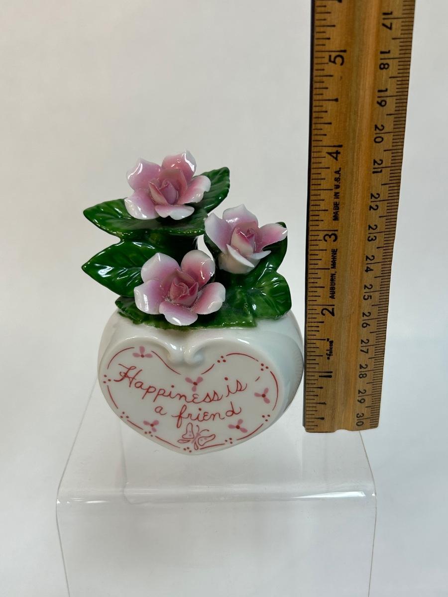 Happiness is a Friend Ceramic Porcelain Heart with Flowers Figurine. In vintage condition. One of the flowers has a missing petal but does display nice. About 4" size.