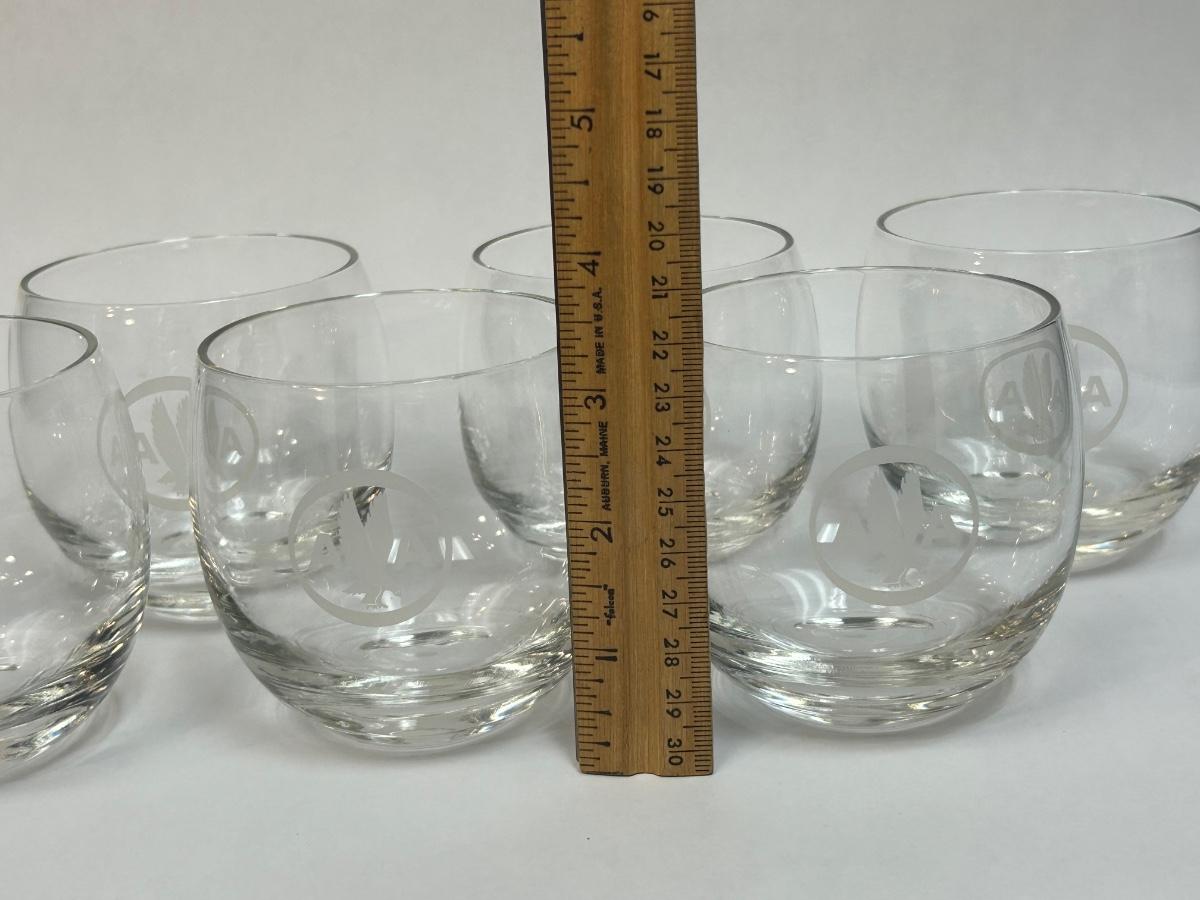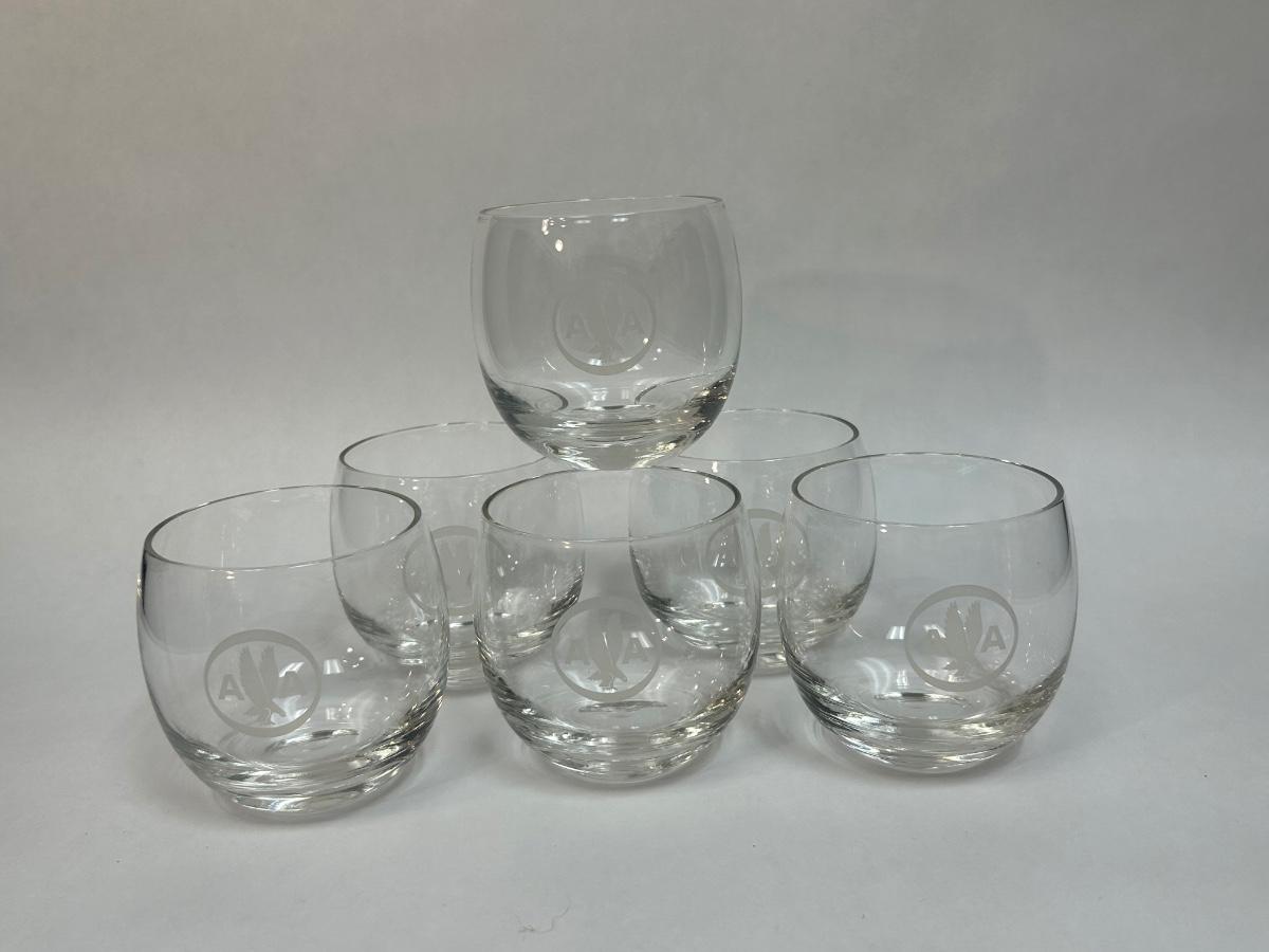 Set of Six Vintage American Airlines Roly Poly Cocktail Drink Glasses. Clear glass with frosted American Airlines eagle logo. In good condition. No chips.