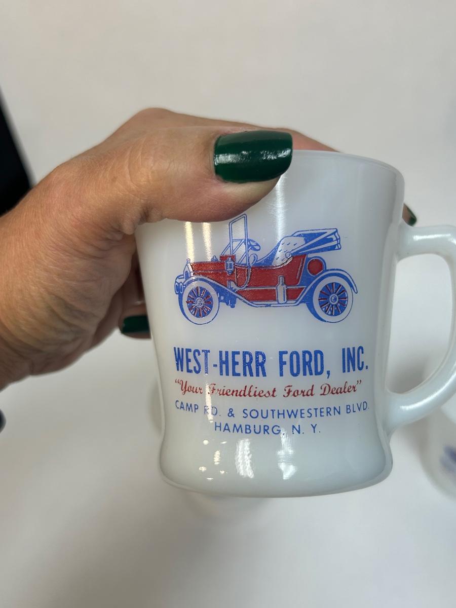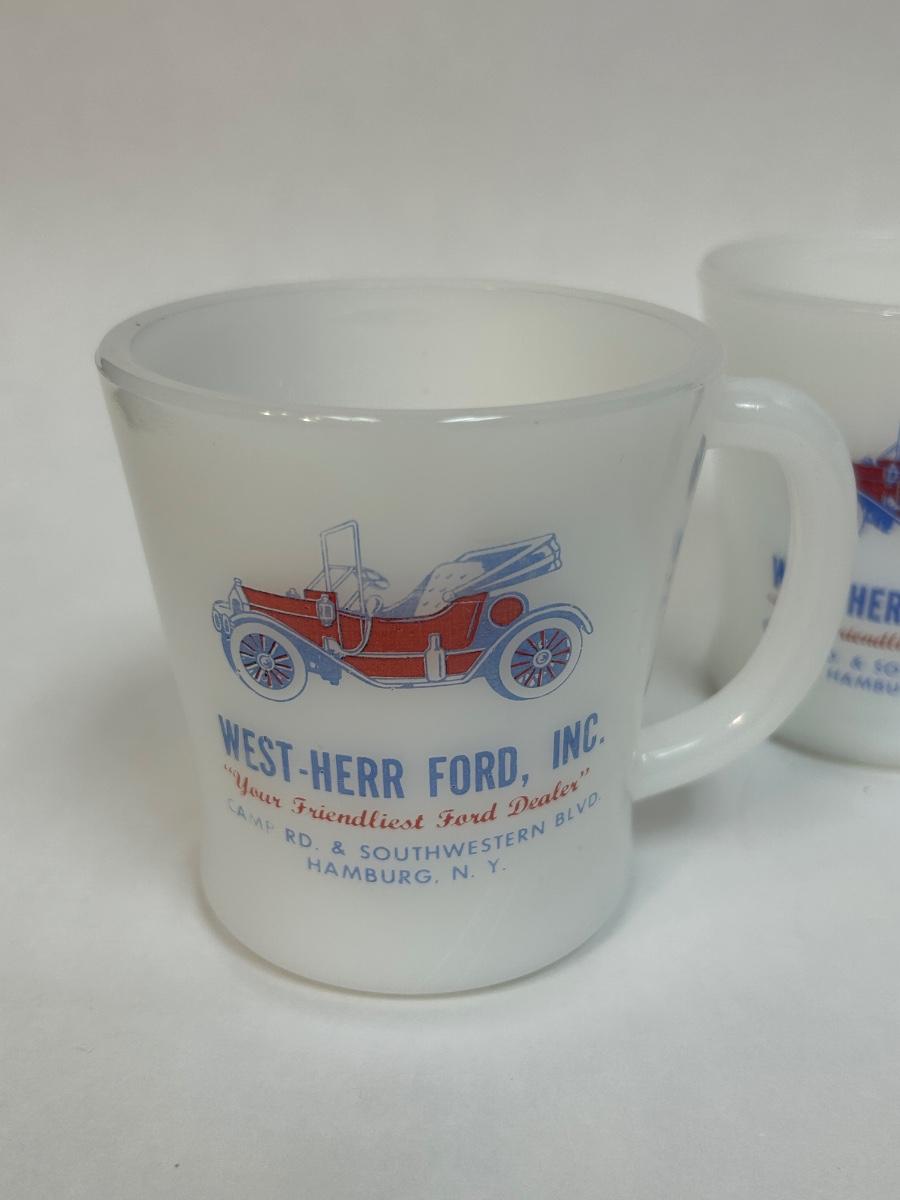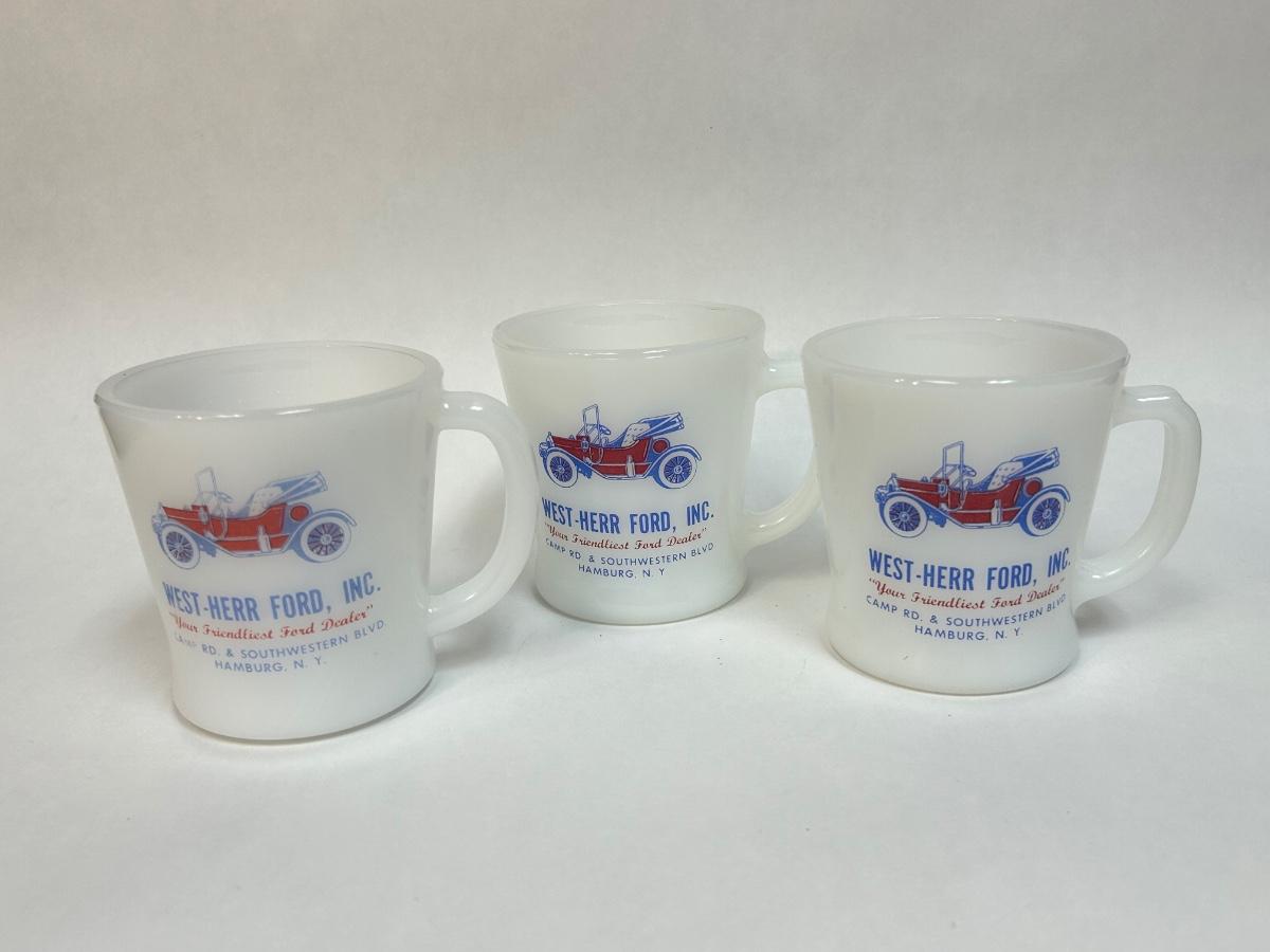 Set of Three West-Herr Ford Dealership Logo Milk Glass Coffee Cups. In good vintage condition. Light wear to logo but no chips.