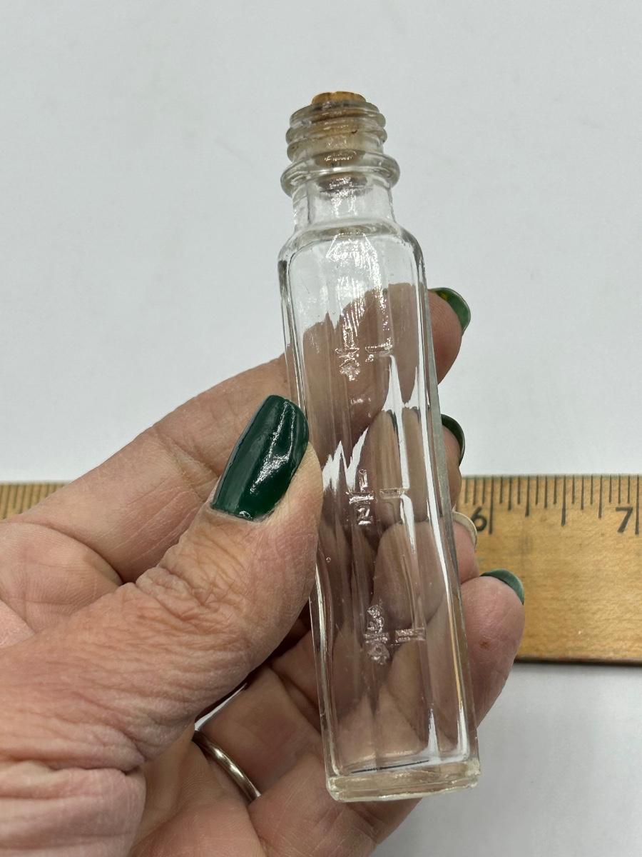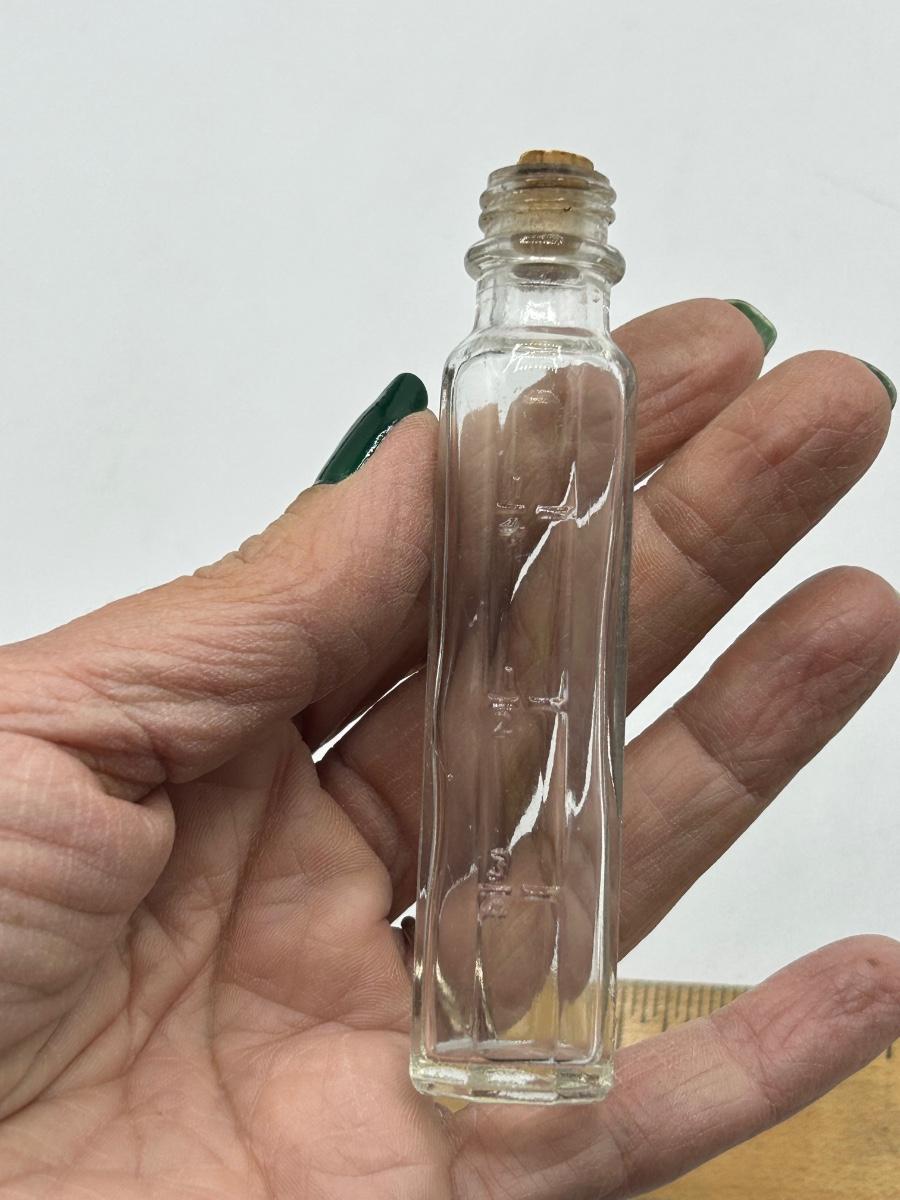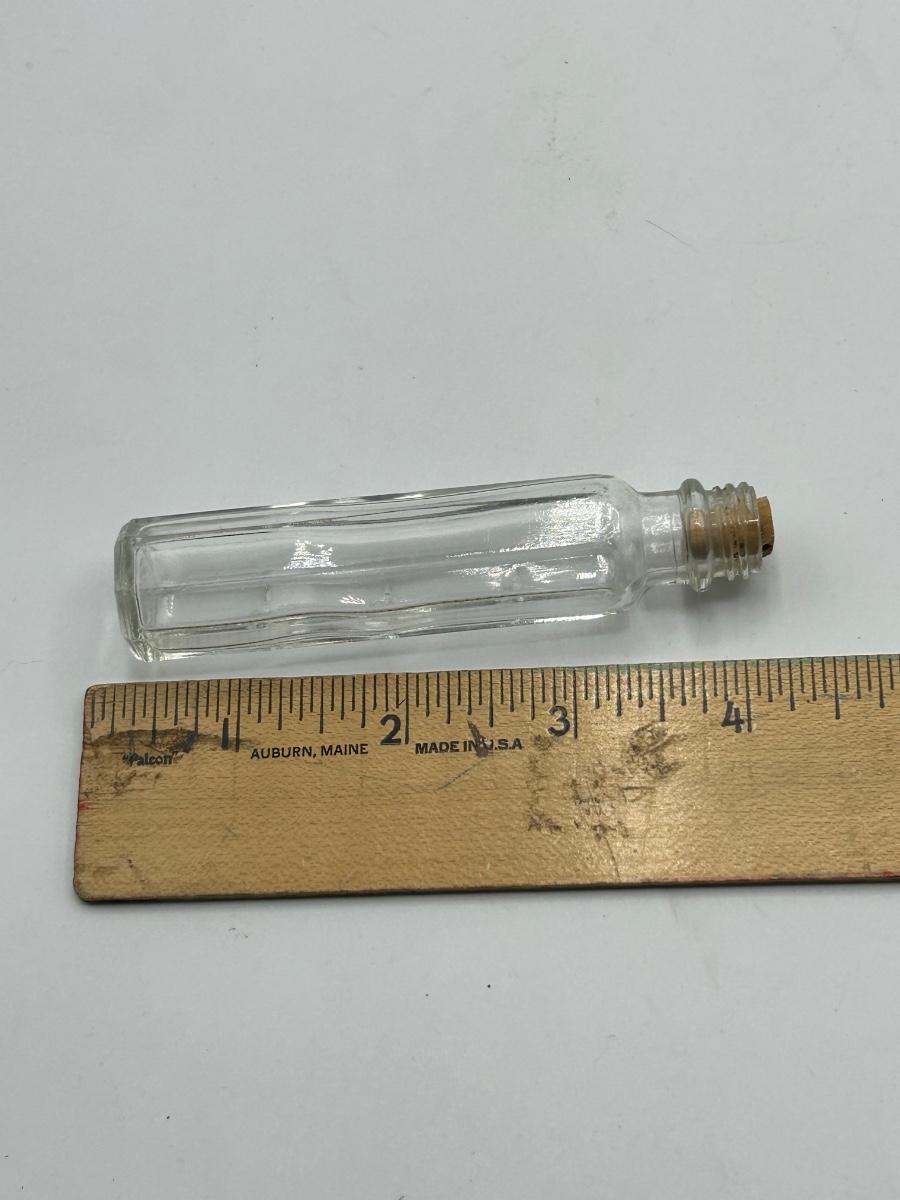 Vintage Ribbed Clear Glass Vile Bottle with Measurement Marks and Cork Stopper. In good condition. 4" size.